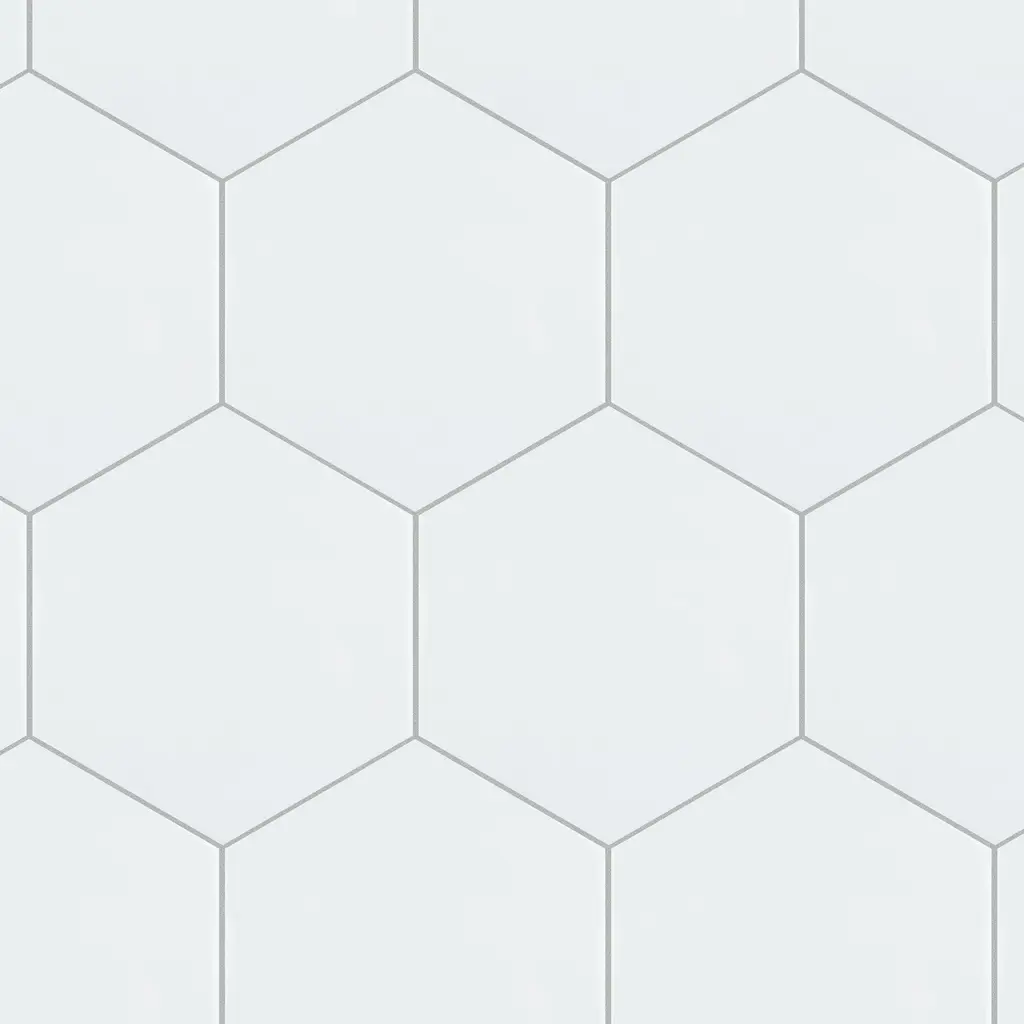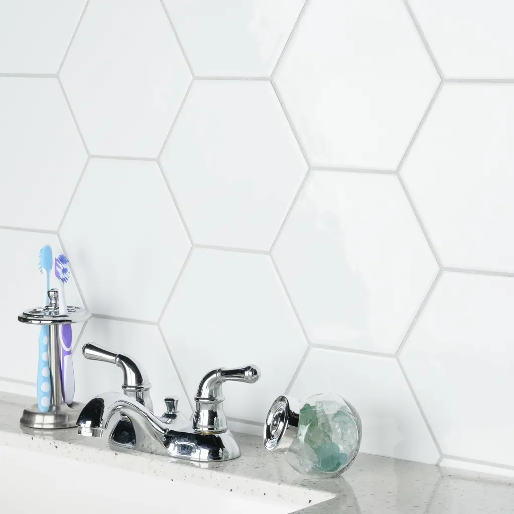 Our Hexatile Glossy Blanco Porcelain Wall Tile features a smooth, glossy finish. This crisp white hexagon shaped tile is perfect for any setting, traditional enough for historical renovations or modern enough for new construction. Its frost-resistant features make this an ideal choice for indoor and outdoor installations including, backsplashes, fireplace facades and patios. This tile may be used on its own or coordinated with other products in our Hexatile Collection for a custom look. Tile is the better choice for your space. This tile is made from natural ingredients, making it a healthy choice as it is free from allergens, VOCs, formaldehyde and PVC. 7.5 square feet, 25 pieces per case. Case weight is 28.99 lbs. Grade 1, first-quality porcelain tile for wall use 7 in. width x 8 in. length x 0.37 in. thick Glazed, smooth finish with a high sheen and uniform appearance in tone PEI Rating 0 is suitable for wall use only Impervious tiles have a water absorption of less than 0.5% for indoor and outdoor use and are frost resistant DCOF value is not available for this product. Please reference the PEI and MOHS rating for installation. Completely frost resistant for indoor or outdoor applications; use a latex-modified thinset for acceptable bond strength Please note: A sample of this product may be a partial piece cut from the full size tile in order to provide an affordable and convenient way for customers to judge the quality and finish of this item. Samples are not returnable.