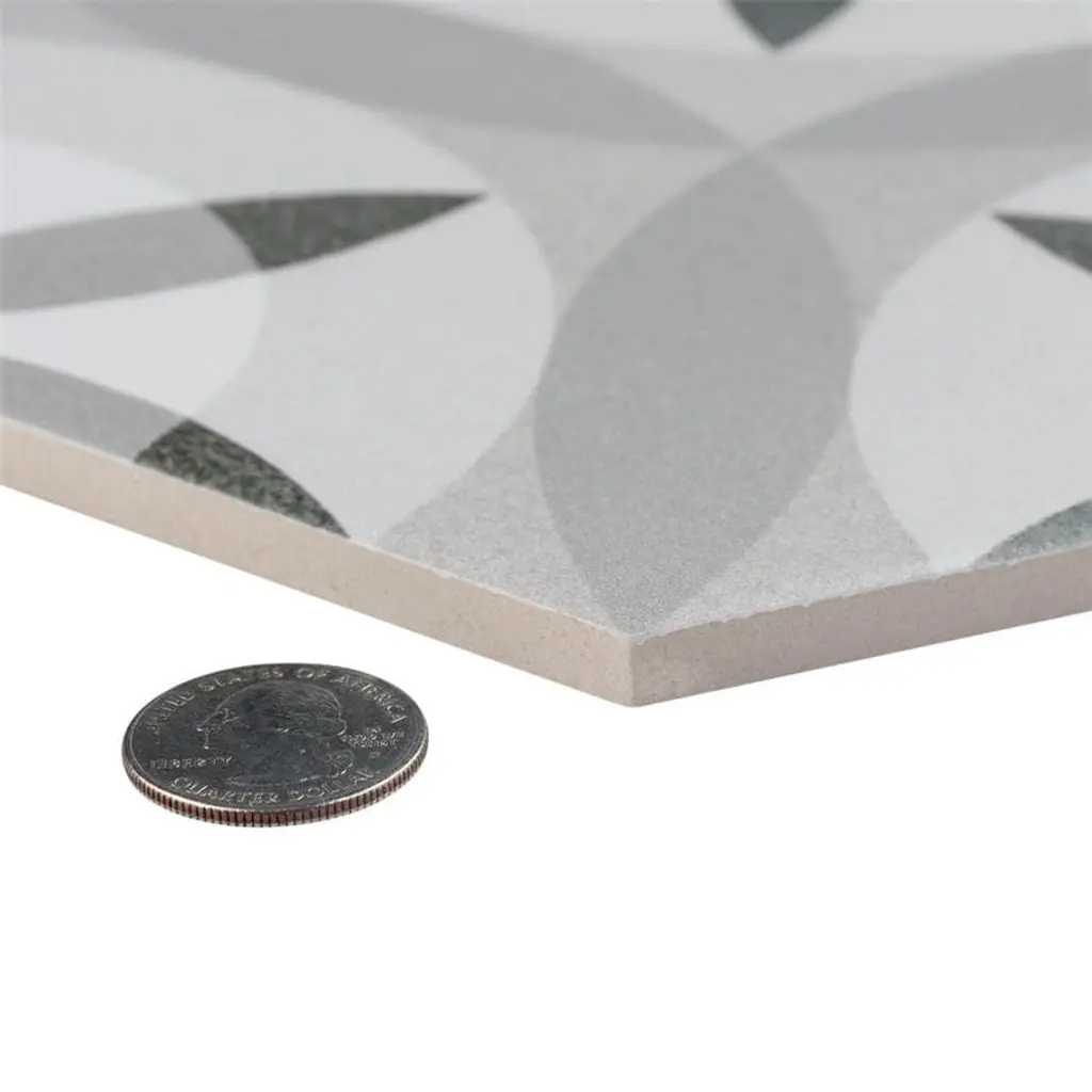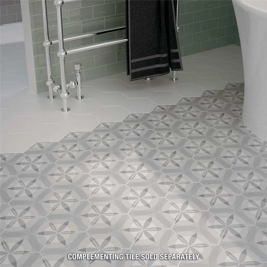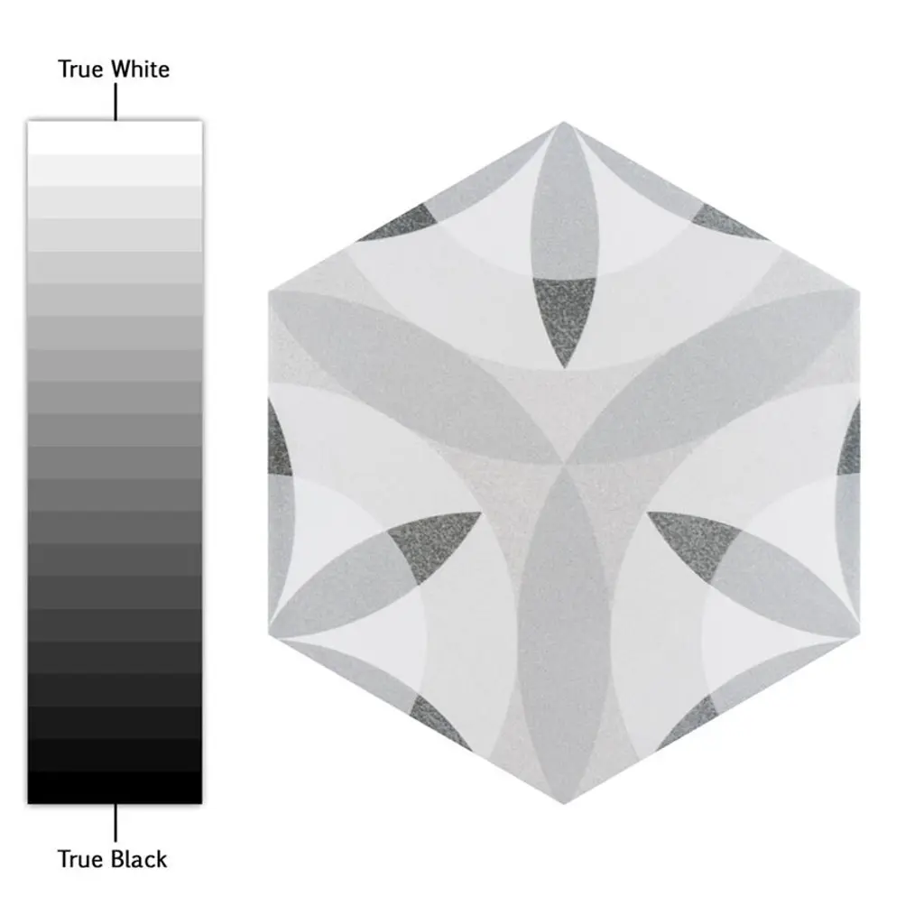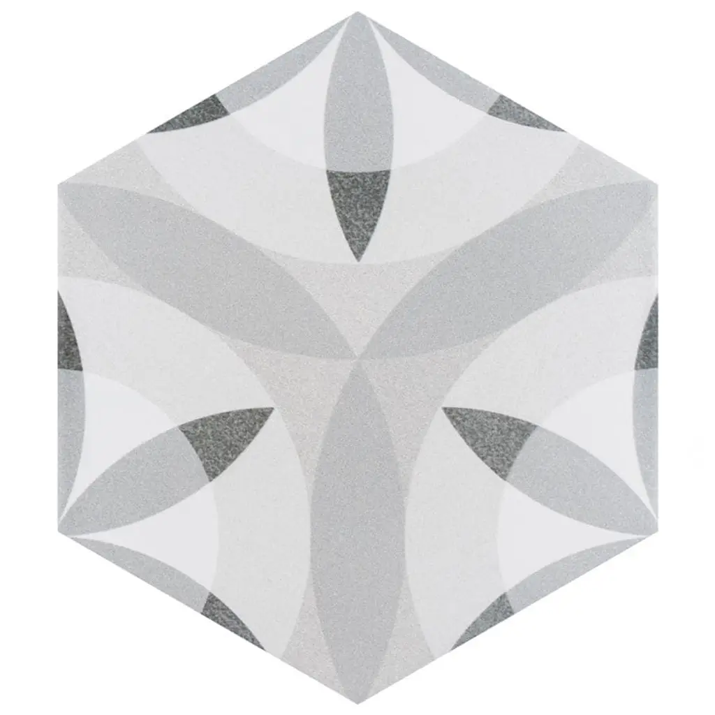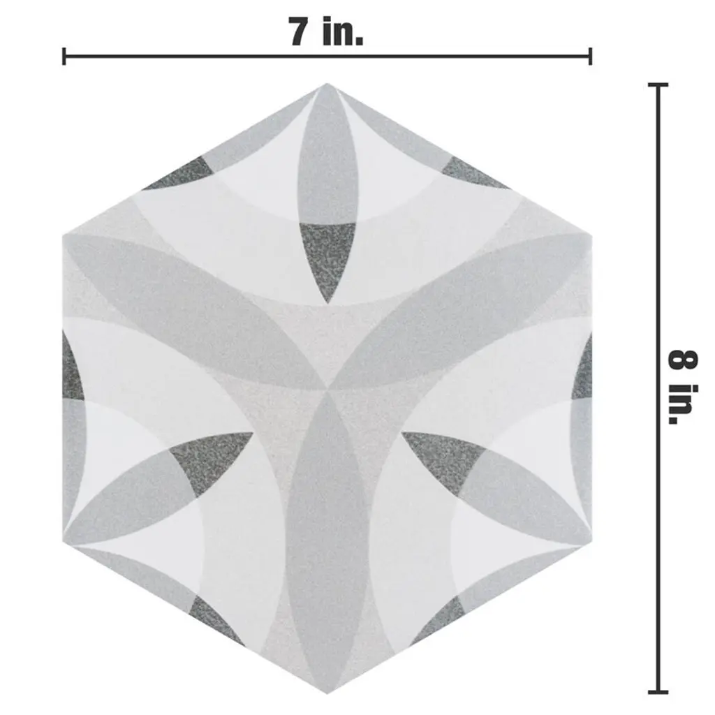 Our Hexatile Matte Nature Black & White 7" x 8" Porcelain Floor and Wall Tile brings functional character, texture and movement into any space. This porcelain tile features flowing lines and curved edges that when laid out, create floral designs with circular accents. Set on a smooth, matte base glaze, this floor and wall tile features decorative patterns in a palette of grey color tones reminiscent of marble stone. To add further contrast and dimension to the design, this tile features speckled detailing in light grey and white tones. This trendsetting design is visually appealing and versatile, allowing it to blend into various design themes, ranging from contemporary projects to traditional installations. Its impervious, durable and frost-resistant features make this an ideal choice for both commercial and residential indoor and outdoor installations, including kitchens, bathrooms, showers, entryways and patios. Tile is the better choice for your space. This tile is made from natural ingredients, making it a healthy choice as it is free from allergens, VOCs, formaldehyde and PVC.