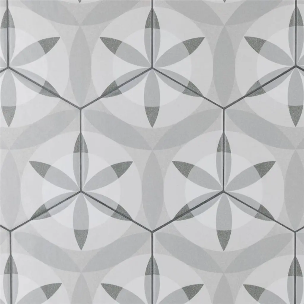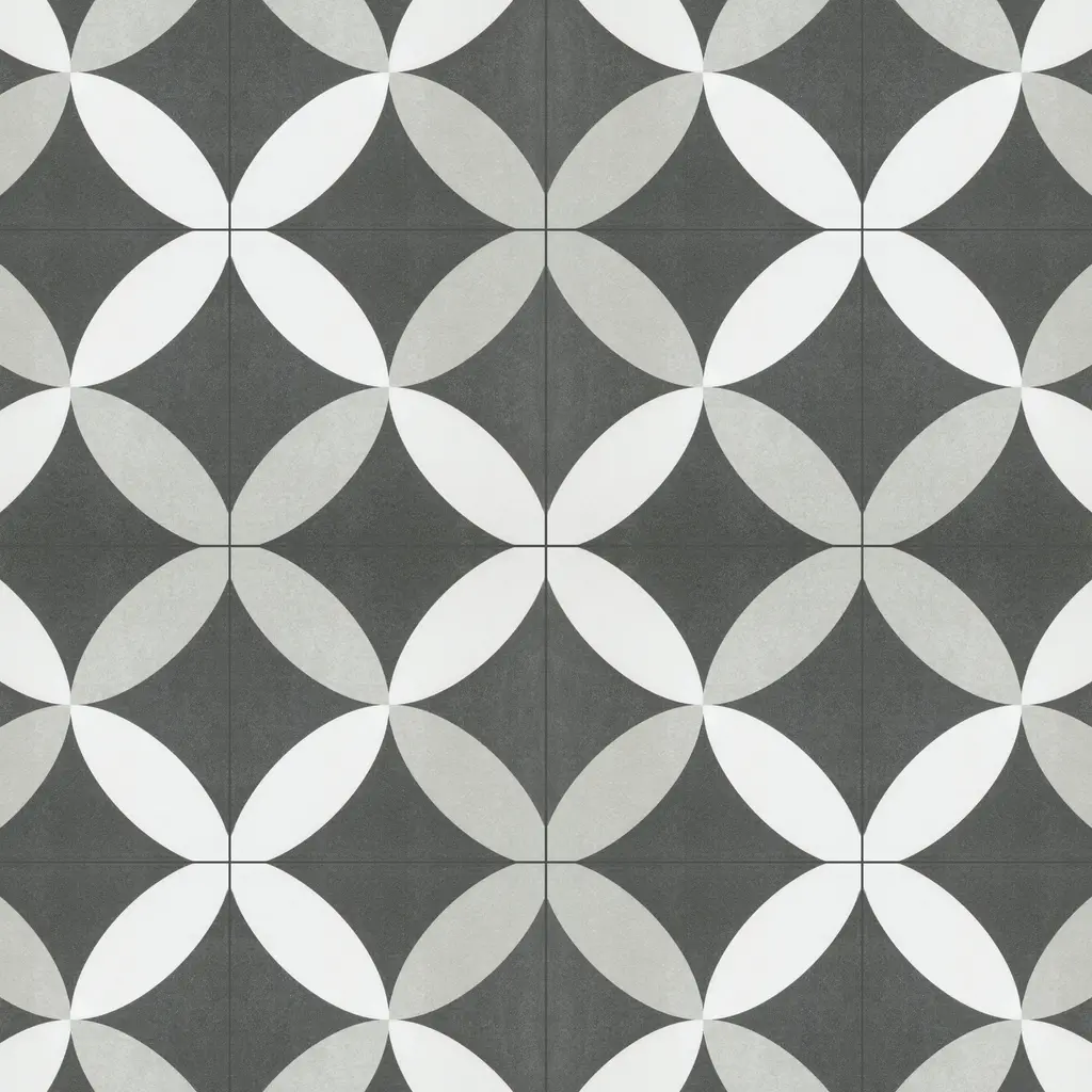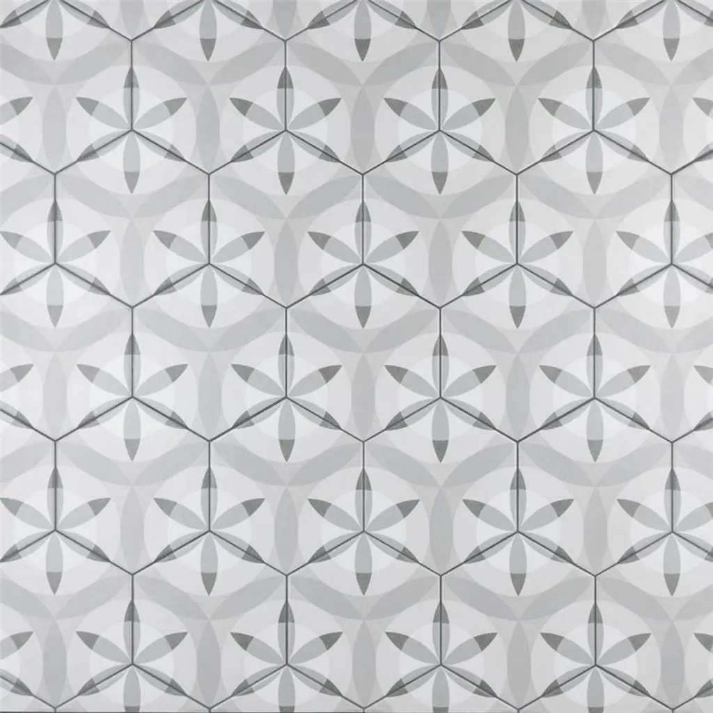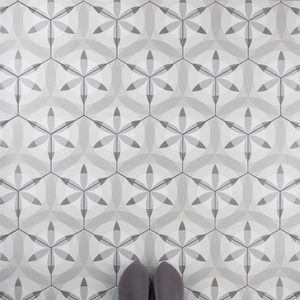 Our Hexatile Matte Nature Black & White 7" x 8" Porcelain Floor and Wall Tile brings functional character, texture and movement into any space. This porcelain tile features flowing lines and curved edges that when laid out, create floral designs with circular accents. Set on a smooth, matte base glaze, this floor and wall tile features decorative patterns in a palette of grey color tones reminiscent of marble stone. To add further contrast and dimension to the design, this tile features speckled detailing in light grey and white tones. This trendsetting design is visually appealing and versatile, allowing it to blend into various design themes, ranging from contemporary projects to traditional installations. Its impervious, durable and frost-resistant features make this an ideal choice for both commercial and residential indoor and outdoor installations, including kitchens, bathrooms, showers, entryways and patios. Tile is the better choice for your space. This tile is made from natural ingredients, making it a healthy choice as it is free from allergens, VOCs, formaldehyde and PVC.