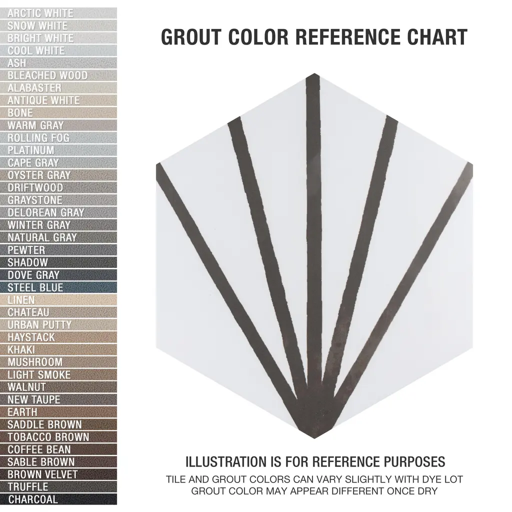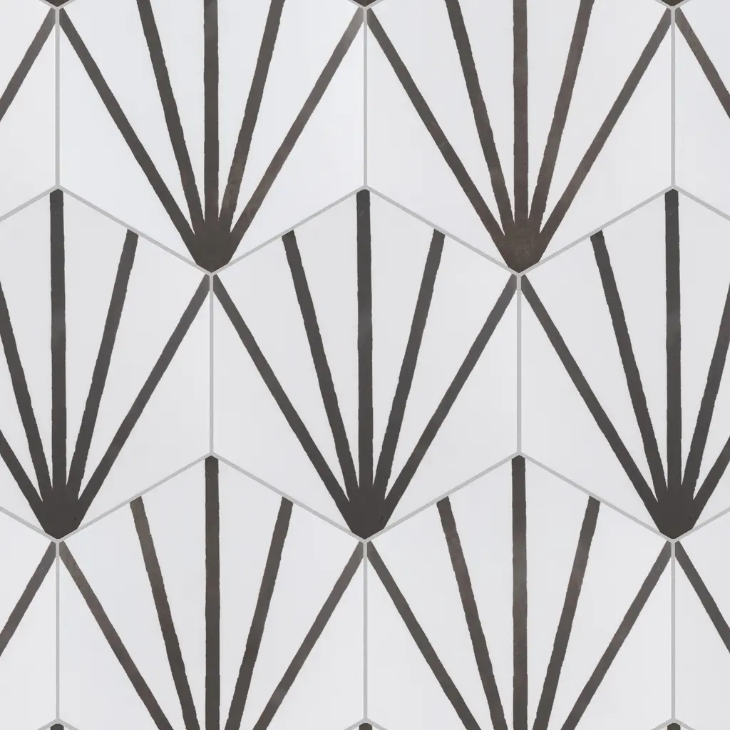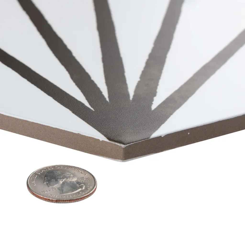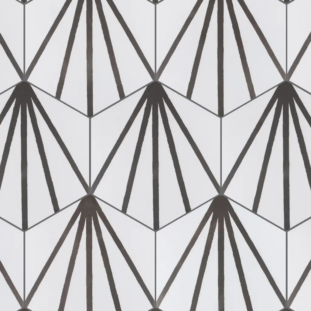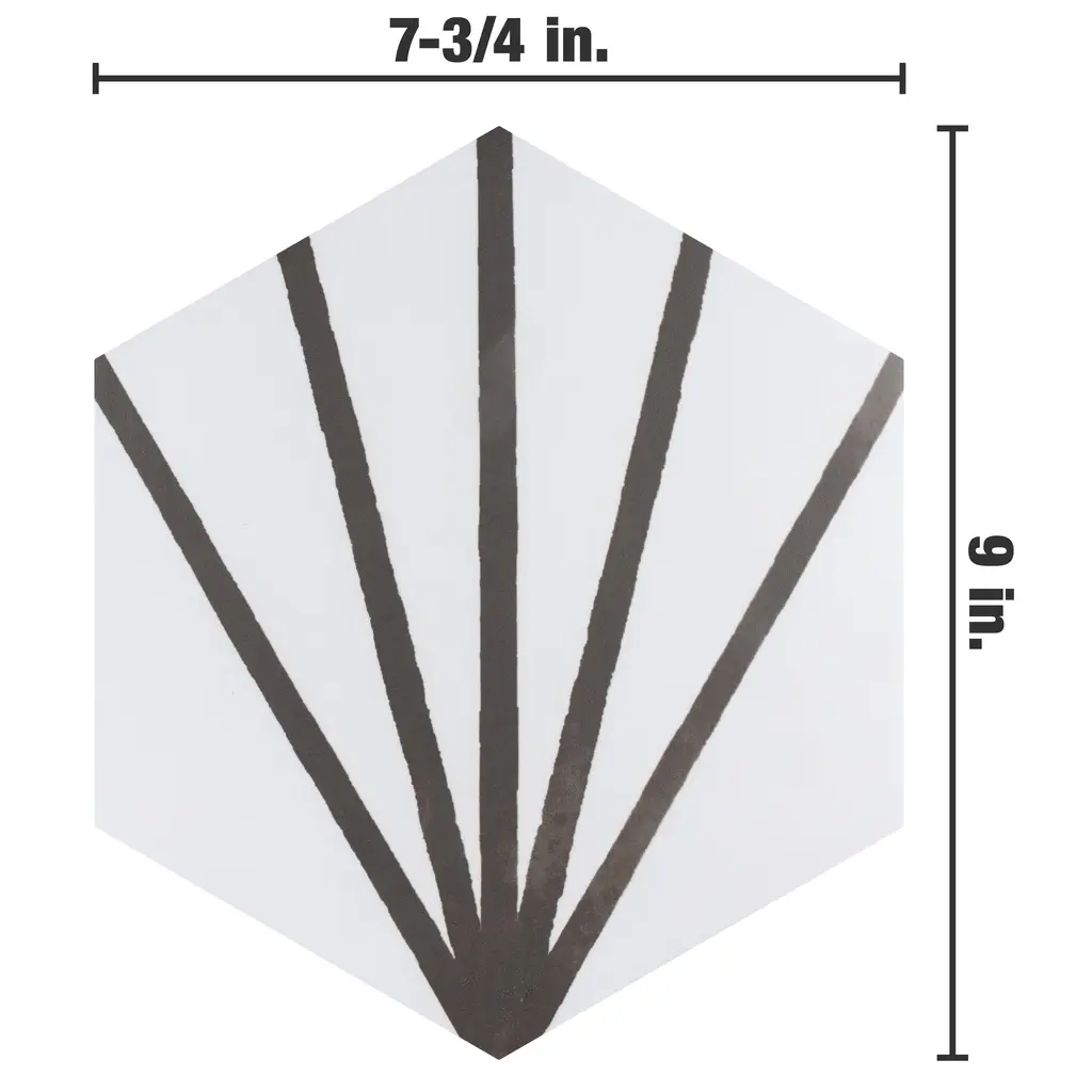 Modeling a geometric look, our Horizon Dawn Hex Nero Porcelain Floor and Wall Tile features a smooth, matte finish, providing decorative appeal that adapts to a variety of stylistic contexts. Containing 6 different print variations that are randomly distributed throughout each case, this white hexagon tile offers a one-of-a-kind look. With its impervious, frost-resistant features, this tile is an ideal selection for both indoor and outdoor residential installations, including bathrooms, backsplashes, showers, hallways and fireplace facades. This tile is a perfect choice on its own or paired with other products in the Horizon Collection. Tile is the better choice for your space! 8.88 square feet, 24 pieces per case. Case weight is 39.68 lbs. Grade 1, first-quality porcelain tile for floor and wall use 7.75 in. width x 9 in. length x 0.38 in. thick Glazed, smooth finish with a low sheen and moderate variation in tone PEI Rating II is suitable for all interior walls and light foot traffic such as powder rooms Impervious tiles have a water absorption of less than 0.5% for indoor and outdoor use and are frost resistant This tile is ADA approved for slip resistance with a DCOF value of 0.42 or higher. Completely frost resistant for indoor or outdoor applications; use a latex-modified thinset for acceptable bond strength Please note: A sample of this product may be a partial piece cut from the full size tile in order to provide an affordable and convenient way for customers to judge the quality and finish of this item. Samples are not returnable.