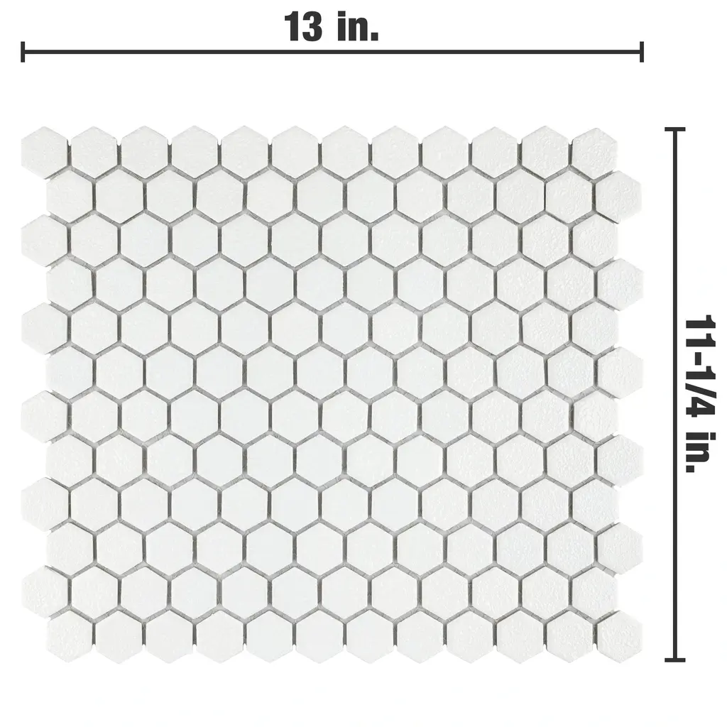 Our Hudson 1 in. Hex Crystalline White Porcelain Floor and Wall Mosaic Tile instantly elevates spaces through a refreshing dose of geometric design. Featuring a mottled glazed surface, these tiles have a muted white color palette. This mosaic creates a classic and versatile look with additional dimension added by the raised smooth, high-gloss finish. This porcelain mosaic floor and wall tile is unique yet simplistic enough to integrate into any design, ranging from traditional style renovations to modern home projects. Its impervious, frost resistant, and durable features make it an ideal choice for both commercial and residential indoor and outdoor installations including, kitchens, bathrooms, backsplashes, showers, hallways, entryways, patios, and fireplace facades. This tile is a perfect choice on its own or coordinated with other products in the Hudson Hex series. Tile is the better choice for your space. This tile is made from natural ingredients, making it a healthy choice as it is free from allergens, VOCs, formaldehyde, and PVC. 11.2 square feet, 10 pieces per case. Case weight is 19 lbs. Grade 1, first-quality porcelain tile for floor and wall use 11.88 in. width x 13.25 in. length x 0.19 in. thick mesh-mounted mosaic Glazed, medium textured finish with a high sheen and slight variation in tone PEI Rating III is suitable for medium-duty residential floors including kitchens, halls, corridors, balconies, terraces and areas used more often with normal footwear and small amounts of dirt Impervious tiles have a water absorption of less than 0.5% for indoor and outdoor use and are frost resistant This tile is not ADA approved for slip resistance with a DCOF value less than 0.42. Completely frost resistant for indoor or outdoor applications; use a latex-modified thinset for acceptable bond strength Please note: A sample of this product may be a partial piece cut from the full size tile in order to provide an affordable and convenient way for customers to judge the quality and finish of this item. Samples are not returnable.