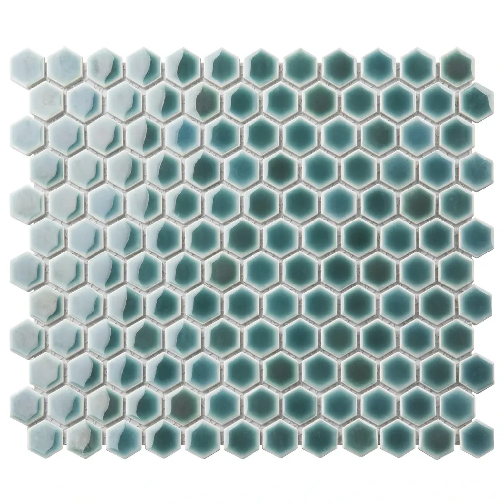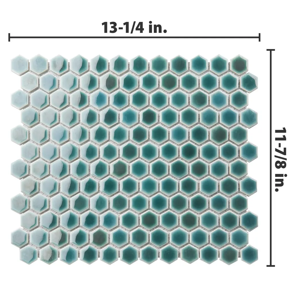 Offering a mosaic look, our Hudson 1 in. Hex Emerald Porcelain Floor and Wall Tile features a smooth, glossy finish, providing decorative appeal that adapts to a variety of stylistic contexts. With its impervious, frost-resistant features, this green hexagon mosaic is an ideal selection for both indoor and outdoor residential installations, including bathrooms, backsplashes, showers, hallways and fireplace facades. This tile is a perfect choice on its own or paired with other products in the Hudson Collection. Tile is the better choice for your space! 11.2 square feet, 10 pieces per case. Case weight is 19 lbs. Grade 1, first-quality porcelain tile for floor and wall use 11.88 in. width x 13.25 in. length x 0.19 in. thick mesh-mounted mosaic Glazed, smooth finish with a high sheen and slight variation in tone PEI Rating II is suitable for all interior walls and light foot traffic such as powder rooms Impervious tiles have a water absorption of less than 0.5% for indoor and outdoor use and are frost resistant This tile is not ADA approved for slip resistance with a DCOF value less than 0.42. Completely frost resistant for indoor or outdoor applications; use a latex-modified thinset for acceptable bond strength Please note: A sample of this product may be a partial piece cut from the full size tile in order to provide an affordable and convenient way for customers to judge the quality and finish of this item. Samples are not returnable.