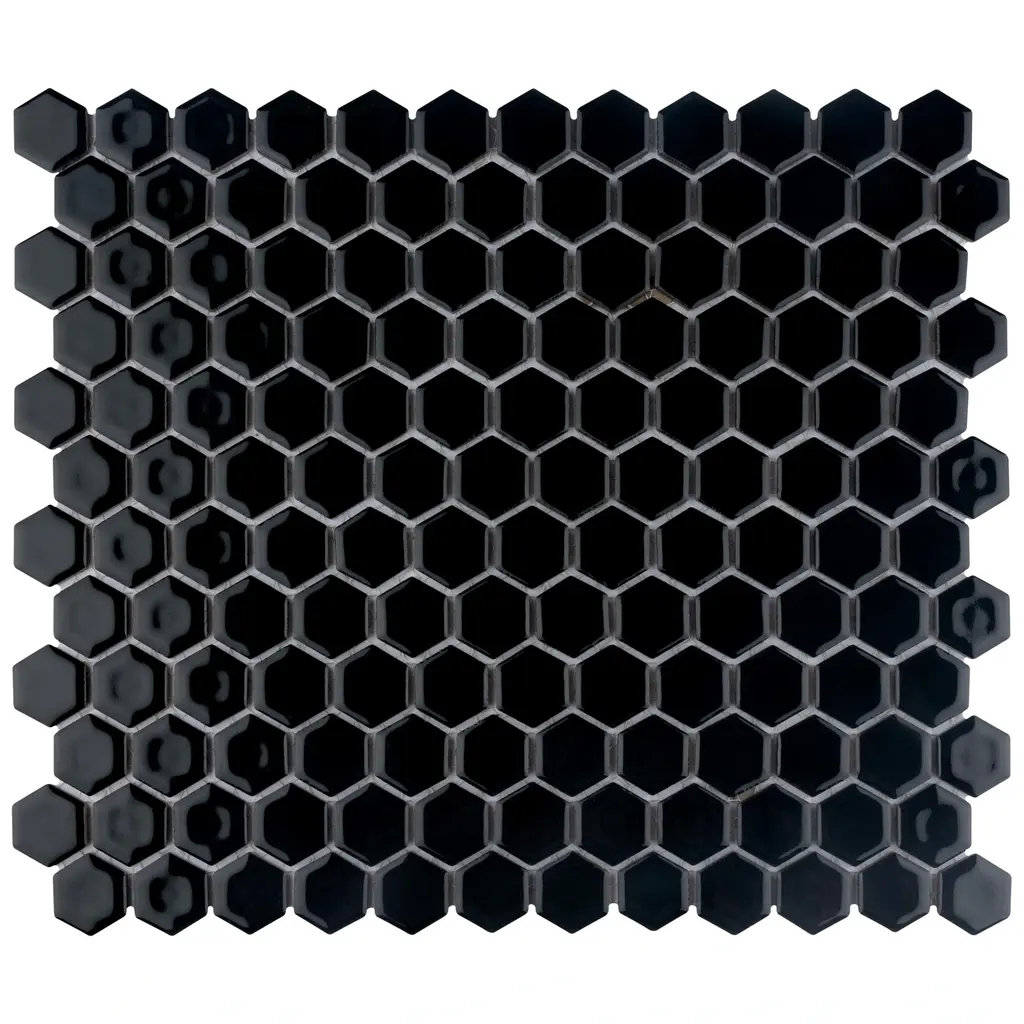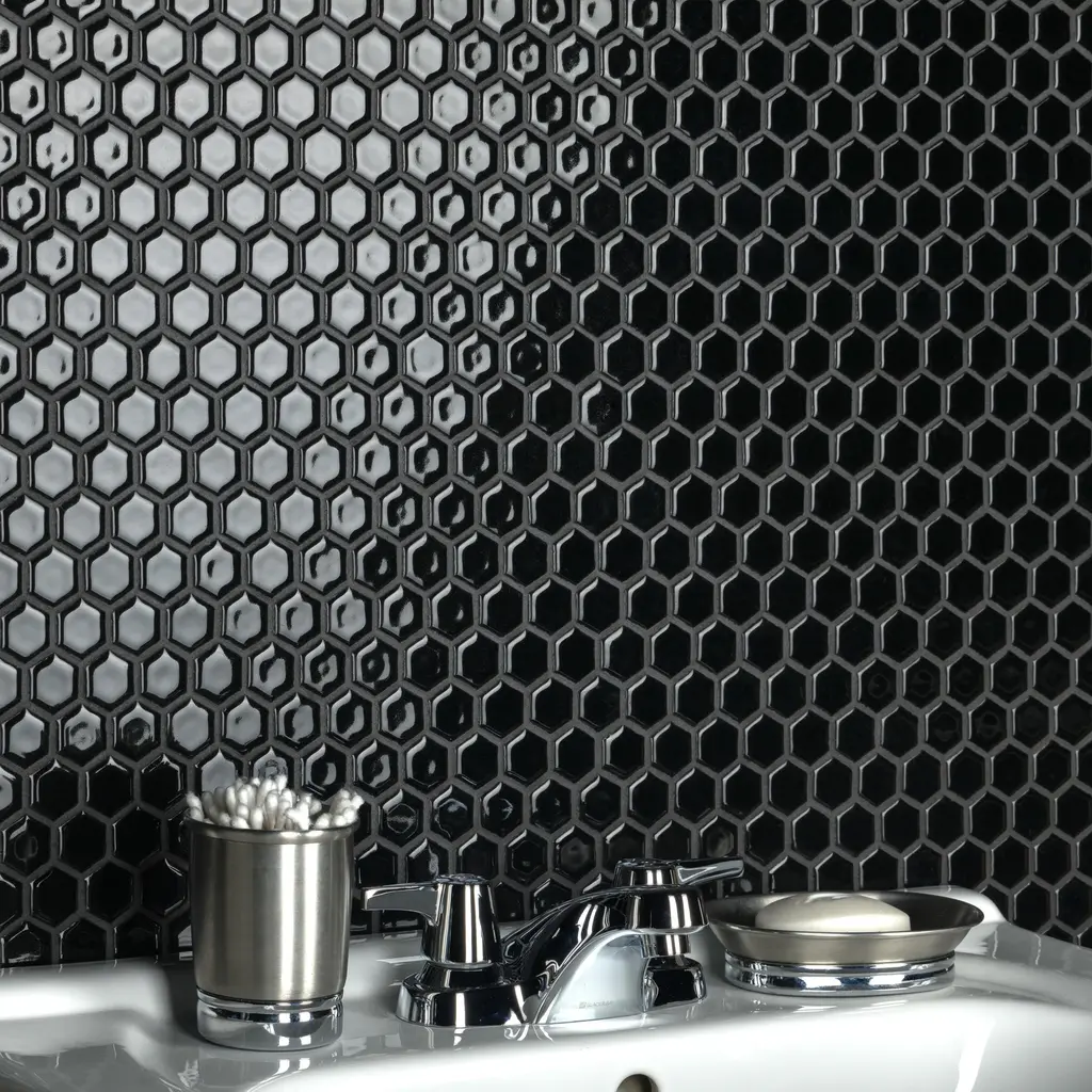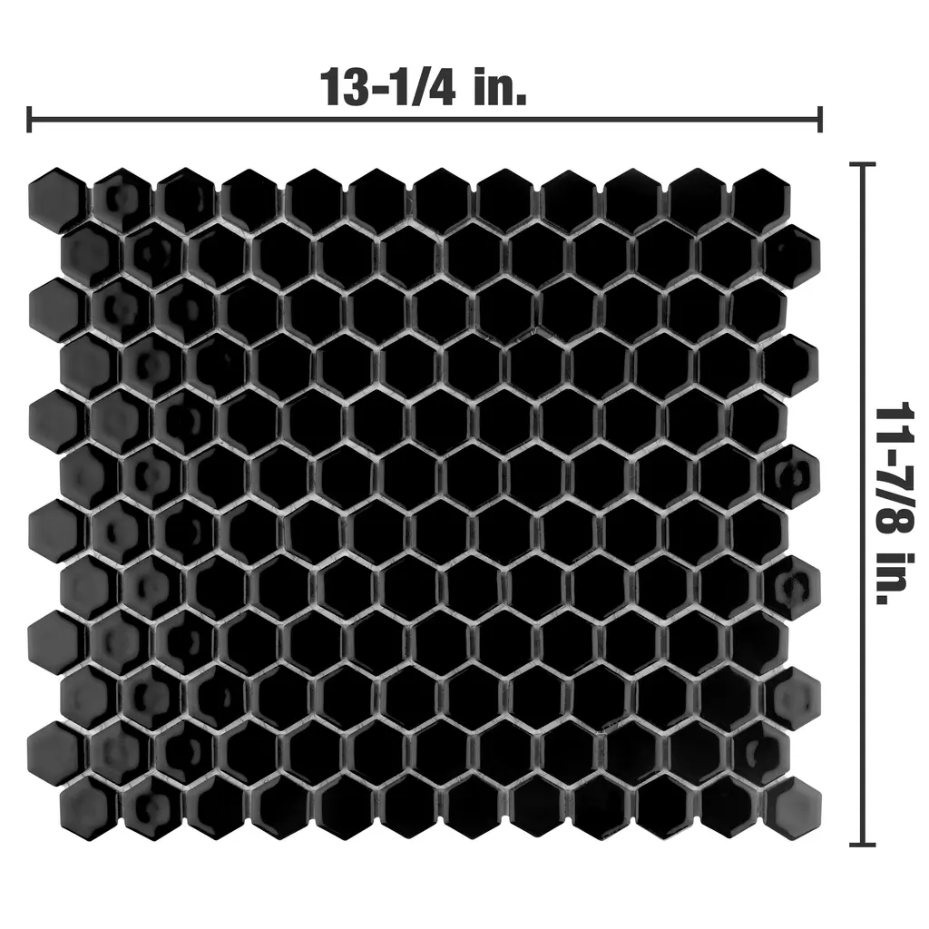 Offering a mosaic look, our Hudson 1 in. Hex Glossy Black Porcelain Floor and Wall Tile features a smooth, glossy finish, providing decorative appeal that adapts to a variety of stylistic contexts. With its impervious, frost-resistant features, this black hexagon mosaic is an ideal selection for both indoor and outdoor commercial and residential installations, including kitchens, bathrooms, backsplashes, showers, hallways, entryways, patios and fireplace facades. This tile is a perfect choice on its own or paired with other products in the Hudson Collection. Tile is the better choice for your space! 11.2 square feet, 10 pieces per case. Case weight is 19 lbs. Grade 1, first-quality porcelain tile for floor and wall use 11.88 in. width x 13.25 in. length x 0.19 in. thick mesh-mounted mosaic Glazed, smooth finish with a high sheen and slight variation in tone PEI Rating IV has high resistance to abrasion and is suitable for heavy-duty residential and commercial kitchens, hotels, exhibition and sales rooms with some dirt conditions Impervious tiles have a water absorption of less than 0.5% for indoor and outdoor use and are frost resistant This tile is not ADA approved for slip resistance with a DCOF value less than 0.42. Completely frost resistant for indoor or outdoor applications; use a latex-modified thinset for acceptable bond strength Please note: A sample of this product may be a partial piece cut from the full size tile in order to provide an affordable and convenient way for customers to judge the quality and finish of this item. Samples are not returnable.