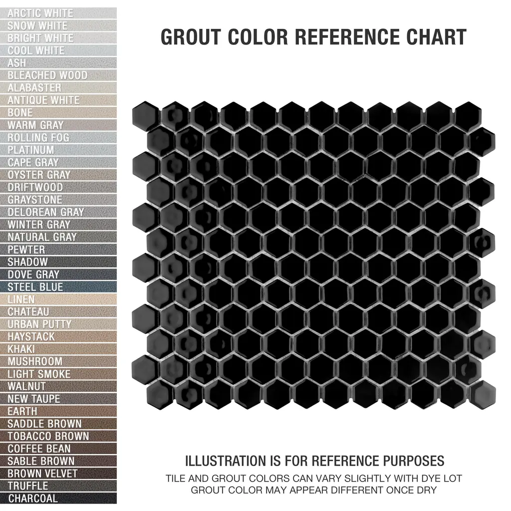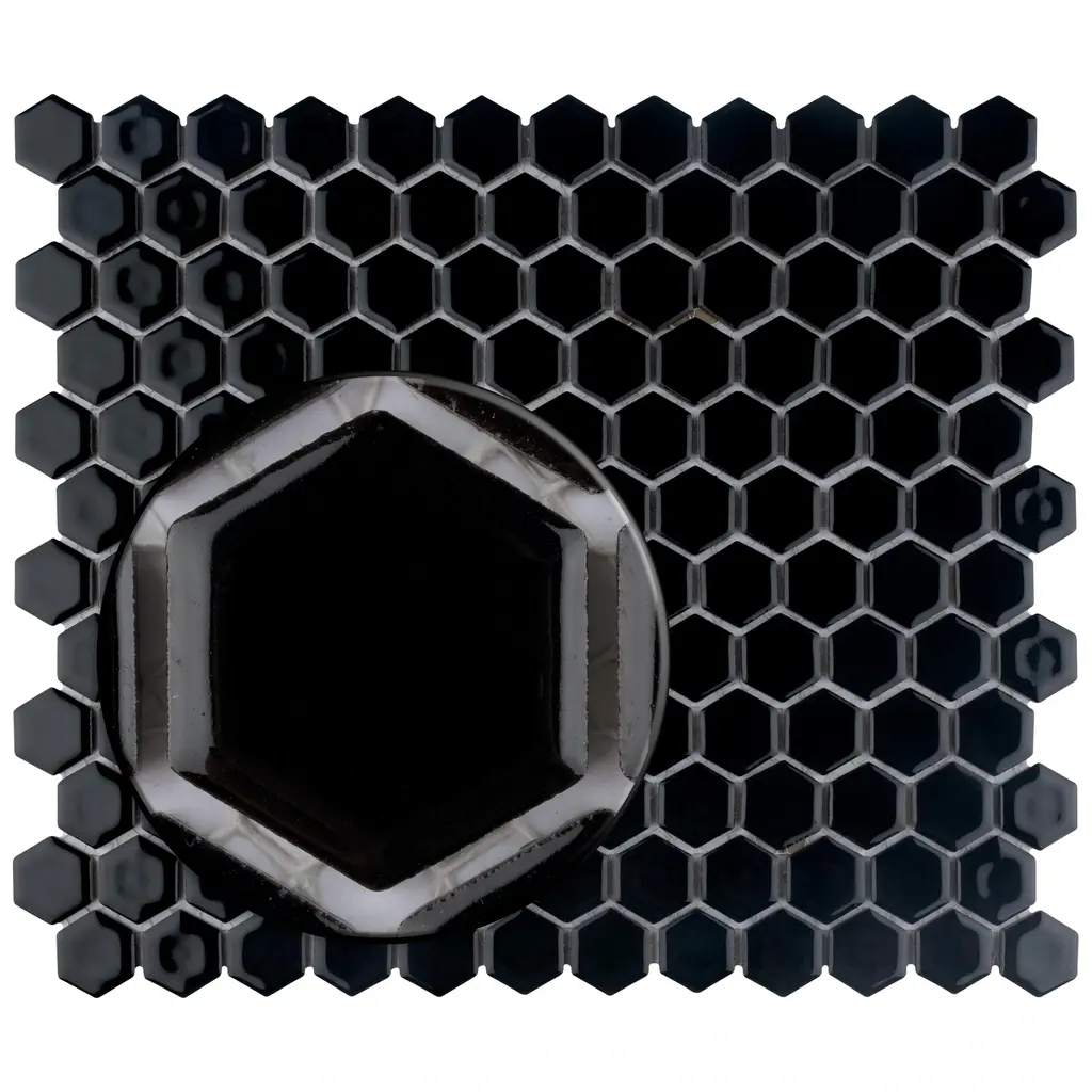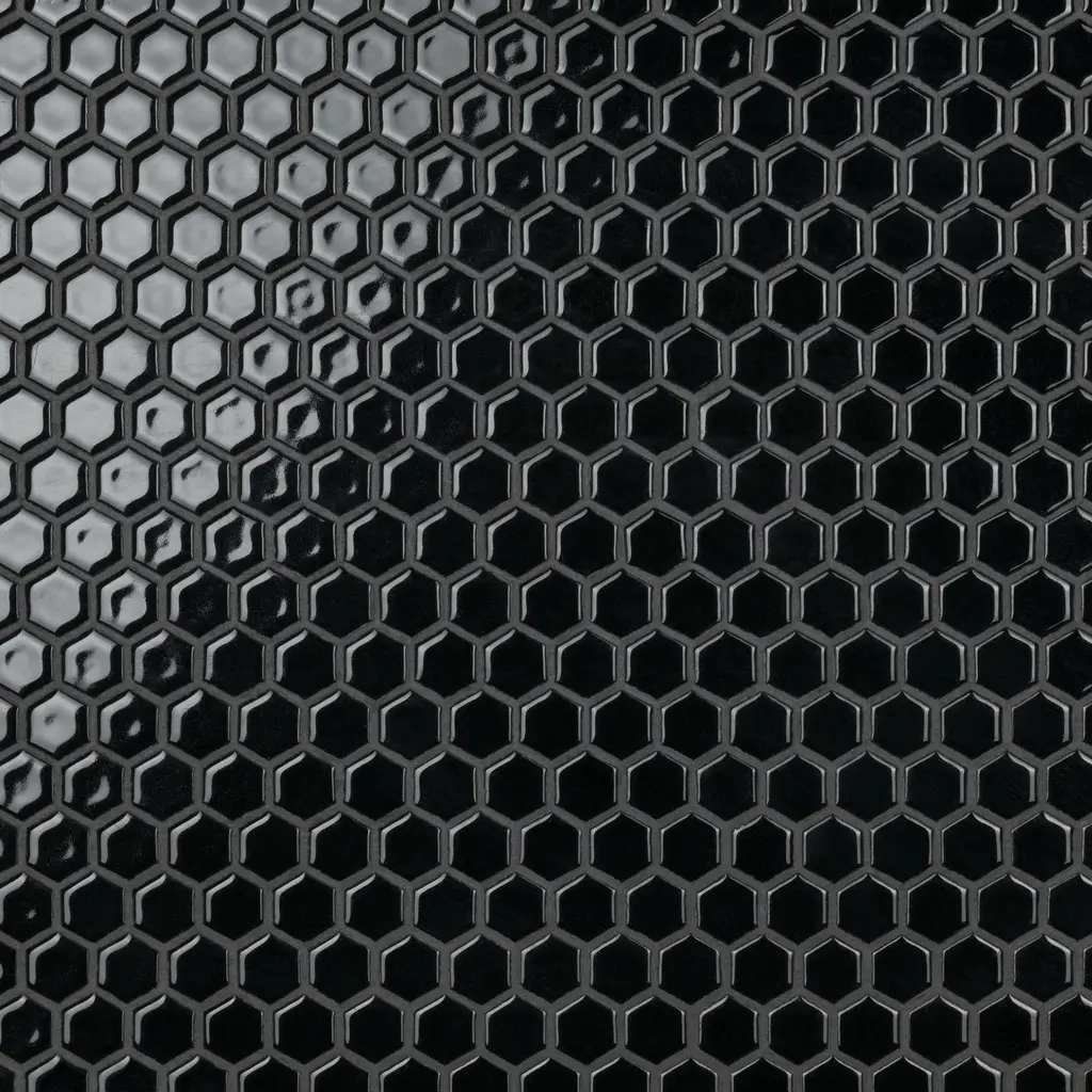 Offering a mosaic look, our Hudson 1 in. Hex Glossy Black Porcelain Floor and Wall Tile features a smooth, glossy finish, providing decorative appeal that adapts to a variety of stylistic contexts. With its impervious, frost-resistant features, this black hexagon mosaic is an ideal selection for both indoor and outdoor commercial and residential installations, including kitchens, bathrooms, backsplashes, showers, hallways, entryways, patios and fireplace facades. This tile is a perfect choice on its own or paired with other products in the Hudson Collection. Tile is the better choice for your space! 11.2 square feet, 10 pieces per case. Case weight is 19 lbs. Grade 1, first-quality porcelain tile for floor and wall use 11.88 in. width x 13.25 in. length x 0.19 in. thick mesh-mounted mosaic Glazed, smooth finish with a high sheen and slight variation in tone PEI Rating IV has high resistance to abrasion and is suitable for heavy-duty residential and commercial kitchens, hotels, exhibition and sales rooms with some dirt conditions Impervious tiles have a water absorption of less than 0.5% for indoor and outdoor use and are frost resistant This tile is not ADA approved for slip resistance with a DCOF value less than 0.42. Completely frost resistant for indoor or outdoor applications; use a latex-modified thinset for acceptable bond strength Please note: A sample of this product may be a partial piece cut from the full size tile in order to provide an affordable and convenient way for customers to judge the quality and finish of this item. Samples are not returnable.