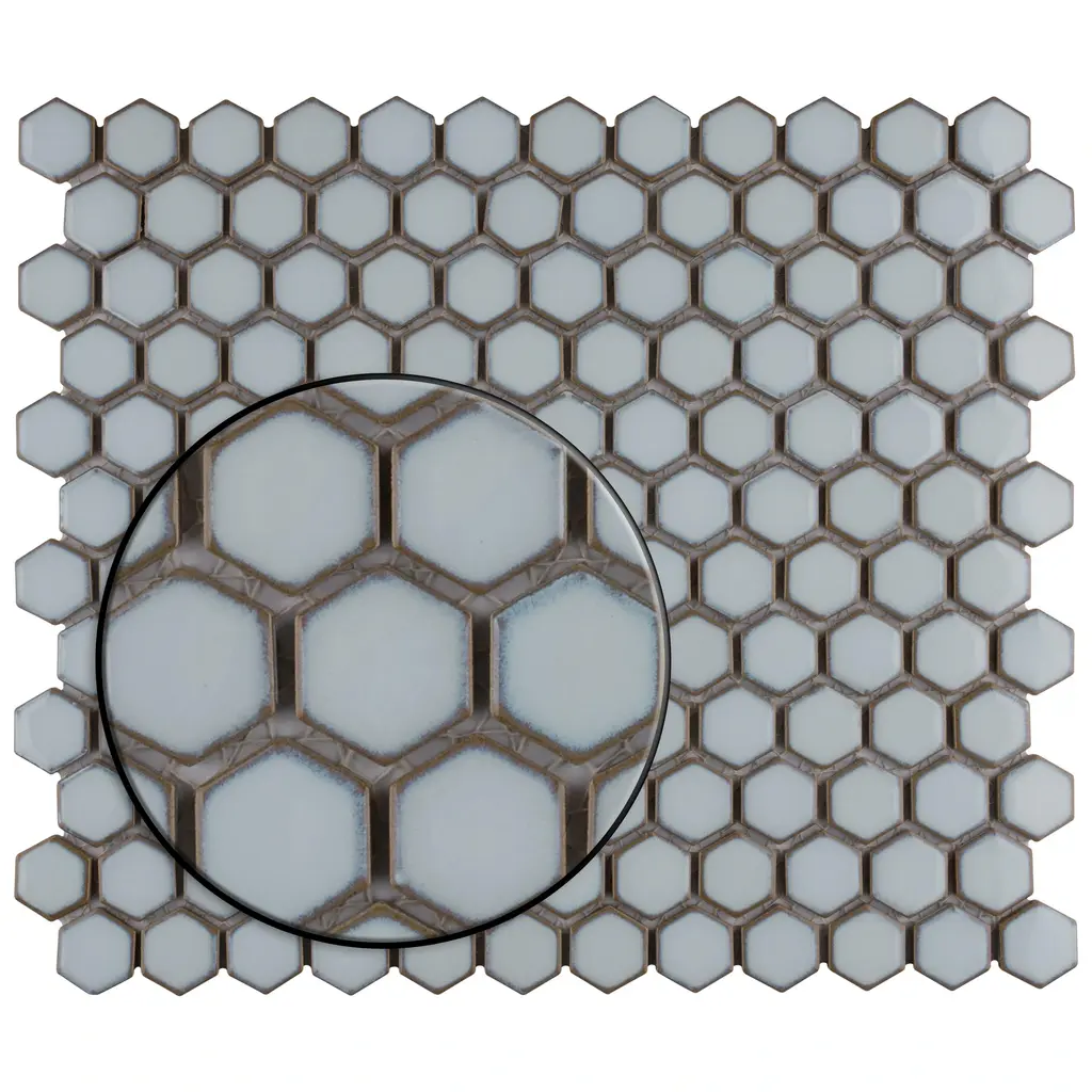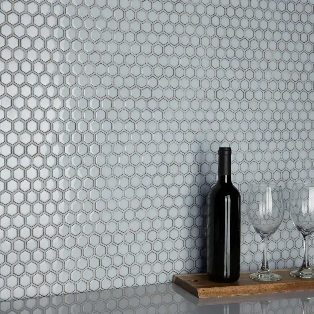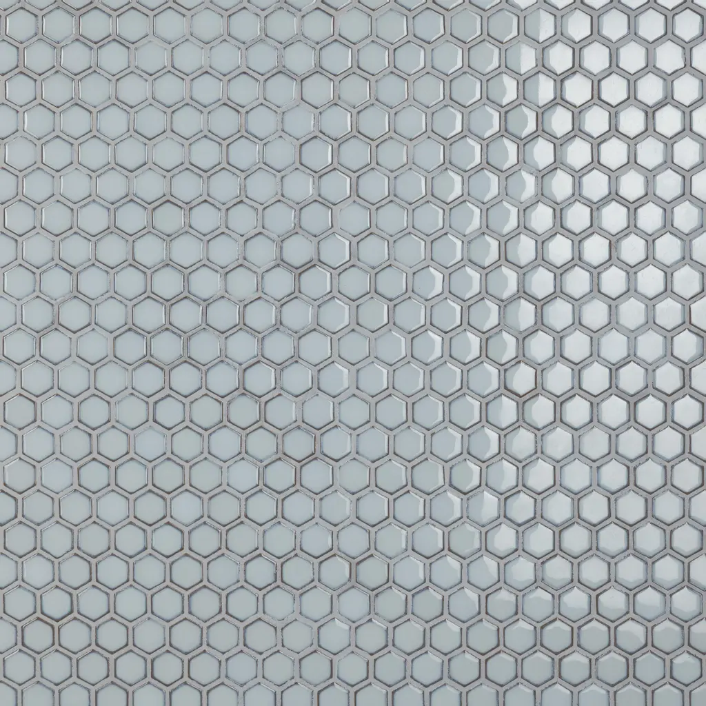 Our Hudson 1 in. Hex Silk White Porcelain Floor and Wall Mosaic Tile instantly elevates spaces through a refreshing dose of geometric design. Featuring a reactive glaze with an eye-drop effect, these tiles have a soft, silk white color tone with a subtle baby blue undertone that blend to taupe around the edges. This mosaic is a pleasing mixture of cool-toned tints with additional dimension added by the smooth, high-gloss finish. This porcelain mosaic floor and wall tile is unique yet simplistic enough to integrate into any design, ranging from traditional style renovations to modern home projects. Its impervious and frost-resistant features make this an ideal choice for both commercial and residential indoor and outdoor floor and wall installations including, kitchen backsplashes, bathroom showers and accent walls. This hexagon mosaic can be used as a whole sheet or cut into smaller strips as an accent piece. It is a perfect choice on its own or coordinated with other colors in our Hudson Hex series. Tile is the better choice for your space. This tile is made from natural ingredients, making it a healthy choice as it is free from allergens, VOCs, formaldehyde and PVC. 11.2 square feet, 10 pieces per case. Case weight is 19 lbs. Grade 1, first-quality porcelain tile for floor and wall use 11.88 in. width x 13.25 in. length x 0.19 in. thick mesh-mounted mosaic Glazed, smooth finish with a high sheen and slight variation in tone PEI Rating IV has high resistance to abrasion and is suitable for heavy-duty residential and commercial kitchens, hotels, exhibition and sales rooms with some dirt conditions Impervious tiles have a water absorption of less than 0.5% for indoor and outdoor use and are frost resistant This tile is not ADA approved for slip resistance with a DCOF value less than 0.42. Completely frost resistant for indoor or outdoor applications; use a latex-modified thinset for acceptable bond strength Please note: A sample of this product may be a partial piece cut from the full size tile in order to provide an affordable and convenient way for customers to judge the quality and finish of this item. Samples are not returnable.