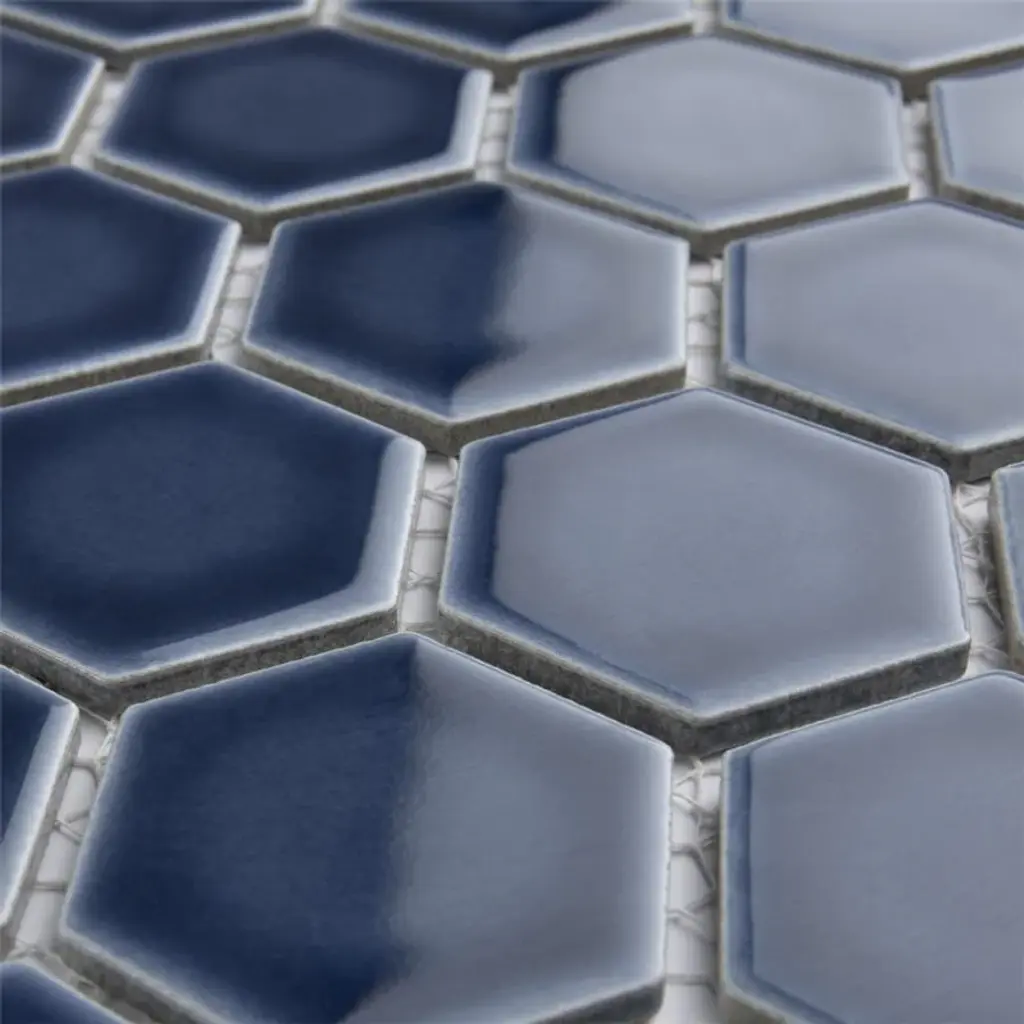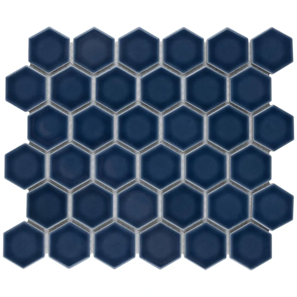 As a modern, enlarged deviation from the classic hexagon mosaic, our Hudson Due 2 in. Hex Denim Blue Porcelain Floor and Wall Mosaic Tile instantly elevates spaces through a refreshing dose of geometric design. Featuring a reactive glaze with an eye-drop effect, these tiles have hues of faded denim blues that blend to white around the edges. This porcelain mosaic floor and wall tile creates a uniquely sporadic design through a pleasing mixture of cool-toned tints with additional dimension added by the smooth, high-gloss finish. Its impervious and frost-resistant features make this an ideal choice for indoor and outdoor floor and wall installations including, kitchen backsplashes, bathroom showers and accent walls. This hexagon mosaic can be used as a whole sheet or cut into smaller strips as an accent piece. It is a perfect choice on its own or coordinated with other colors in our Hudson Due 2 in. Hex series. Tile is the better choice for your space. This tile is made from natural ingredients, making it a healthy choice as it is free from allergens, VOCs, formaldehyde and PVC. 9.7 square feet, 10 pieces per case. Case weight is 20.78 lbs. Grade 1, first-quality porcelain tile for floor and wall use 10.88 in. width x 12.63 in. length x 0.19 in. thick mesh-mounted mosaic Glazed, smooth finish with a high sheen and slight variation in tone PEI Rating II is suitable for all interior walls and light foot traffic such as powder rooms Impervious tiles have a water absorption of less than 0.5% for indoor and outdoor use and are frost resistant This tile is not ADA approved for slip resistance with a DCOF value less than 0.42. Completely frost resistant for indoor or outdoor applications; use a latex-modified thinset for acceptable bond strength Please note: A sample of this product may be a partial piece cut from the full size tile in order to provide an affordable and convenient way for customers to judge the quality and finish of this item. Samples are not returnable.