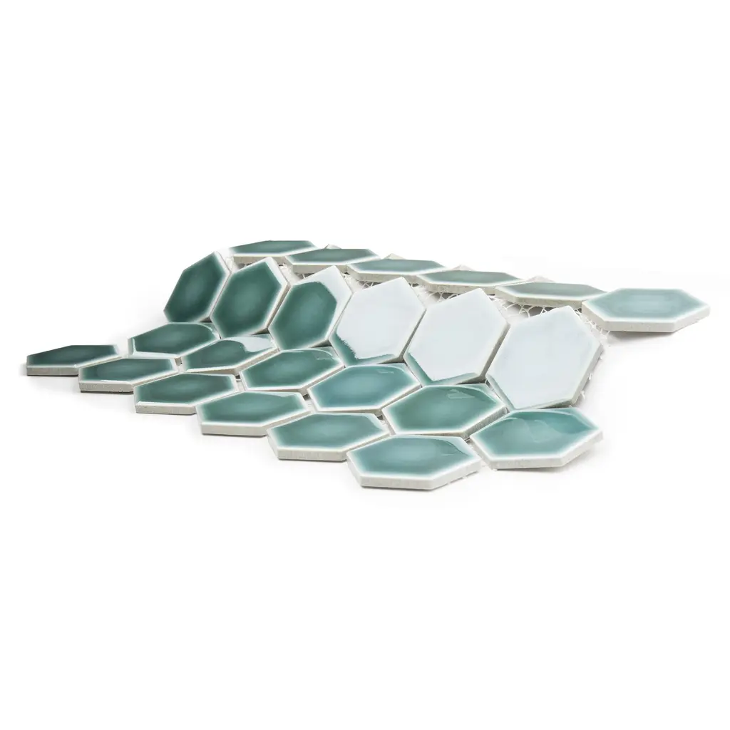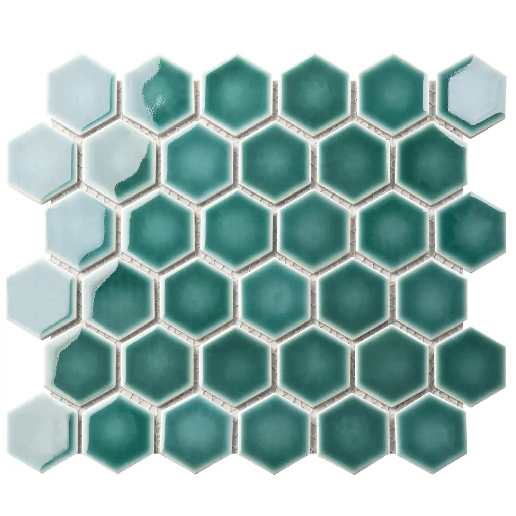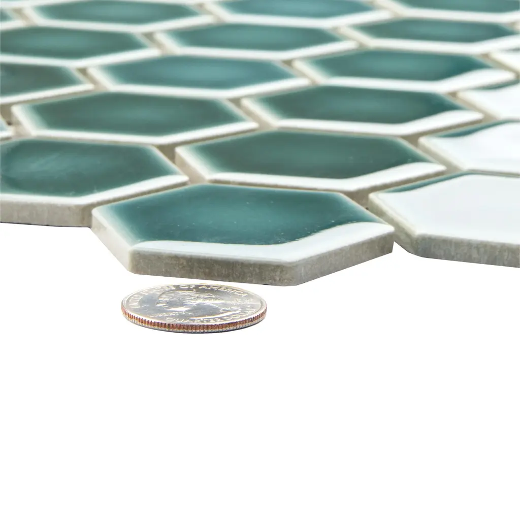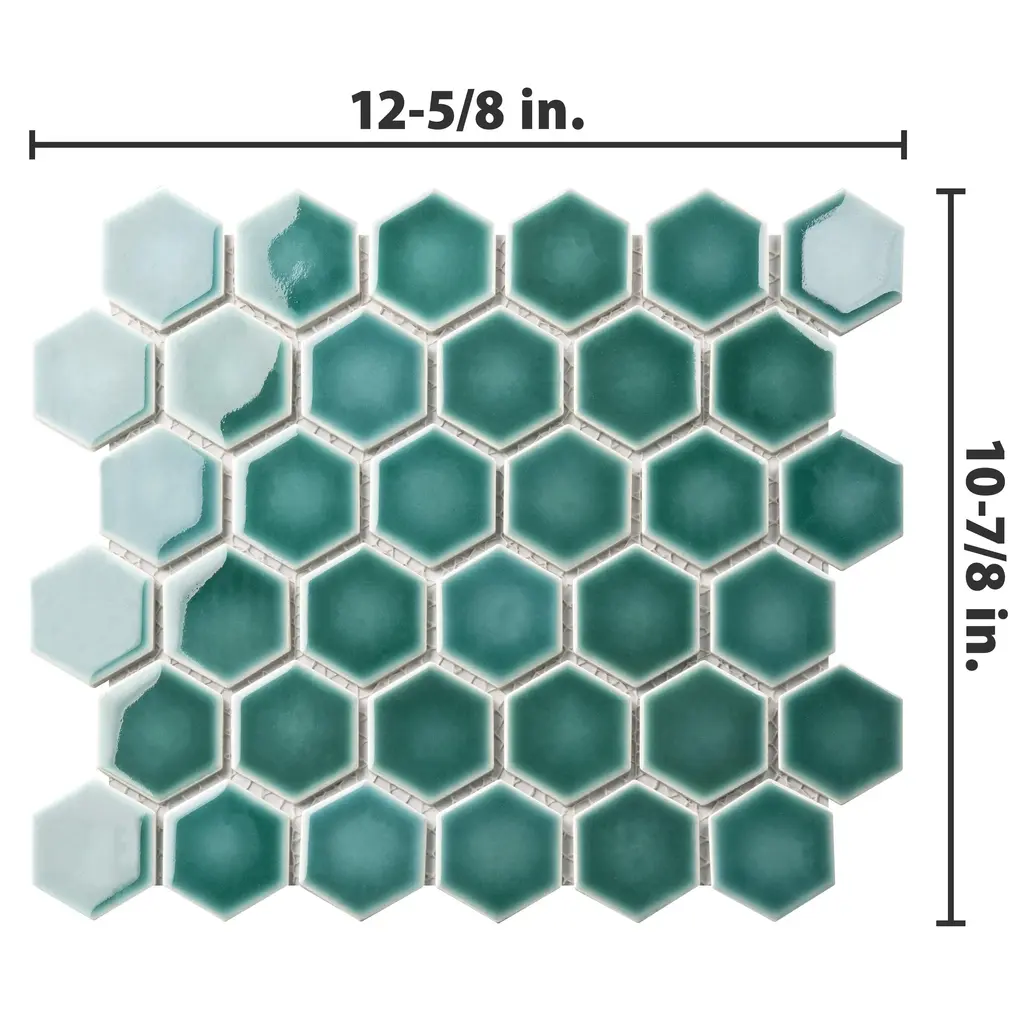Offering a mosaic look, our Hudson Due 2 in. Hex Emerald Porcelain Floor and Wall Tile features a smooth, glossy finish, providing decorative appeal that adapts to a variety of stylistic contexts. With its impervious, frost-resistant features, this green hexagon mosaic is an ideal selection for both indoor and outdoor residential installations, including bathrooms, backsplashes, showers, hallways and fireplace facades. This tile is a perfect choice on its own or paired with other products in the Hudson Collection. Tile is the better choice for your space! 9.7 square feet, 10 pieces per case. Case weight is 20.78 lbs. Grade 1, first-quality porcelain tile for floor and wall use 10.88 in. width x 12.63 in. length x 0.19 in. thick mesh-mounted mosaic Glazed, smooth finish with a high sheen and slight variation in tone PEI Rating II is suitable for all interior walls and light foot traffic such as powder rooms Impervious tiles have a water absorption of less than 0.5% for indoor and outdoor use and are frost resistant This tile is not ADA approved for slip resistance with a DCOF value less than 0.42. Completely frost resistant for indoor or outdoor applications; use a latex-modified thinset for acceptable bond strength Please note: A sample of this product may be a partial piece cut from the full size tile in order to provide an affordable and convenient way for customers to judge the quality and finish of this item. Samples are not returnable.