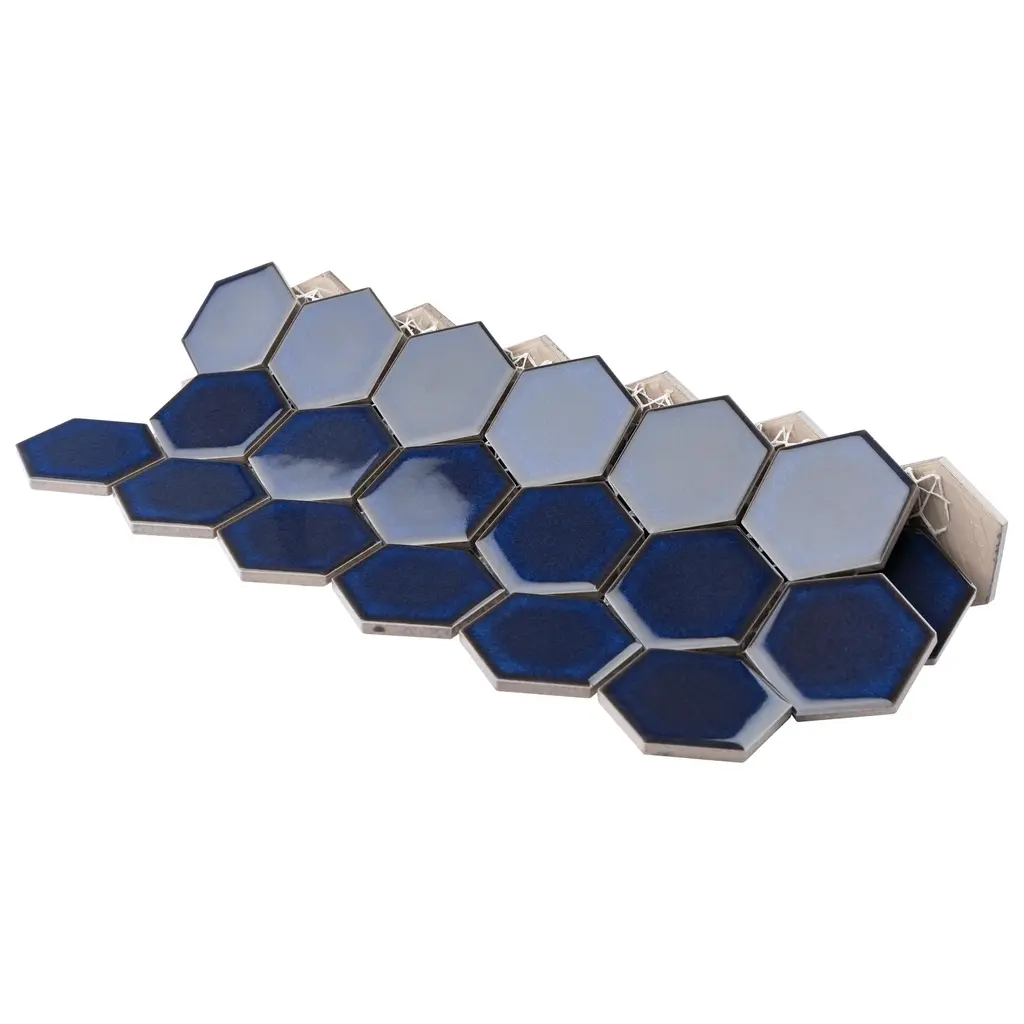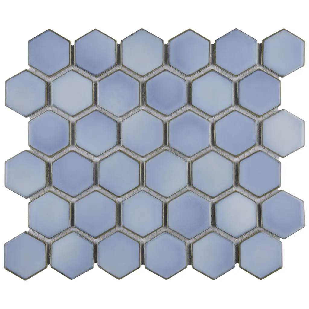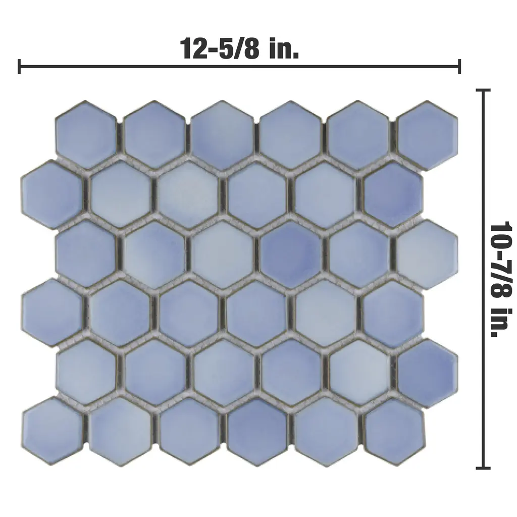 As a modern, enlarged deviation from the classic hexagon mosaic, our Hudson Due 2 in. Hex Frost Blue Porcelain Floor and Wall Mosaic Tile instantly elevates spaces through a refreshing dose of geometric design. Featuring a reactive glaze with an eye-drop effect, these tiles have soothing hues of light blue with an indigo undertone that blend to taupe around the edges. This porcelain mosaic floor and wall tile creates a uniquely sporadic design through a pleasing mixture of cool-toned tints with additional dimension added by the smooth, high-gloss finish. Its impervious and frost-resistant features make this an ideal choice for indoor and outdoor floor and wall installations including, kitchen backsplashes, bathroom showers and accent walls. This hexagon mosaic can be used as a whole sheet or cut into smaller strips as an accent piece. It is a perfect choice on its own or coordinated with other colors in our Hudson Due 2 in. Hex series. Tile is the better choice for your space. This tile is made from natural ingredients, making it a healthy choice as it is free from allergens, VOCs, formaldehyde and PVC. 9.7 square feet, 10 pieces per case. Case weight is 20.78 lbs. Grade 1, first-quality porcelain tile for floor and wall use 10.88 in. width x 12.63 in. length x 0.19 in. thick mesh-mounted mosaic Glazed, smooth finish with a high sheen and slight variation in tone PEI Rating IV has high resistance to abrasion and is suitable for heavy-duty residential and commercial kitchens, hotels, exhibition and sales rooms with some dirt conditions Impervious tiles have a water absorption of less than 0.5% for indoor and outdoor use and are frost resistant This tile is not ADA approved for slip resistance with a DCOF value less than 0.42. Completely frost resistant for indoor or outdoor applications; use a latex-modified thinset for acceptable bond strength Please note: A sample of this product may be a partial piece cut from the full size tile in order to provide an affordable and convenient way for customers to judge the quality and finish of this item. Samples are not returnable.