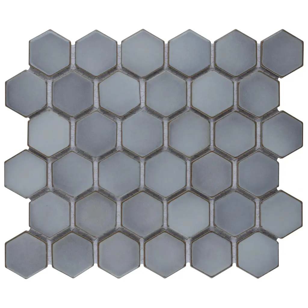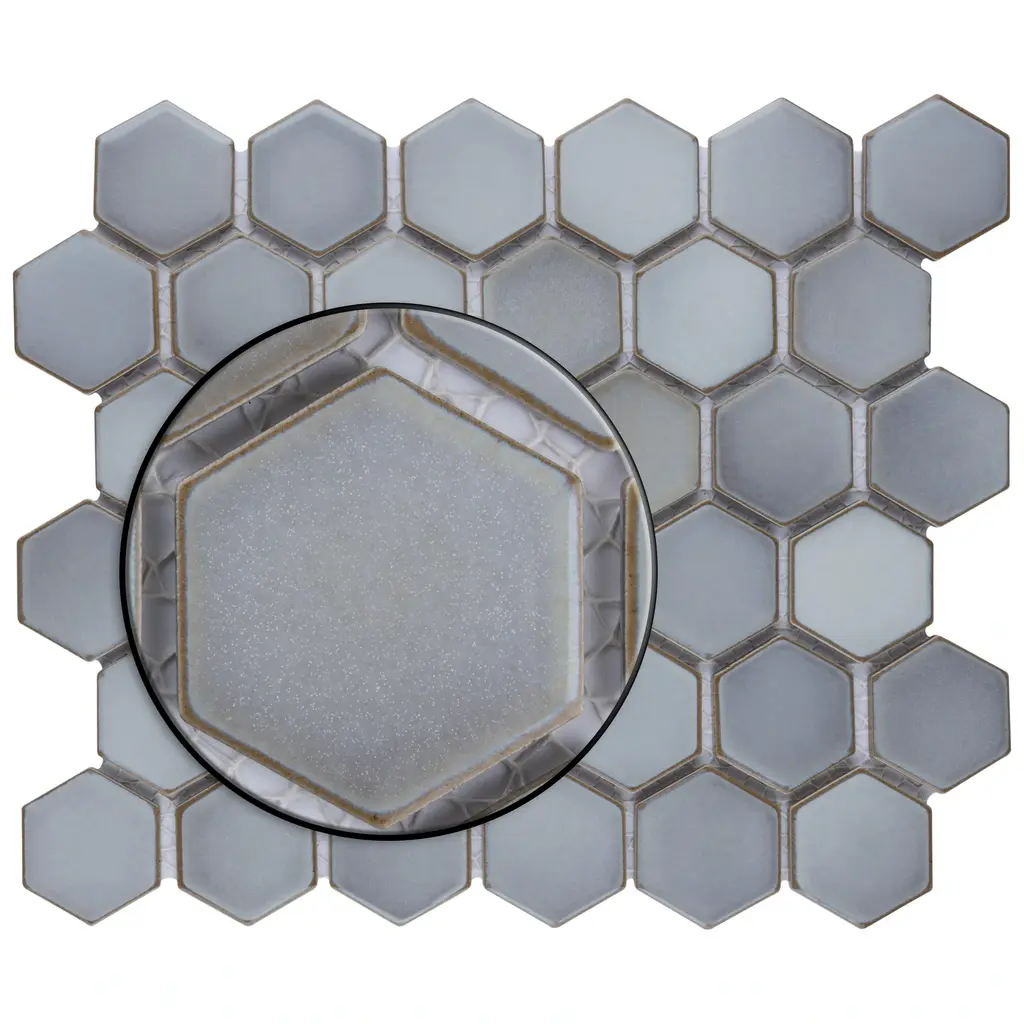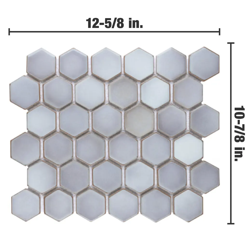 As a modern, enlarged deviation from the classic hexagon mosaic, our Hudson Due 2 in. Hex Grey Porcelain Floor and Wall Mosaic Tile instantly elevates spaces through a refreshing dose of geometric design. Featuring a reactive glaze with an eye-drop effect, these tiles have hues of grey that blend to taupe around the edges. This porcelain mosaic floor and wall tile creates a uniquely sporadic design through a pleasing mixture of cool-toned tints with additional dimension added by the smooth, high-gloss finish. Its impervious and frost-resistant features make this an ideal choice for both commercial and residential indoor and outdoor floor and wall installations including, kitchen backsplashes, bathroom showers and accent walls. This hexagon mosaic can be used as a whole sheet or cut into smaller strips as an accent piece. It is a perfect choice on its own or coordinated with other colors in our Hudson Due Hex series. Tile is the better choice for your space. This tile is made from natural ingredients, making it a healthy choice as it is free from allergens, VOCs, formaldehyde and PVC. 9.7 square feet, 10 pieces per case. Case weight is 20.78 lbs. Grade 1, first-quality porcelain tile for floor and wall use 10.88 in. width x 12.63 in. length x 0.19 in. thick mesh-mounted mosaic Glazed, smooth finish with a high sheen and slight variation in tone PEI Rating IV has high resistance to abrasion and is suitable for heavy-duty residential and commercial kitchens, hotels, exhibition and sales rooms with some dirt conditions Impervious tiles have a water absorption of less than 0.5% for indoor and outdoor use and are frost resistant This tile is not ADA approved for slip resistance with a DCOF value less than 0.42. Completely frost resistant for indoor or outdoor applications; use a latex-modified thinset for acceptable bond strength Please note: A sample of this product may be a partial piece cut from the full size tile in order to provide an affordable and convenient way for customers to judge the quality and finish of this item. Samples are not returnable.