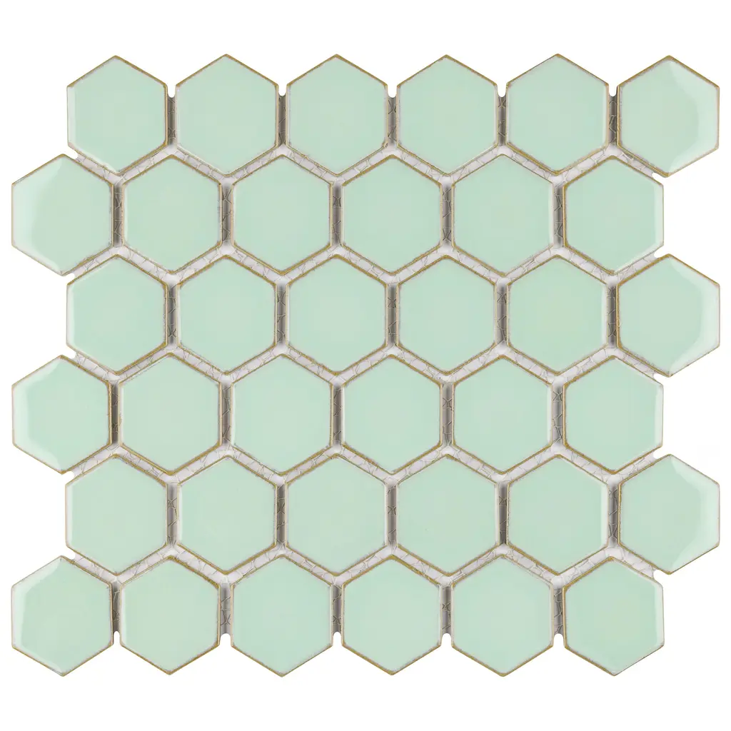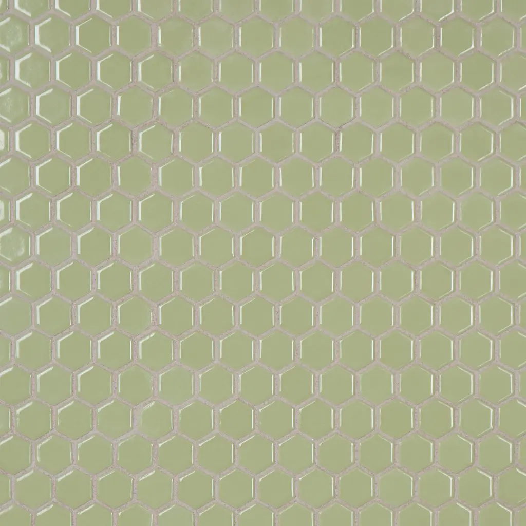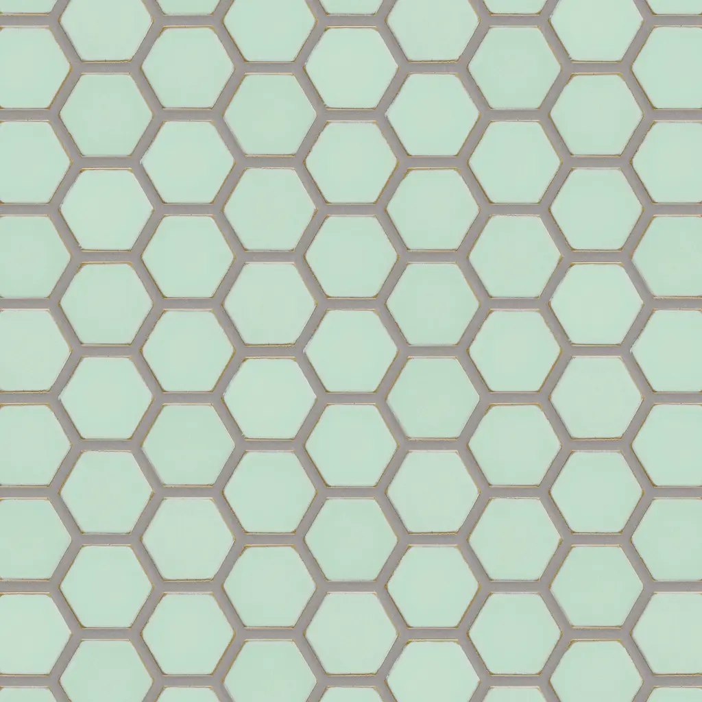As a modern, enlarged deviation from the classic hexagon mosaic, our Hudson Due 2 in. Hex Light Green Porcelain Floor and Wall Mosaic Tile instantly elevates spaces through a refreshing dose of geometric design. This porcelain tile features a soft light green color tone that blends to taupe around the edges with a smooth glazed finish. It offers a versatile appearance that is unique yet simplistic enough to integrate into any design, ranging from traditional style renovations to modern home projects. Its impervious, frost resistant, and durable features make it an ideal choice for both commercial and residential indoor and outdoor installations including, kitchens, bathrooms, backsplashes, showers, hallways, entryways, patios, and fireplace facades. This tile is a perfect choice on its own or coordinated with other products in the Hudson Due Hex series. Tile is the better choice for your space. This tile is made from natural ingredients, making it a healthy choice as it is free from allergens, VOCs, formaldehyde, and PVC. 9.7 square feet, 10 pieces per case. Case weight is 20.78 lbs. Grade 1, first-quality porcelain tile for floor and wall use 10.88 in. width x 12.63 in. length x 0.19 in. thick mesh-mounted mosaic Glazed, smooth finish with a high sheen and slight variation in tone PEI Rating IV has high resistance to abrasion and is suitable for heavy-duty residential and commercial kitchens, hotels, exhibition and sales rooms with some dirt conditions Impervious tiles have a water absorption of less than 0.5% for indoor and outdoor use and are frost resistant This tile is not ADA approved for slip resistance with a DCOF value less than 0.42. Completely frost resistant for indoor or outdoor applications; use a latex-modified thinset for acceptable bond strength Please note: A sample of this product may be a partial piece cut from the full size tile in order to provide an affordable and convenient way for customers to judge the quality and finish of this item. Samples are not returnable.