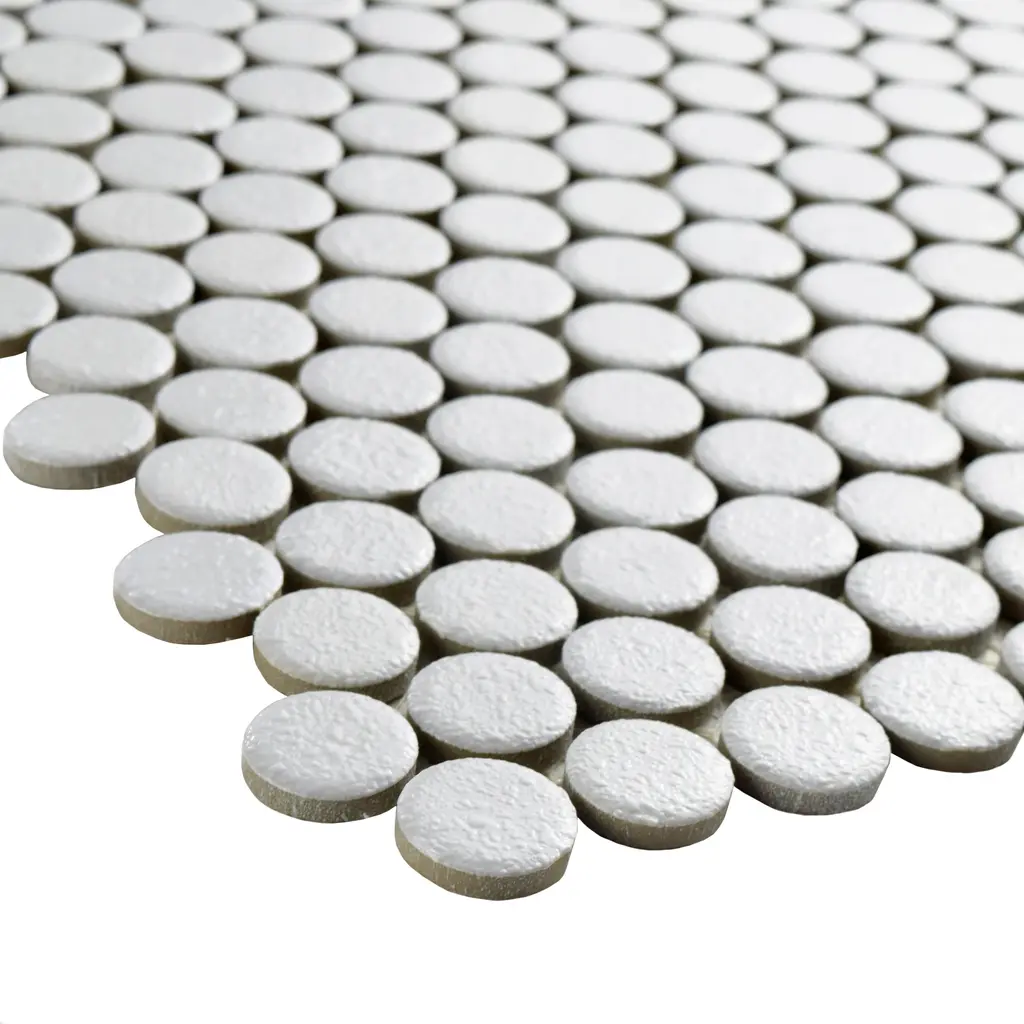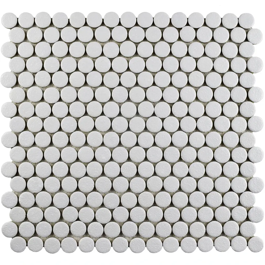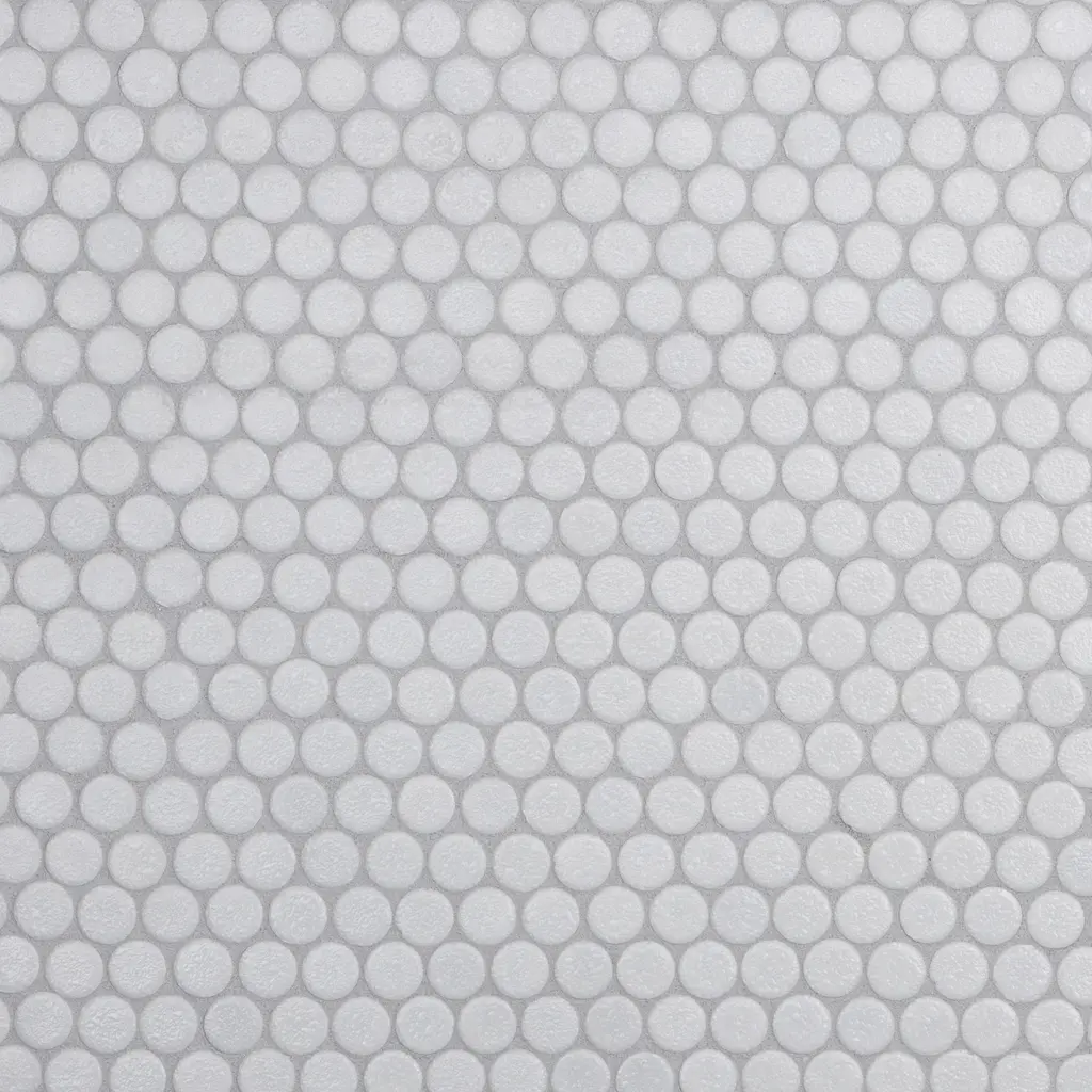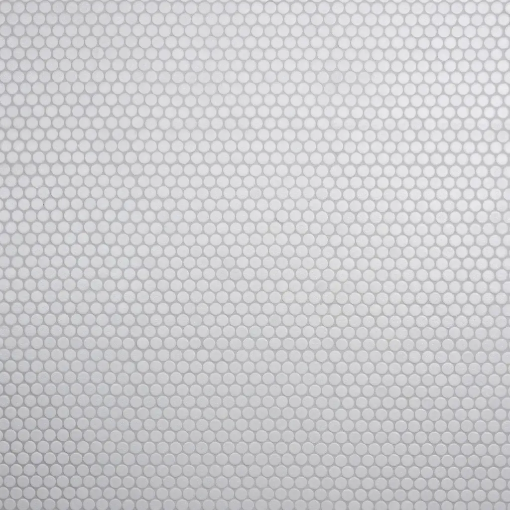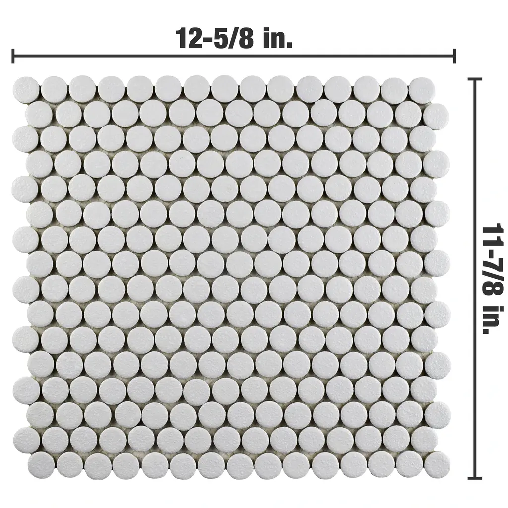 Our Hudson Penny Round Crystalline White Porcelain Mosaic Tile is a beautifully tranquil update on the timeless penny round design. Featuring a mottled glazed surface, these tiles have a muted white color palette. This mosaic creates a classic and versatile look with additional dimension added by the raised smooth, high-gloss finish. Its impervious and frost-resistant features make this penny tile an ideal choice for indoor and outdoor floor and wall installations including, kitchen backsplashes, bathroom showers and accent walls. This penny round tile can be used as a whole sheet or cut into smaller strips as an accent piece. It is a perfect choice on its own or coordinated with other colors in our Hudson Penny Round series. 10.5 square feet, 10 pieces per case. Case weight is 18.5 lbs. Grade 1, first-quality porcelain tile for floor and wall use 11.88 in. width x 12.63 in. length x 0.21 in. thick mesh-mounted mosaic Glazed, smooth finish with a high sheen and uniform appearance in tone PEI Rating III is suitable for medium-duty residential floors including kitchens, halls, corridors, balconies, terraces and areas used more often with normal footwear and small amounts of dirt Impervious tiles have a water absorption of less than 0.5% for indoor and outdoor use and are frost resistant This tile is not ADA approved for slip resistance with a DCOF value less than 0.42. Completely frost resistant for indoor or outdoor applications; use a latex-modified thinset for acceptable bond strength Please note: A sample of this product may be a partial piece cut from the full size tile in order to provide an affordable and convenient way for customers to judge the quality and finish of this item. Samples are not returnable.