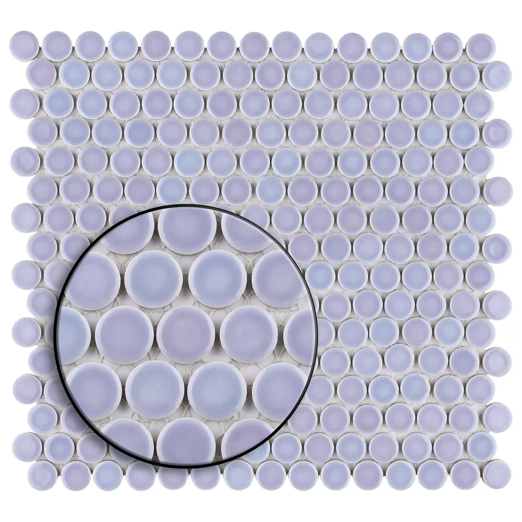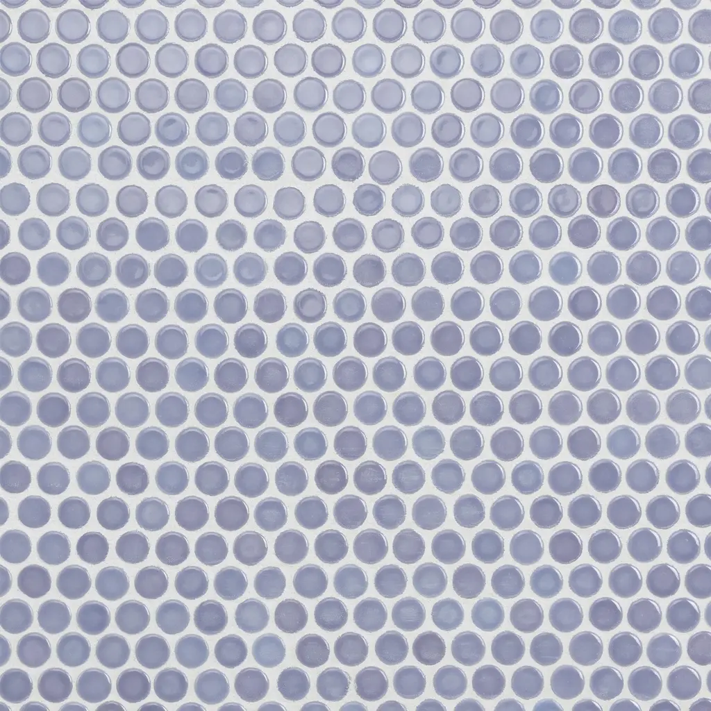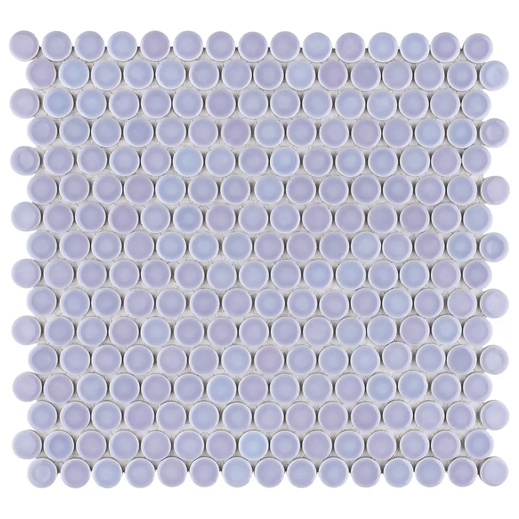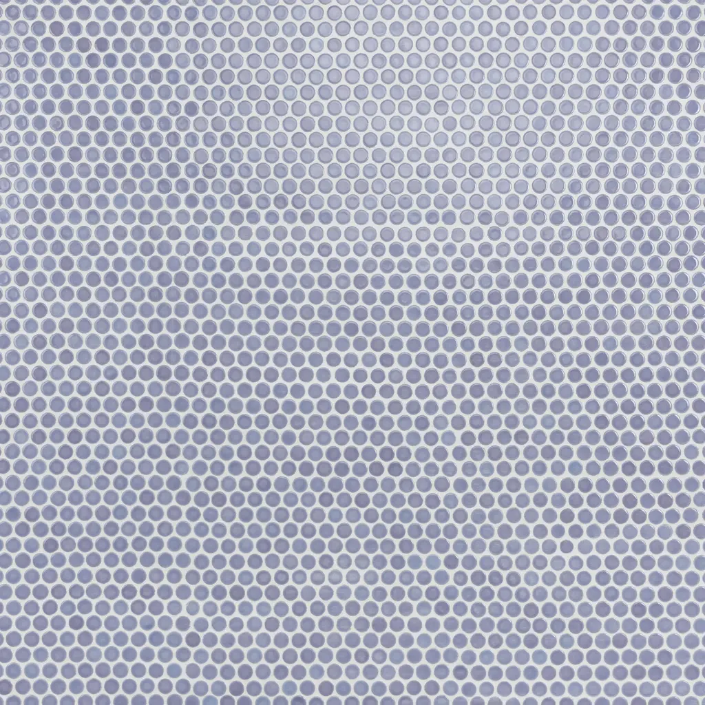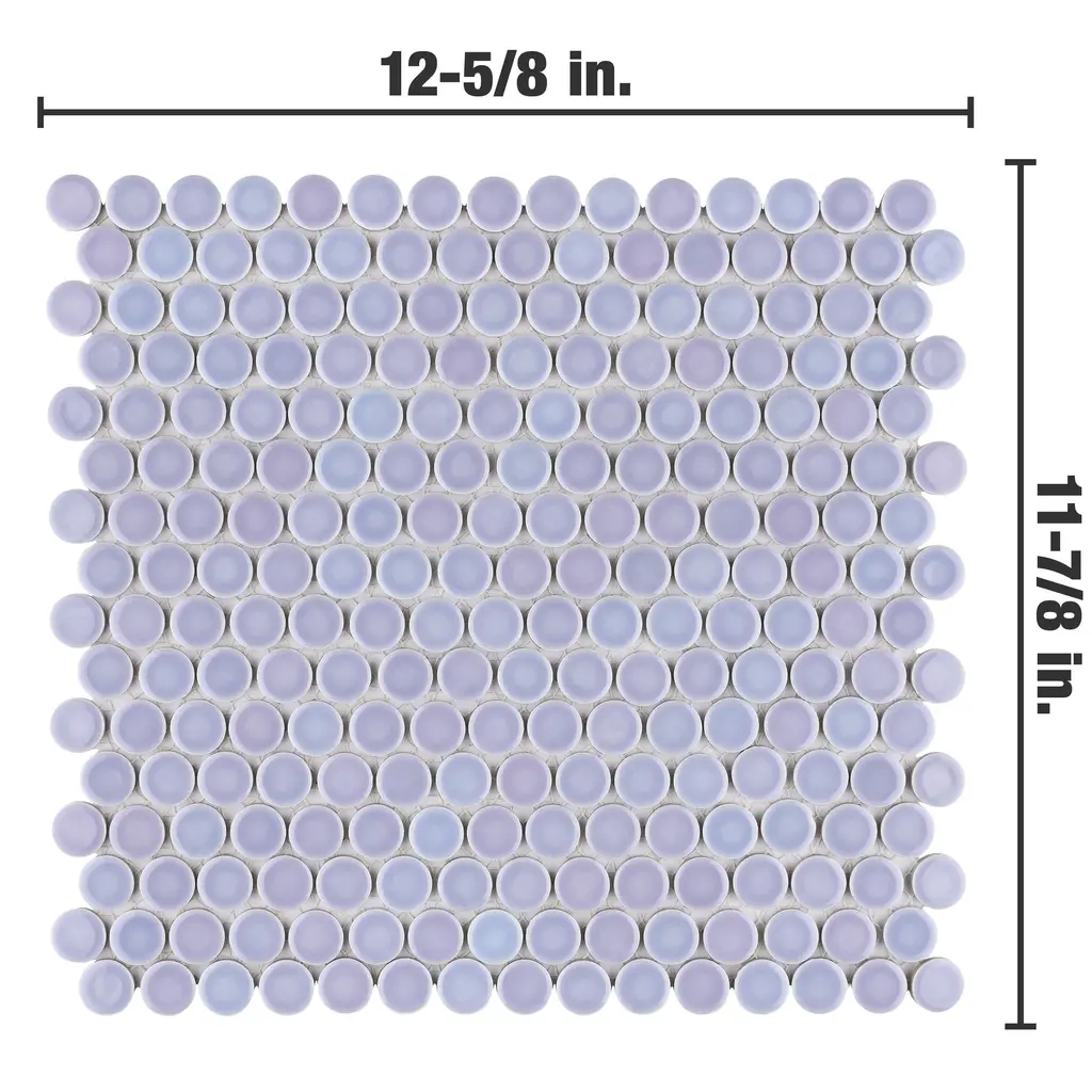 Our Hudson Penny Round Lavender Porcelain Mosaic Tile is a beautifully tranquil update on the timeless penny round design. Featuring a reactive glaze with an eye-drop effect, these tiles have hues of watercolor lavender that blend to white around the edges. This mosaic is a pleasing mixture of cool-toned tints with additional dimension added by the smooth, high-gloss finish. Its impervious and frost-resistant features make this penny tile an ideal choice for indoor and outdoor floor and wall installations including, kitchen backsplashes, bathroom showers and accent walls. This penny round tile can be used as a whole sheet or cut into smaller strips as an accent piece. It is a perfect choice on its own or coordinated with other colors in our Hudson Penny Round series. 10.5 square feet, 10 pieces per case. Case weight is 17.5 lbs. Grade 1, first-quality porcelain tile for floor and wall use 11.88 in. width x 12.63 in. length x 0.21 in. thick mesh-mounted mosaic Glazed, smooth finish with a high sheen and moderate variation in tone PEI Rating IV has high resistance to abrasion and is suitable for heavy-duty residential and commercial kitchens, hotels, exhibition and sales rooms with some dirt conditions Impervious tiles have a water absorption of less than 0.5% for indoor and outdoor use and are frost resistant This tile is not ADA approved for slip resistance with a DCOF value less than 0.42. Completely frost resistant for indoor or outdoor applications; use a latex-modified thinset for acceptable bond strength Please note: A sample of this product may be a partial piece cut from the full size tile in order to provide an affordable and convenient way for customers to judge the quality and finish of this item. Samples are not returnable.