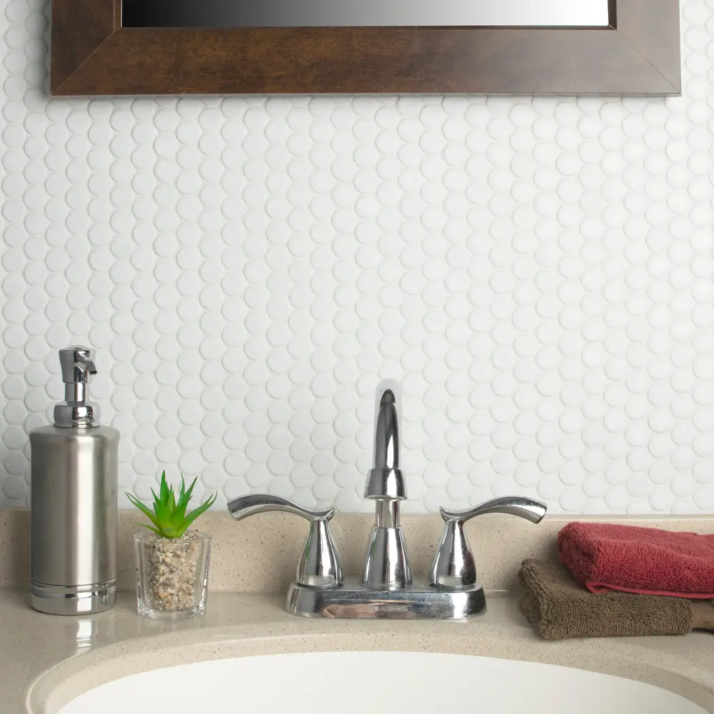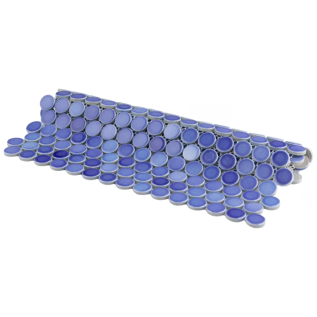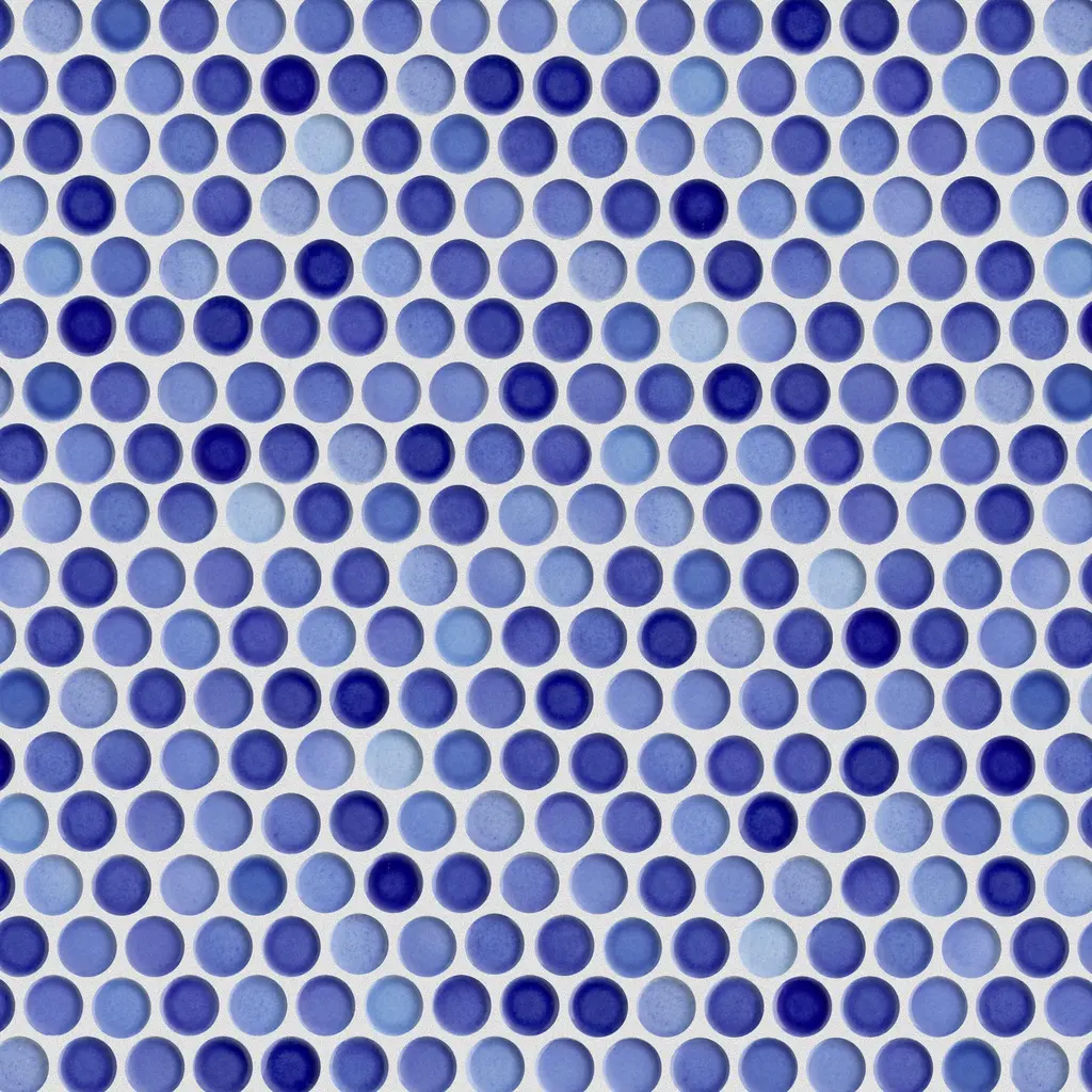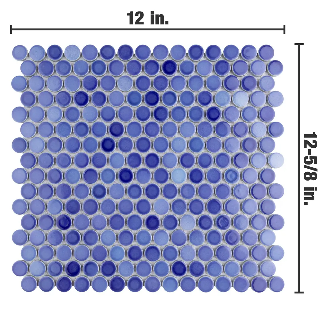 Offering a mosaic look, our Hudson Penny Round Niagara Porcelain Floor and Wall Tile features a smooth, glossy finish, providing decorative appeal that adapts to a variety of stylistic contexts. With its impervious, frost-resistant features, this blue round mosaic is an ideal selection for both indoor and outdoor residential installations, including kitchens, bathrooms, backsplashes, showers, hallways and fireplace facades. This tile is a perfect choice on its own or paired with other products in the Hudson Collection. Tile is the better choice for your space! 10.5 square feet, 10 pieces per case. Case weight is 18.02 lbs. Grade 1, first-quality porcelain tile for floor and wall use 11.88 in. width x 12.63 in. length x 0.21 in. thick mesh-mounted mosaic Glazed, smooth finish with a high sheen and slight variation in tone PEI Rating III is suitable for medium-duty residential floors including kitchens, halls, corridors, balconies, terraces and areas used more often with normal footwear and small amounts of dirt Impervious tiles have a water absorption of less than 0.5% for indoor and outdoor use and are frost resistant This tile is not ADA approved for slip resistance with a DCOF value less than 0.42. Completely frost resistant for indoor or outdoor applications; use a latex-modified thinset for acceptable bond strength Please note: A sample of this product may be a partial piece cut from the full size tile in order to provide an affordable and convenient way for customers to judge the quality and finish of this item. Samples are not returnable.
