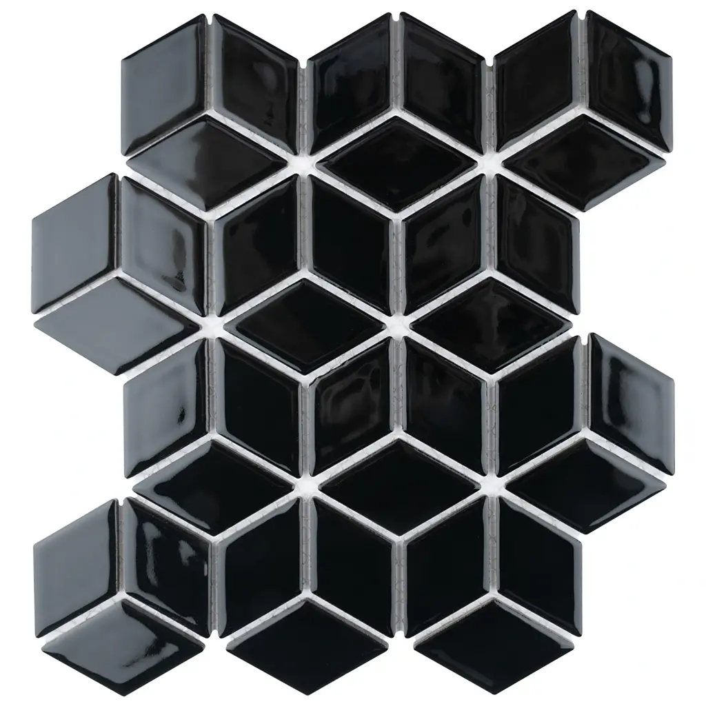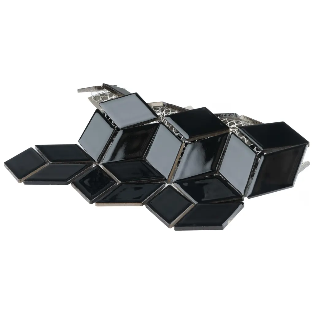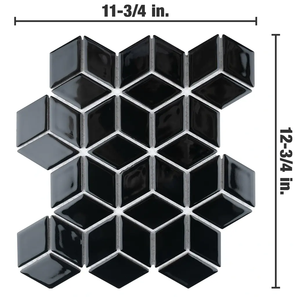 Our Hudson Rhombus Glossy Black Porcelain Mosaic Floor and Wall Tile instantly elevates spaces through a refreshing dose of geometric design. As an innovative twist on the classic mosaic, this product is comprised of diamond shaped chips in black with a smooth surface. Glossy diamonds are arranged on an interlocking mesh to create a seamless installation. This minimalistic geometric porcelain mosaic is unique yet simplistic enough to integrate into any design, ranging from traditional style renovations to modern home projects. Its impervious and frost-resistant features make this porcelain mosaic tile an ideal choice for both commercial and residential indoor and outdoor floor and wall installations including, kitchens, backsplashes, bathrooms, showers, entryways, fireplace facades and patios. Tile is the better choice for your space. This tile is made from natural ingredients, making it a healthy choice as it is free from allergens, VOCs, formaldehyde, and PVC. 8.56 square feet, 10 pieces per case. Case weight is 20.94 lbs. Grade 1, first-quality porcelain tile for floor and wall use 10.25 in. width x 11.75 in. length x 0.23 in. thick mesh-mounted mosaic Glazed, smooth finish with a high sheen and uniform appearance in tone PEI Rating IV has high resistance to abrasion and is suitable for heavy-duty residential and commercial kitchens, hotels, exhibition and sales rooms with some dirt conditions Impervious tiles have a water absorption of less than 0.5% for indoor and outdoor use and are frost resistant This tile is not ADA approved for slip resistance with a DCOF value less than 0.42. Completely frost resistant for indoor or outdoor applications; use a latex-modified thinset for acceptable bond strength Please note: A sample of this product may be a partial piece cut from the full size tile in order to provide an affordable and convenient way for customers to judge the quality and finish of this item. Samples are not returnable.