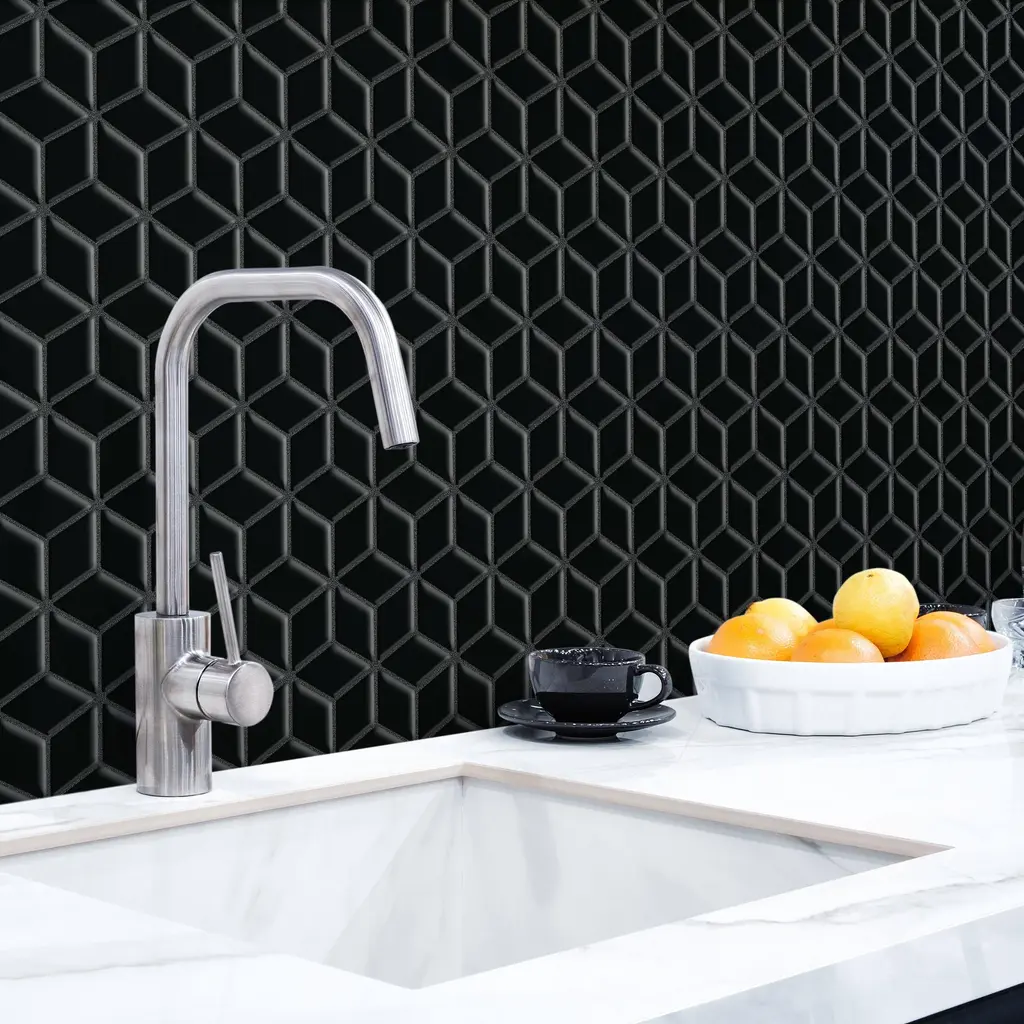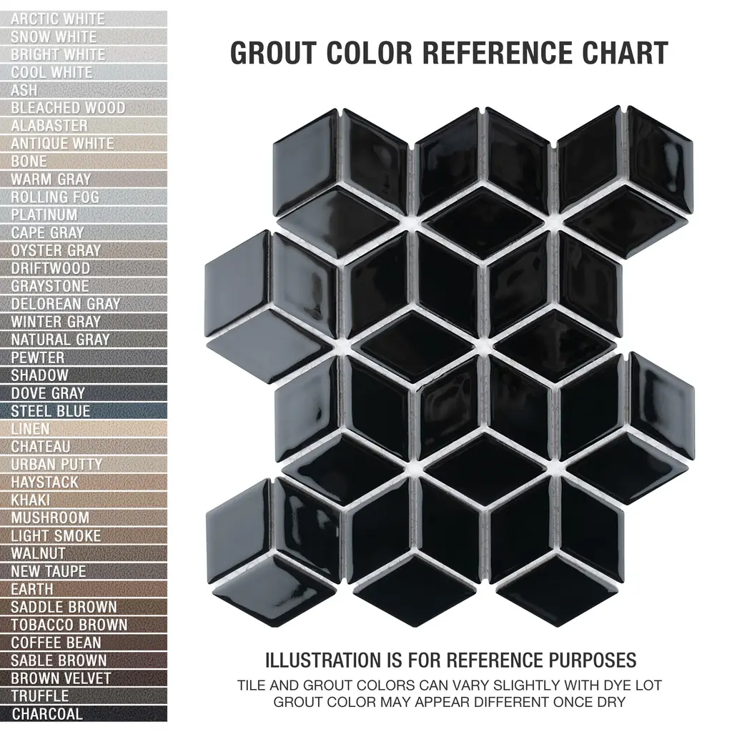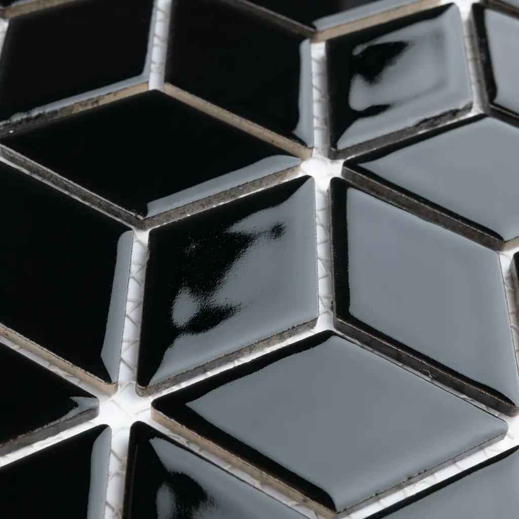Our Hudson Rhombus Glossy Black Porcelain Mosaic Floor and Wall Tile instantly elevates spaces through a refreshing dose of geometric design. As an innovative twist on the classic mosaic, this product is comprised of diamond shaped chips in black with a smooth surface. Glossy diamonds are arranged on an interlocking mesh to create a seamless installation. This minimalistic geometric porcelain mosaic is unique yet simplistic enough to integrate into any design, ranging from traditional style renovations to modern home projects. Its impervious and frost-resistant features make this porcelain mosaic tile an ideal choice for both commercial and residential indoor and outdoor floor and wall installations including, kitchens, backsplashes, bathrooms, showers, entryways, fireplace facades and patios. Tile is the better choice for your space. This tile is made from natural ingredients, making it a healthy choice as it is free from allergens, VOCs, formaldehyde, and PVC. 8.56 square feet, 10 pieces per case. Case weight is 20.94 lbs. Grade 1, first-quality porcelain tile for floor and wall use 10.25 in. width x 11.75 in. length x 0.23 in. thick mesh-mounted mosaic Glazed, smooth finish with a high sheen and uniform appearance in tone PEI Rating IV has high resistance to abrasion and is suitable for heavy-duty residential and commercial kitchens, hotels, exhibition and sales rooms with some dirt conditions Impervious tiles have a water absorption of less than 0.5% for indoor and outdoor use and are frost resistant This tile is not ADA approved for slip resistance with a DCOF value less than 0.42. Completely frost resistant for indoor or outdoor applications; use a latex-modified thinset for acceptable bond strength Please note: A sample of this product may be a partial piece cut from the full size tile in order to provide an affordable and convenient way for customers to judge the quality and finish of this item. Samples are not returnable.