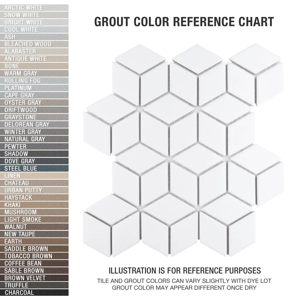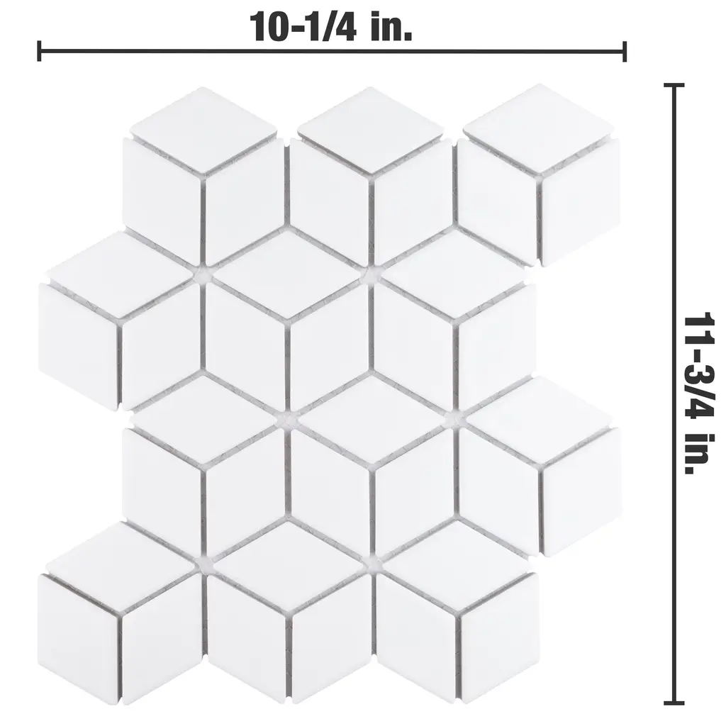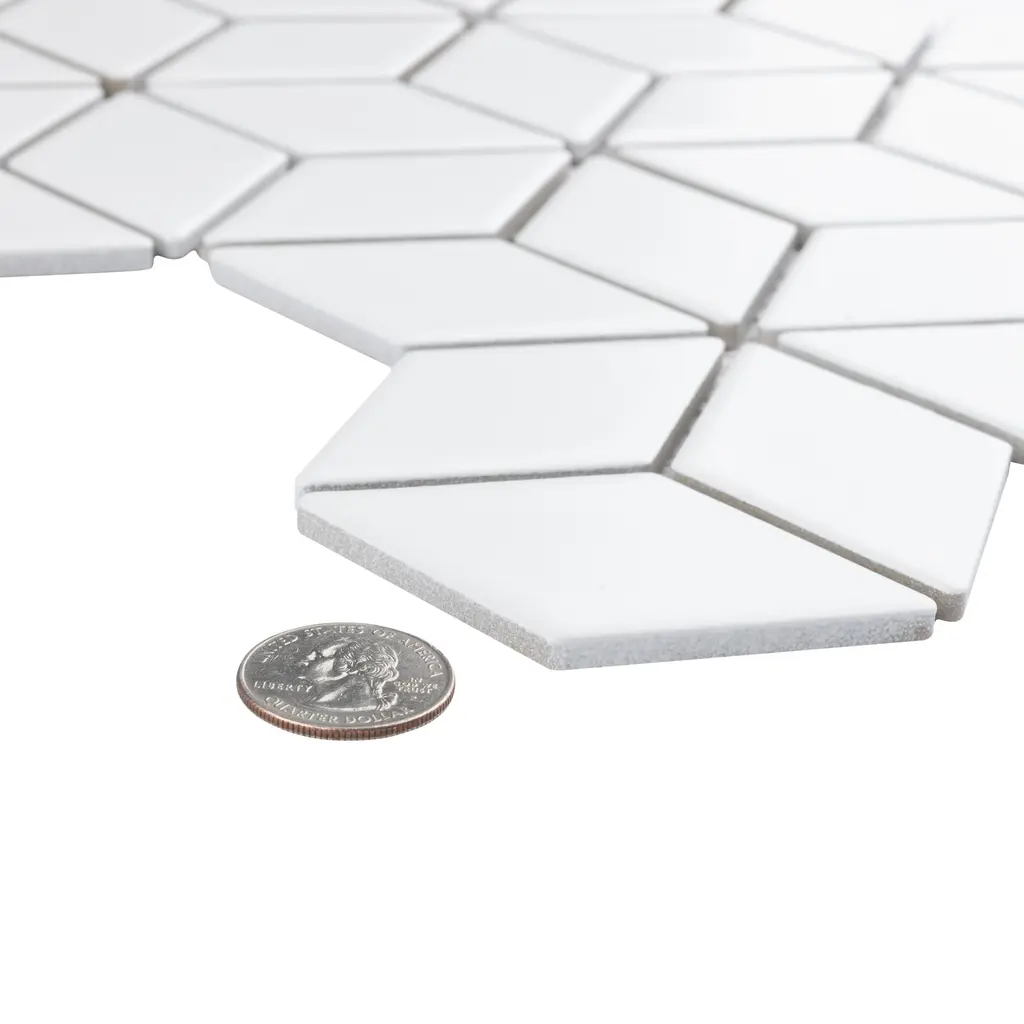 Our Hudson Rhombus Matte White Porcelain Mosaic Floor and Wall Tile instantly elevates spaces through a refreshing dose of geometric design. As an innovative twist on the classic mosaic, this product is comprised of diamond shaped chips in white with a smooth surface. Matte diamonds are arranged on an interlocking mesh to create a seamless installation. This minimalistic geometric porcelain mosaic is unique yet simplistic enough to integrate into any design, ranging from traditional style renovations to modern home projects. Its impervious and frost-resistant features make this porcelain mosaic tile an ideal choice for both commercial and residential indoor and outdoor floor and wall installations including, kitchens, backsplashes, bathrooms, showers, entryways, fireplace facades and patios. Tile is the better choice for your space. This tile is made from natural ingredients, making it a healthy choice as it is free from allergens, VOCs, formaldehyde, and PVC. 8.56 square feet, 10 pieces per case. Case weight is 20.94 lbs. Grade 1, first-quality porcelain tile for floor and wall use 10.25 in. width x 11.75 in. length x 0.23 in. thick mesh-mounted mosaic Glazed, smooth finish with a low sheen and uniform appearance in tone PEI Rating IV has high resistance to abrasion and is suitable for heavy-duty residential and commercial kitchens, hotels, exhibition and sales rooms with some dirt conditions Impervious tiles have a water absorption of less than 0.5% for indoor and outdoor use and are frost resistant This tile is not ADA approved for slip resistance with a DCOF value less than 0.42. Completely frost resistant for indoor or outdoor applications; use a latex-modified thinset for acceptable bond strength Please note: A sample of this product may be a partial piece cut from the full size tile in order to provide an affordable and convenient way for customers to judge the quality and finish of this item. Samples are not returnable.
