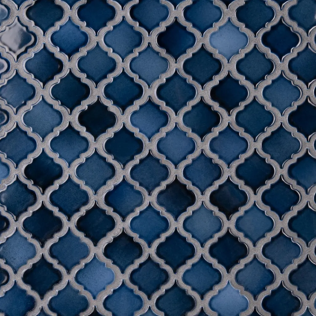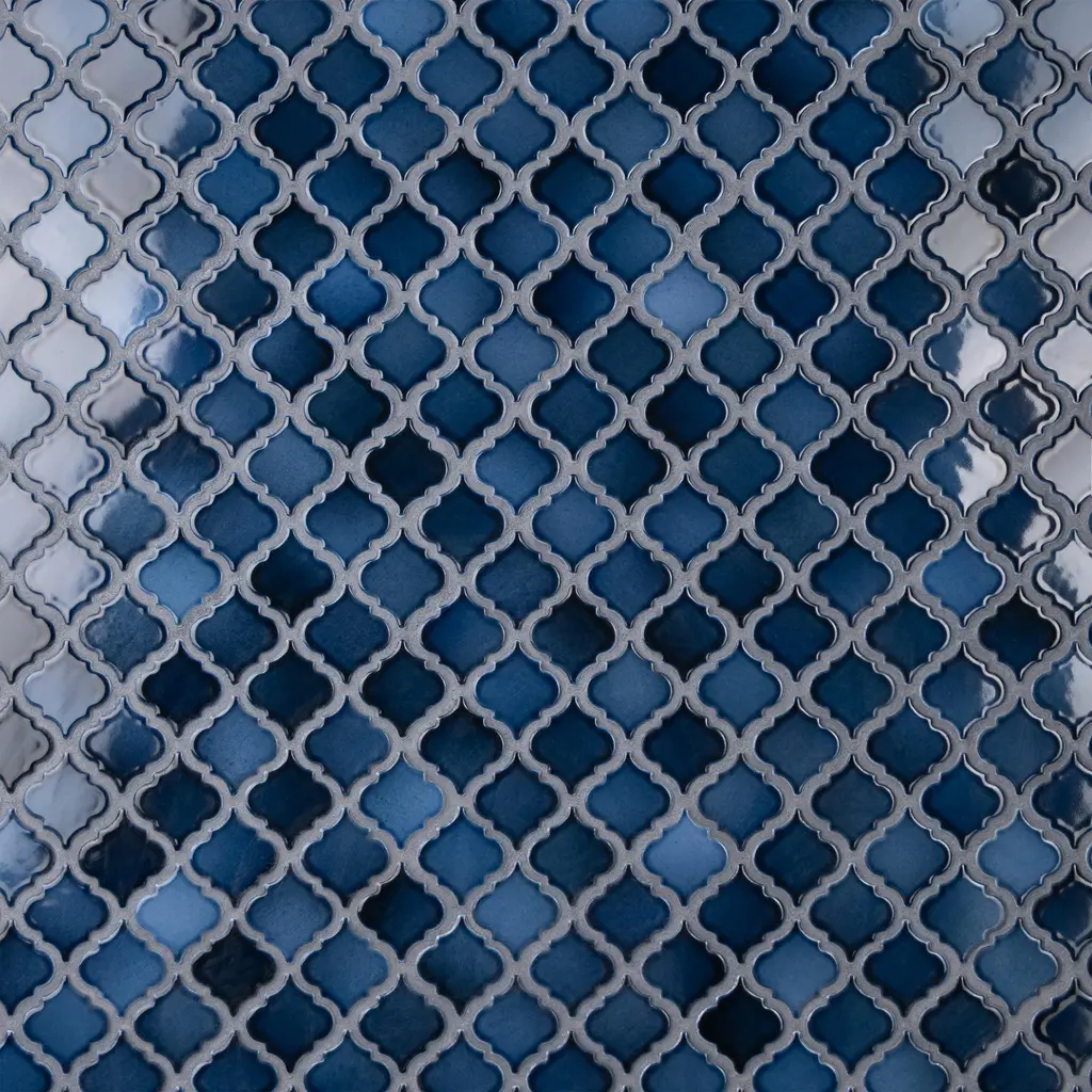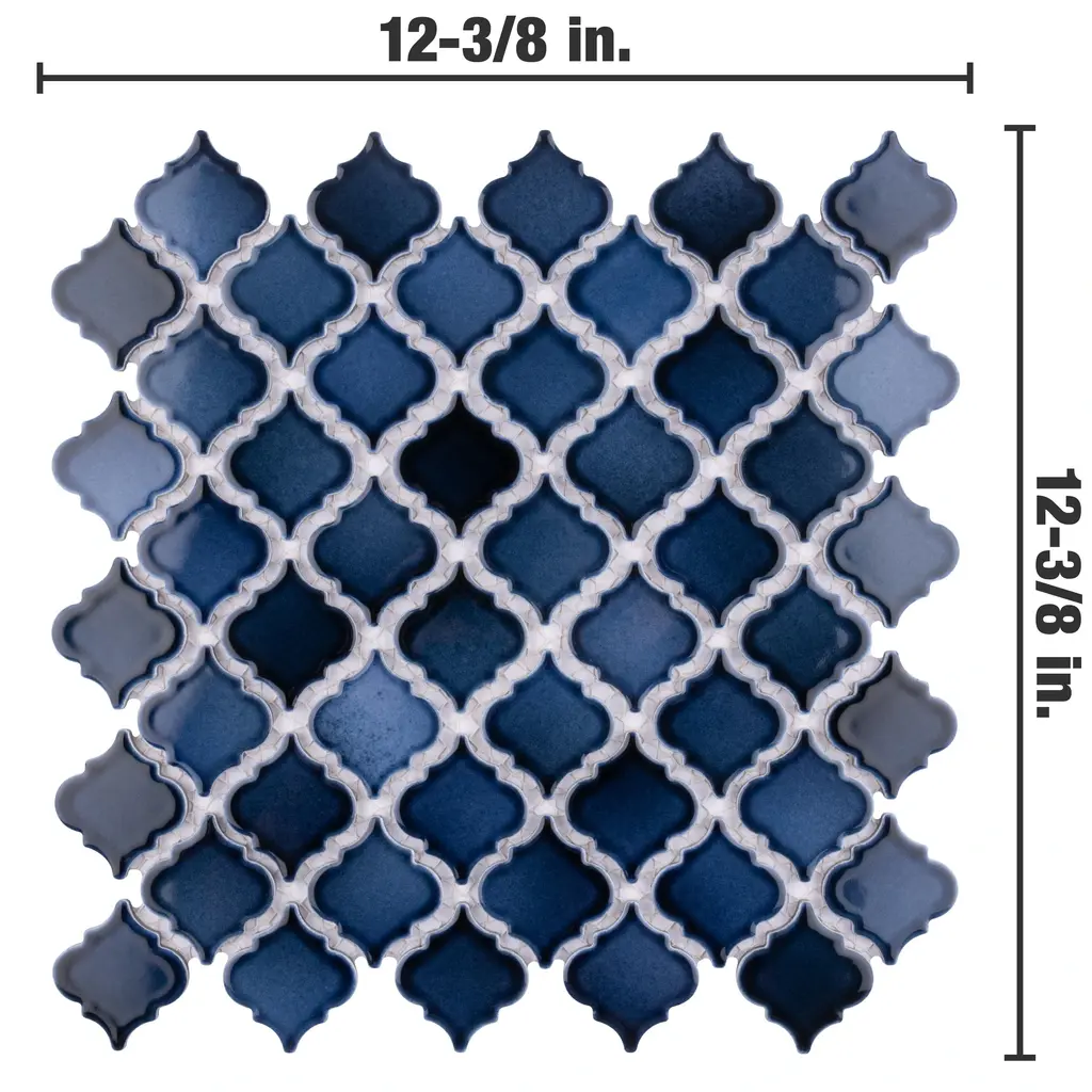 Our Hudson Tangier Midnight Porcelain Floor and Wall Mosaic Tile instantly elevates spaces through its distinctive lantern shaped design. Featuring a reactive glaze with an eye-drop effect, these porcelain tiles have varying hues of light and dark denim blue that blend to white around the edges. This floor and wall mosaic creates a uniquely sporadic design through a pleasing mixture of cool-toned tints with additional dimension added by the smooth, high-gloss finish. Its impervious and frost-resistant features make this lantern mosaic tile an ideal choice for indoor and outdoor floor and wall installations including, kitchens, backsplashes, bathrooms, showers, entryways, fireplace facades and patios. It is a perfect choice on its own or coordinated with other colors in our Hudson Tangier Collection. Please note, the unique reactive glazing technique creates a stunning one of a kind effect and may cause high variation between dye lots. Tile is the better choice for your space. This tile is made from natural ingredients, making it a healthy choice as it is free from allergens, VOCs, formaldehyde and PVC. 11.0 square feet, 10 pieces per case. Case weight is 21.7 lbs. Grade 1, first-quality porcelain tile for floor and wall use 12.38 in. width x 12.38 in. length x 0.21 in. thick mesh-mounted mosaic Glazed, smooth finish with a high sheen and slight variation in tone PEI Rating III is suitable for medium-duty residential floors including kitchens, halls, corridors, balconies, terraces and areas used more often with normal footwear and small amounts of dirt Impervious tiles have a water absorption of less than 0.5% for indoor and outdoor use and are frost resistant This tile is not ADA approved for slip resistance with a DCOF value less than 0.42. Completely frost resistant for indoor or outdoor applications; use a latex-modified thinset for acceptable bond strength Please note: A sample of this product may be a partial piece cut from the full size tile in order to provide an affordable and convenient way for customers to judge the quality and finish of this item. Samples are not returnable.