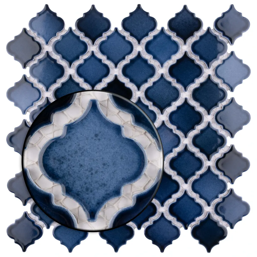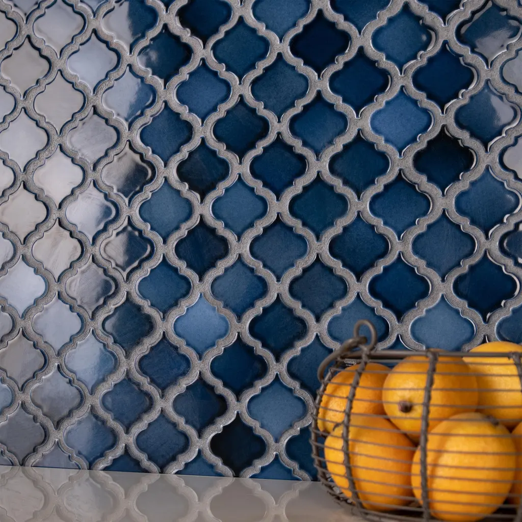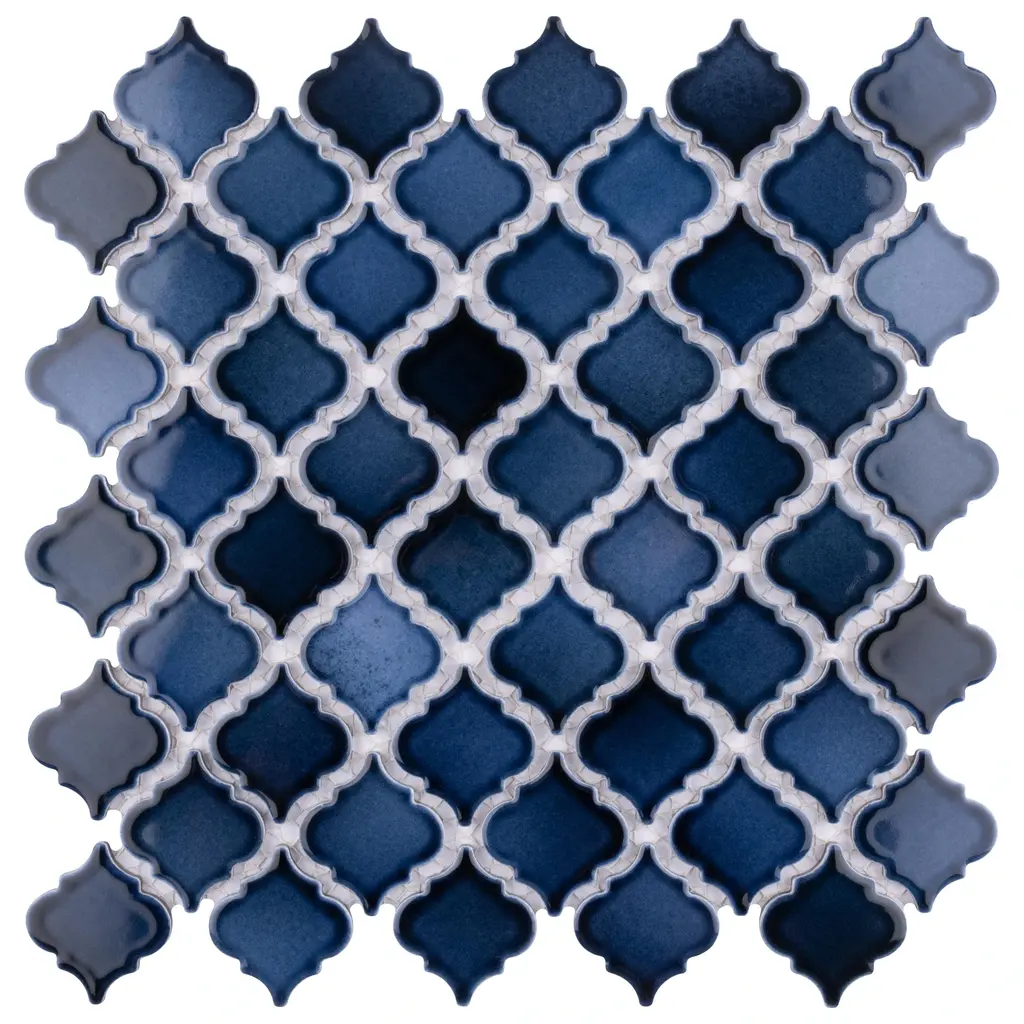 Our Hudson Tangier Midnight Porcelain Floor and Wall Mosaic Tile instantly elevates spaces through its distinctive lantern shaped design. Featuring a reactive glaze with an eye-drop effect, these porcelain tiles have varying hues of light and dark denim blue that blend to white around the edges. This floor and wall mosaic creates a uniquely sporadic design through a pleasing mixture of cool-toned tints with additional dimension added by the smooth, high-gloss finish. Its impervious and frost-resistant features make this lantern mosaic tile an ideal choice for indoor and outdoor floor and wall installations including, kitchens, backsplashes, bathrooms, showers, entryways, fireplace facades and patios. It is a perfect choice on its own or coordinated with other colors in our Hudson Tangier Collection. Please note, the unique reactive glazing technique creates a stunning one of a kind effect and may cause high variation between dye lots. Tile is the better choice for your space. This tile is made from natural ingredients, making it a healthy choice as it is free from allergens, VOCs, formaldehyde and PVC. 11.0 square feet, 10 pieces per case. Case weight is 21.7 lbs. Grade 1, first-quality porcelain tile for floor and wall use 12.38 in. width x 12.38 in. length x 0.21 in. thick mesh-mounted mosaic Glazed, smooth finish with a high sheen and slight variation in tone PEI Rating III is suitable for medium-duty residential floors including kitchens, halls, corridors, balconies, terraces and areas used more often with normal footwear and small amounts of dirt Impervious tiles have a water absorption of less than 0.5% for indoor and outdoor use and are frost resistant This tile is not ADA approved for slip resistance with a DCOF value less than 0.42. Completely frost resistant for indoor or outdoor applications; use a latex-modified thinset for acceptable bond strength Please note: A sample of this product may be a partial piece cut from the full size tile in order to provide an affordable and convenient way for customers to judge the quality and finish of this item. Samples are not returnable.