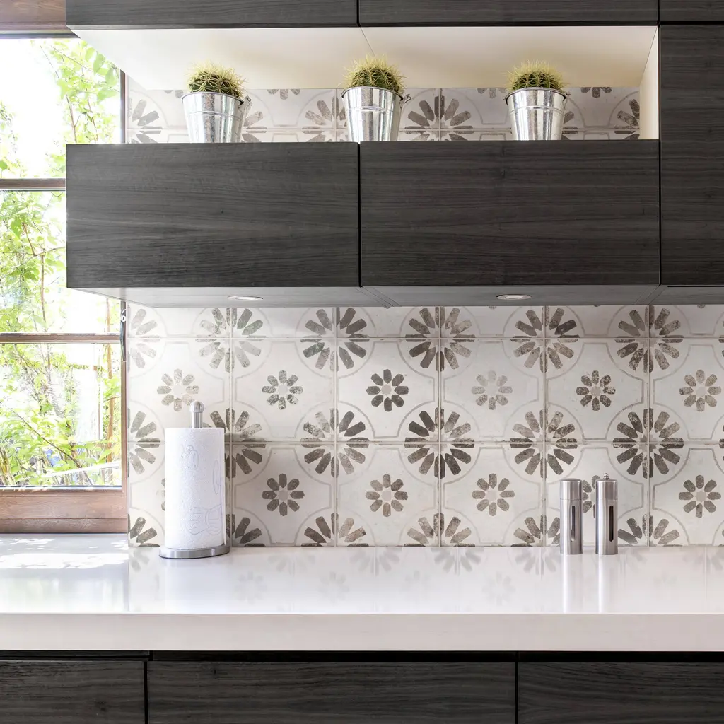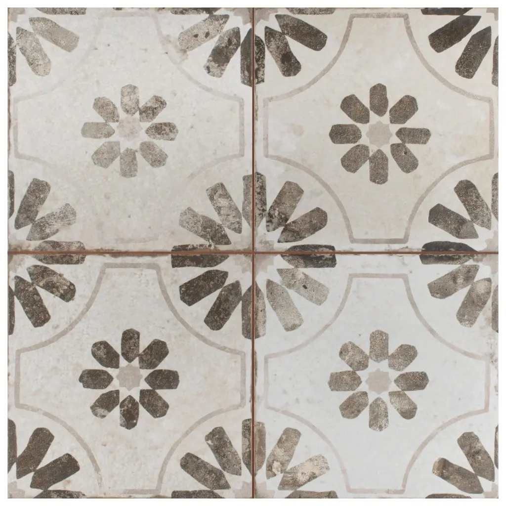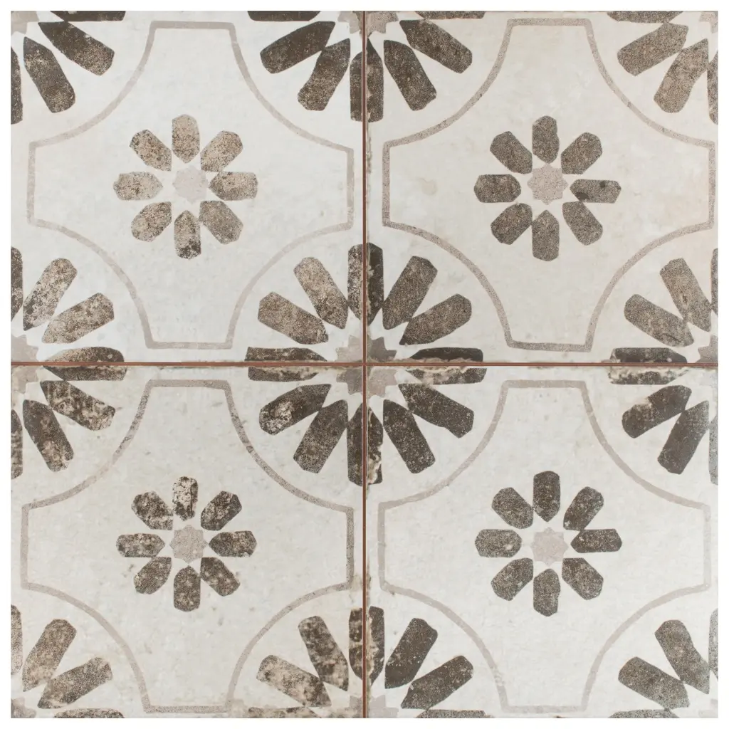 Capturing the appearance of an encaustic look, our Kings Blume Nero Ceramic Floor and Wall Tile features a slightly textured, matte finish, providing decorative appeal that adapts to a variety of stylistic contexts. Containing 7 different print variations that are randomly distributed throughout each case, this white square tile offers a one-of-a-kind look. With its semi-vitreous features, this tile is an ideal selection for indoor commercial and residential installations, including kitchens, bathrooms, backsplashes, showers, hallways, entryways and fireplace facades. This tile is a perfect choice on its own or paired with other products in the Kings Collection. Tile is the better choice for your space!