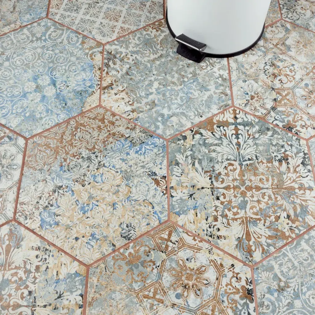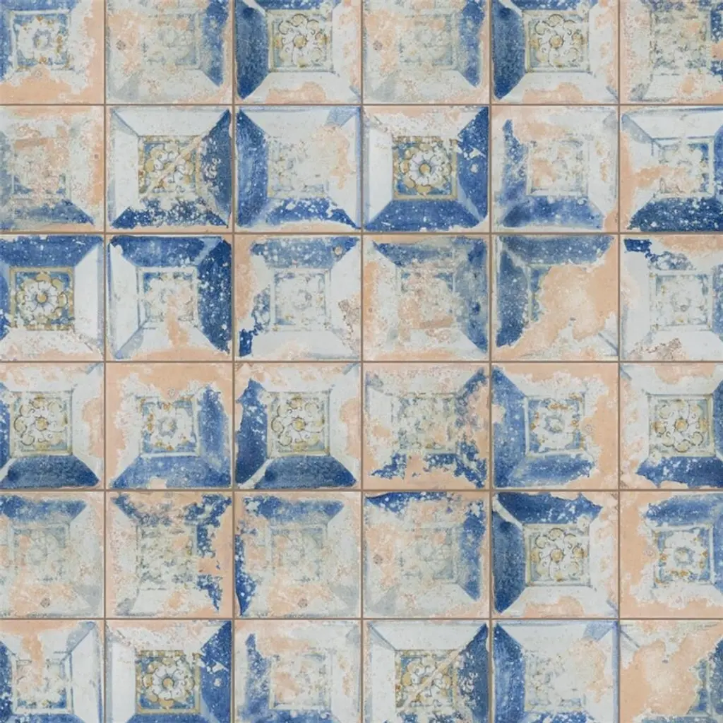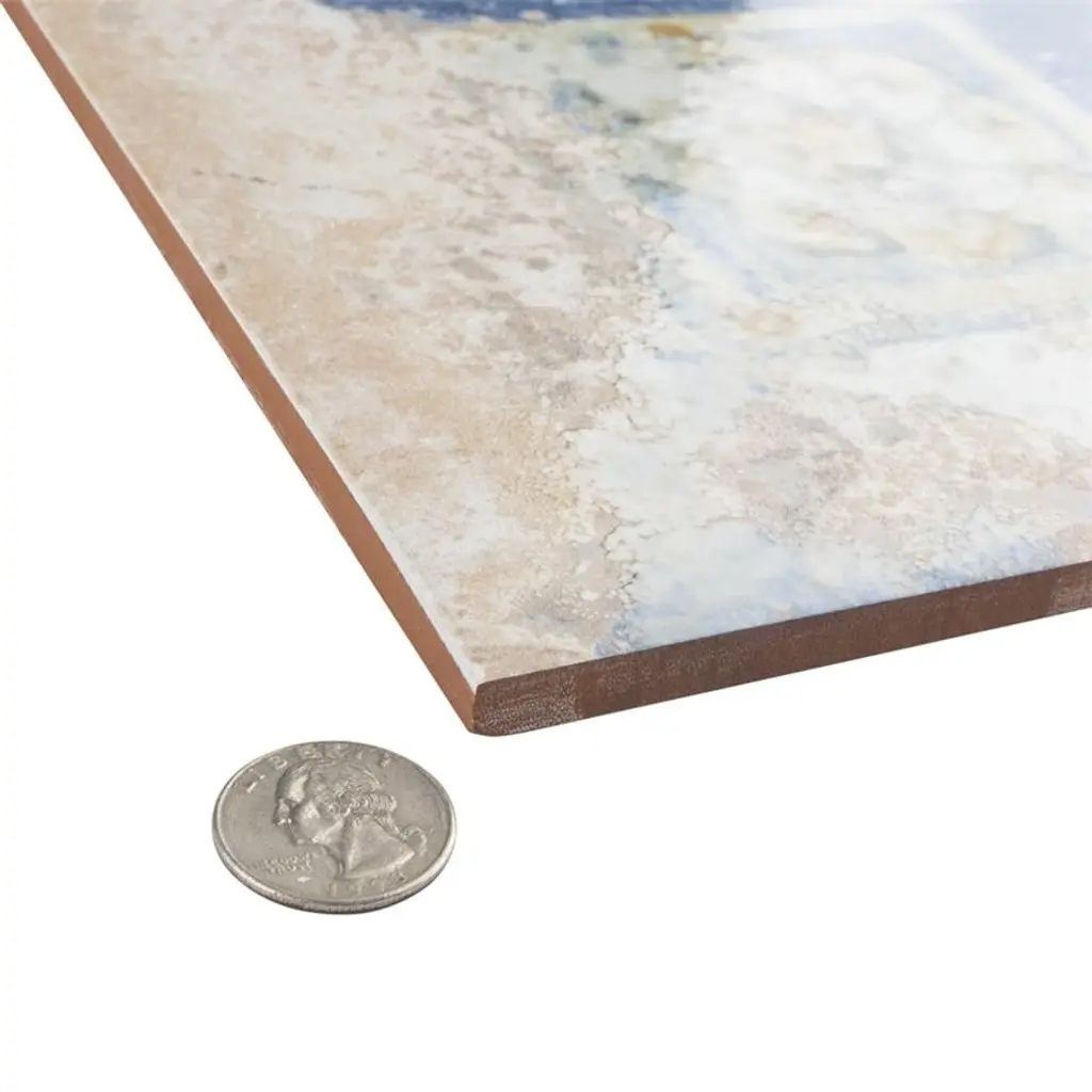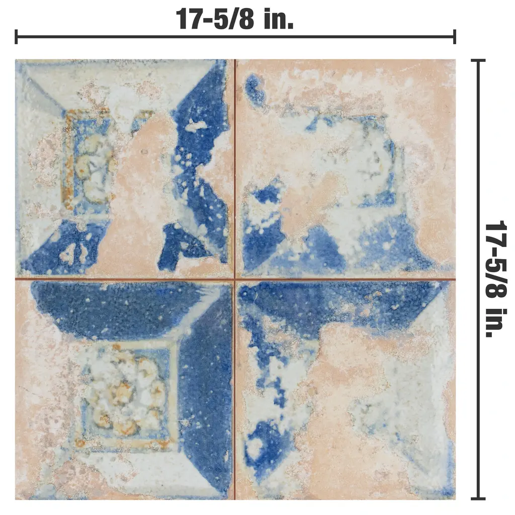 Imported from Spain, Kings Luxe Heritage Square Ceramic Floor and Wall Tile radiates old-world European elegance. This tile features decorative brushstroke patterns in faded blue and green tones that are set amongst a scuffed off-white base glaze. Designed to pay tribute to traditional tile-making, interior architect and furniture designer, Francisco Segarra, created this collection using the colors, patterns, and textures reminiscent of traditional vintage tiles. Developed using a revolutionary technology that allows the creation of different textures on the surface of each piece called Layer Tech, this tile offers decorative dimensionality. Available in 10 print variations that are randomly distributed throughout each case, the variation throughout each tile mimics an authentic aged appearance. Save time and labor spent arranging smaller square tiles and instead install these durable ceramic slabs, which have squares separated by scored grout lines. Its durable and glazed features make this tile an ideal choice for commercial and residential indoor installations including kitchens, bathrooms, backsplashes, showers, and entryways. Tile is the better choice for your space. This tile is made from natural ingredients, making it a healthy choice as it is free from allergens, VOCs, formaldehyde, and PVC. 10.95 square feet, 5 pieces per case. Case weight is 46.63 lbs. Grade 1, first-quality ceramic tile for floor and wall use 17.63 in. width x 17.63 in. length x 0.37 in. thick Glazed, mixed texture with a mixed finish and moderate variation in tone PEI Rating IV has high resistance to abrasion and is suitable for heavy-duty residential and commercial kitchens, hotels, exhibition and sales rooms with some dirt conditions Semi-Vitreous tiles have water absorption of more than 3% but less than 7% for indoor use This tile has no available COF wet rating. This tile is not ADA approved for slip resistance. Completely frost resistant for indoor or outdoor applications; use a latex-modified thinset for acceptable bond strength Please note: A sample of this product may be a partial piece cut from the full size tile in order to provide an affordable and convenient way for customers to judge the quality and finish of this item. Samples are not returnable.