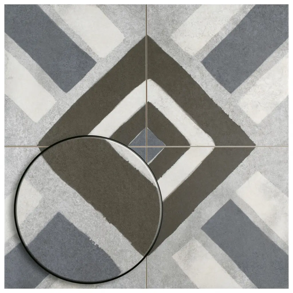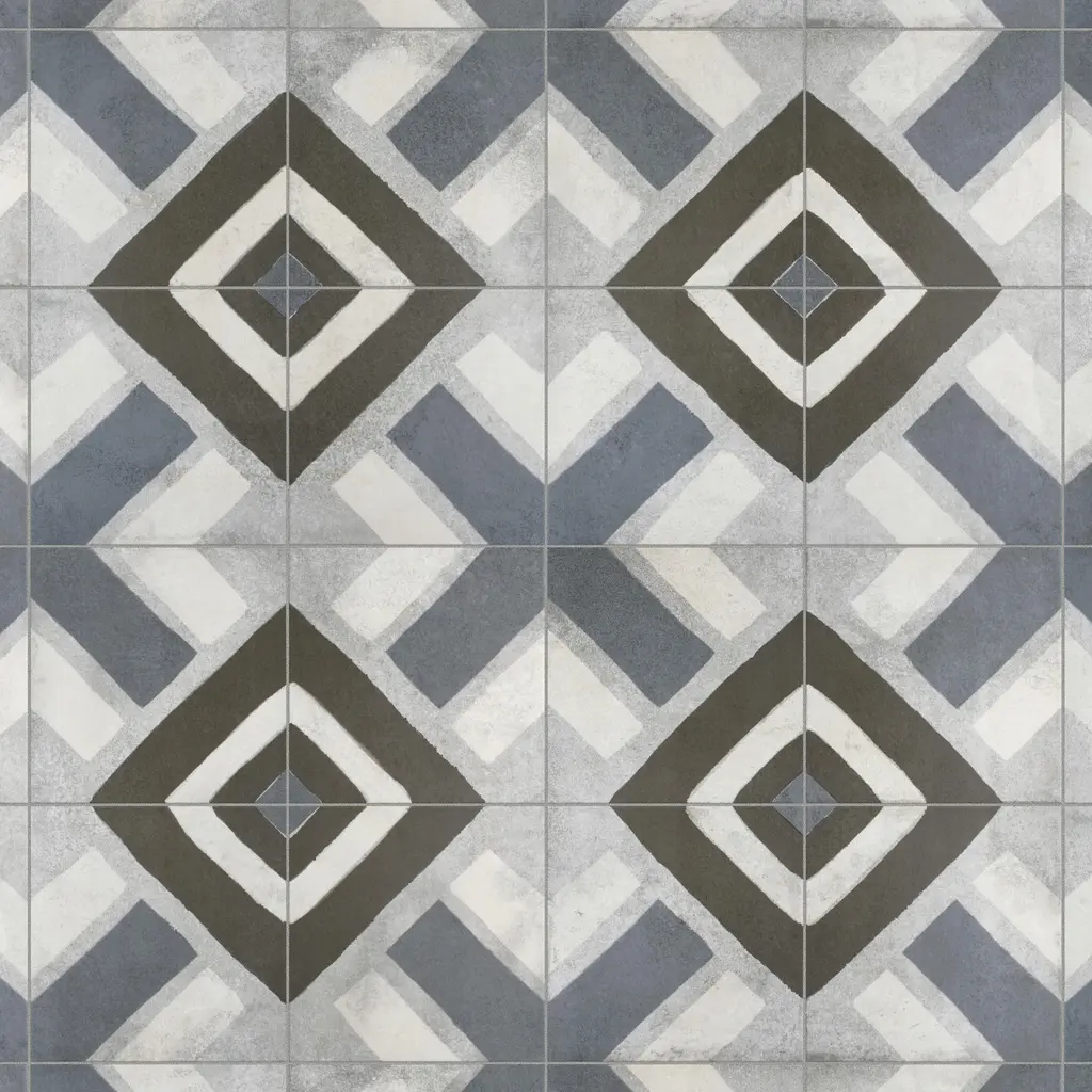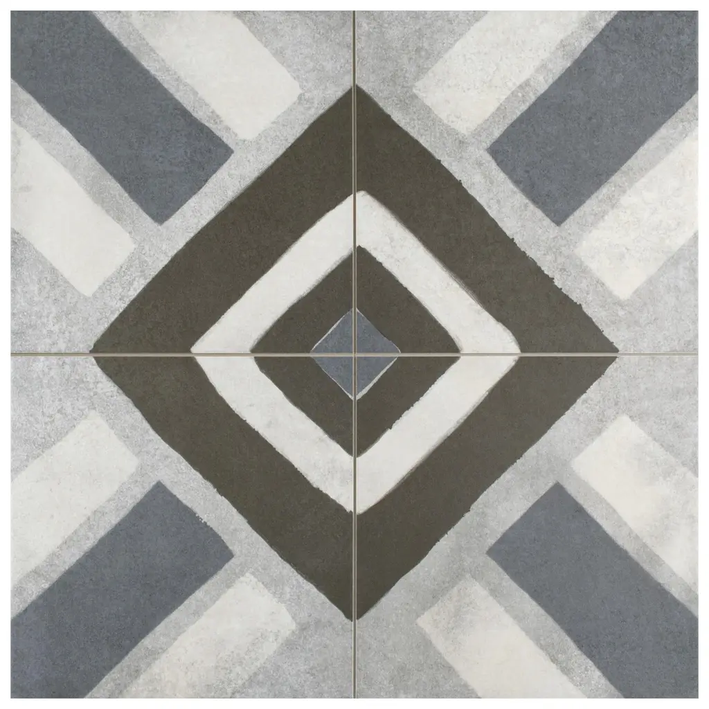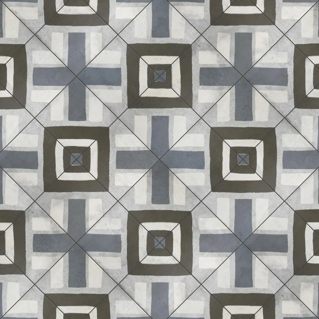 Inspired by classic cement tile, our Kings Sena Azul Porcelain Floor and Wall Tile radiates vintage charm. The defining feature of this encaustic-inspired tile is the unique, low-sheen glaze in light grey tones with a hand-painted looking geometric design in dark olive, denim blue and antique white tones. Available in six print variations that are randomly scattered throughout each case, the variation throughout each tile mimics an authentic aged appearance. Designed by interior architect and furniture designer Francisco Segarra, this tile is a true reflection of vintage industrial design. Realistic imitations of scuffs and spots that are the marks of well-loved, worn, century-old tile bring rustic charm to your interior. Save time and labor spent arranging smaller square tiles and instead install these durable porcelain slabs, which have four squares separated by scored grout lines. The scored grout lines can be grouted with the color of your choice to further customize your installation. Tile is the better choice for your space. This tile is made from natural ingredients, making it a healthy choice as it is free from allergens, VOCs, formaldehyde and PVC. 11.1 square feet, 5 pieces per case. Case weight is 51.18 lbs. Grade 1, first-quality porcelain tile for floor and wall use 17.75 in. width x 17.75 in. length x 0.4 in. thick Glazed, smooth finish with a low sheen and moderate variation in tone PEI Rating III is suitable for medium-duty residential floors including kitchens, halls, corridors, balconies, terraces and areas used more often with normal footwear and small amounts of dirt Impervious tiles have a water absorption of less than 0.5% for indoor and outdoor use and are frost resistant This tile is ADA approved for slip resistance with a DCOF value of 0.42 or higher. Completely frost resistant for indoor or outdoor applications; use a latex-modified thinset for acceptable bond strength Please note: A sample of this product may be a partial piece cut from the full size tile in order to provide an affordable and convenient way for customers to judge the quality and finish of this item. Samples are not returnable.