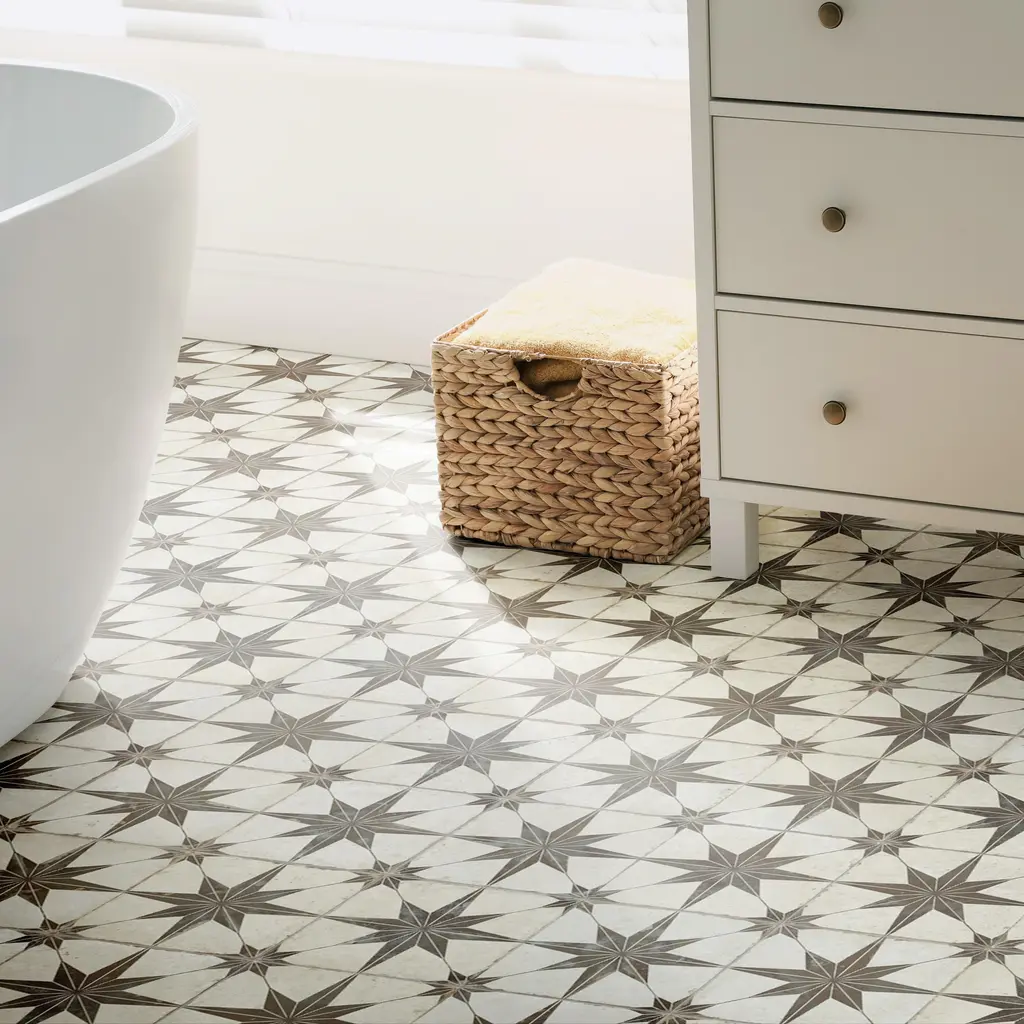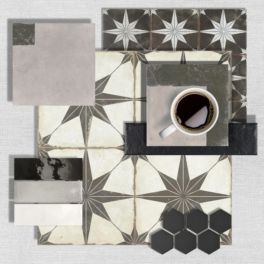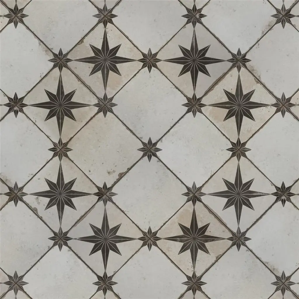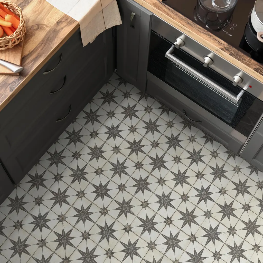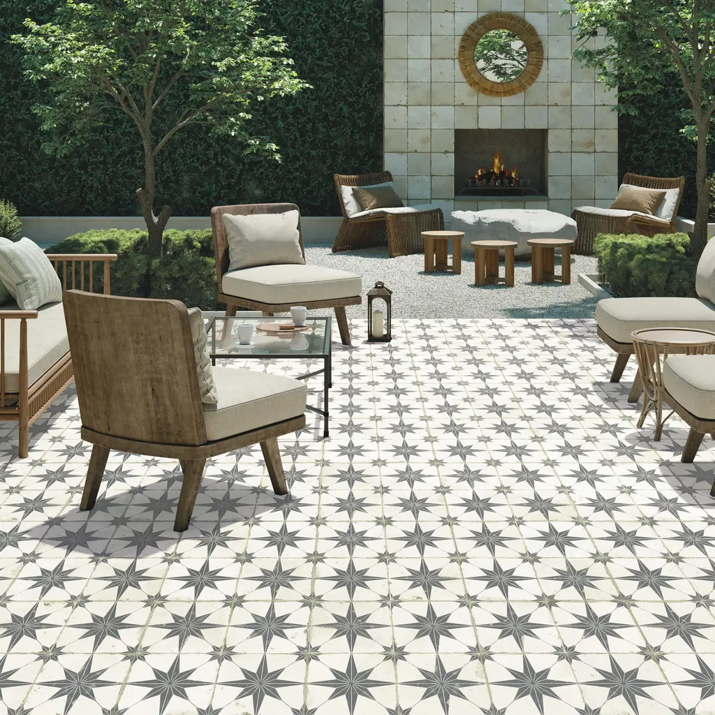 Capturing the appearance of a patterned look, our Kings Star Supernova Nero Porcelain Floor and Wall Tile features a slightly textured, matte finish, providing decorative appeal that adapts to a variety of stylistic contexts. A durable addition to our Kings Star Collection, Supernova Nero's porcelain design offers unmatched versatility and water resistance, making it perfect for indoor and outdoor spaces, statement walls to patios, adding a touch of elegance and resilience to any setting. Containing 10 different print variations that are randomly distributed throughout each case, this beige square tile offers a one-of-a-kind look. With its impervious, frost-resistant features, this tile is an ideal selection for both indoor and outdoor commercial and residential installations, including kitchens, bathrooms, backsplashes, showers, hallways, entryways, patios and fireplace facades. This tile is a perfect choice on its own or paired with other products in the Kings Collection. Tile is the better choice for your space! 11.1 square feet, 5 pieces per case. Case weight is 49.6 lbs. Grade 1, first-quality porcelain tile for floor and wall use 17.75 in. width x 17.75 in. length x 0.37 in. thick Glazed, slightly textured finish with a low sheen and slight variation in tone PEI Rating IV has high resistance to abrasion and is suitable for heavy-duty residential and commercial kitchens, hotels, exhibition and sales rooms with some dirt conditions Impervious tiles have a water absorption of less than 0.5% for indoor and outdoor use and are frost resistant This tile is ADA approved for slip resistance with a DCOF value of 0.42 or higher. Completely frost resistant for indoor or outdoor applications; use a latex-modified thinset for acceptable bond strength Please note: A sample of this product may be a partial piece cut from the full size tile in order to provide an affordable and convenient way for customers to judge the quality and finish of this item. Samples are not returnable.