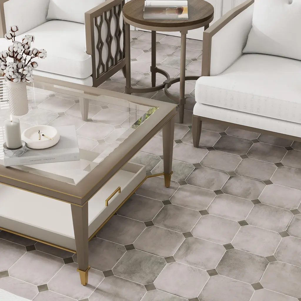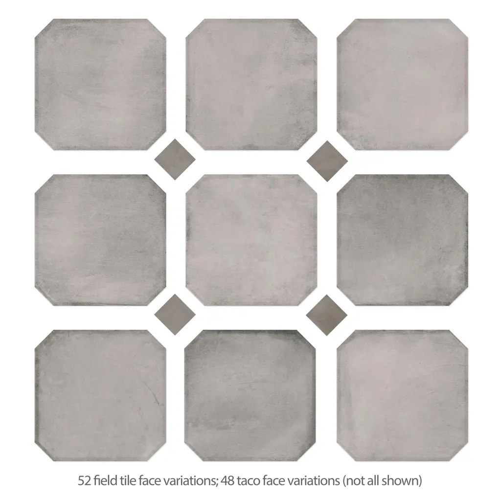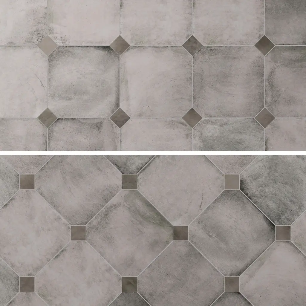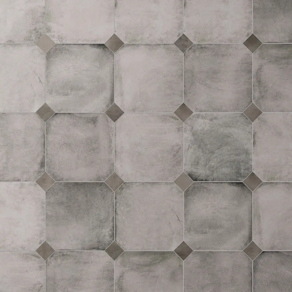 Offering a cement look, our Laverton Octagon Gris with Taco Grafito Porcelain Floor and Wall Tile features a smooth, matte finish, providing decorative appeal that adapts to a variety of stylistic contexts. Inspired by Laverton's quaint stone cottages and picturesque hills, this collection's matte finish, slight undulation, and versatile colors create a unique blend of rustic charm and timeless elegance, transforming your space into a cozy haven reminiscent of the English countryside. Containing 52 different print variations that are randomly distributed throughout each case, this gray specialty tile offers a one-of-a-kind look. With its impervious, frost-resistant features, this tile is an ideal selection for a variety of spaces including indoor and outdoor residential installations, bathrooms, backsplashes, showers, hallways, pools and fireplace facades. Discover more products from the Merola Tile Laverton Collection to complete your design. To ensure optimal results, please consult with your installer and review the product specifications to confirm that this tile meets the specific needs of your project. 11.25 square feet, 50 pieces per case. Case weight is 41.72 lbs. Grade 1, first-quality porcelain tile for floor and wall use This kit includes a total of 50 pieces, featuring a variety of components in different sizes and shapes - refer to the images for installation inspiration and ideas Glazed, smooth finish with a low sheen and moderate variation in tone PEI Rating II is suitable for all interior walls and light foot traffic such as powder rooms Impervious tiles have a water absorption of less than 0.5% for indoor and outdoor use and are frost resistant This tile is ADA approved for slip resistance with a DCOF value of 0.42 or higher. Completely frost resistant for indoor or outdoor applications; use a latex-modified thinset for acceptable bond strength Please note: A sample of this product may be a partial piece cut from the full size tile in order to provide an affordable and convenient way for customers to judge the quality and finish of this item. Samples are not returnable.