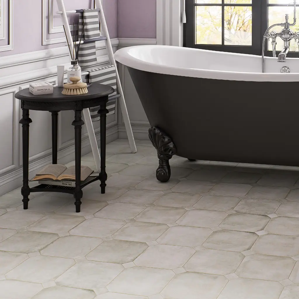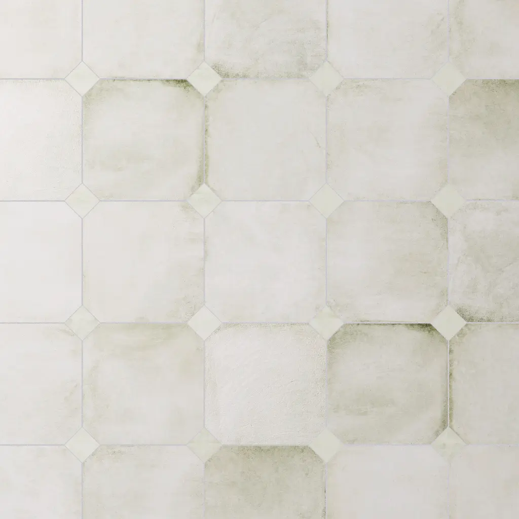 Offering a cement look, our Laverton Octagon Nieve Porcelain Floor and Wall Tile features a smooth, matte finish, providing decorative appeal that adapts to a variety of stylistic contexts. Inspired by Laverton's quaint stone cottages and picturesque hills, this collection's matte finish, slight undulation, and versatile colors create a unique blend of rustic charm and timeless elegance, transforming your space into a cozy haven reminiscent of the English countryside. This Octagon pairs perfectly with any Merola 2 in. Taco or a Taco of your choice. Containing 52 different print variations that are randomly distributed throughout each case, this light gray octagon tile offers a one-of-a-kind look. With its impervious, frost-resistant features, this tile is an ideal selection for a variety of spaces including indoor and outdoor commercial and residential installations, kitchens, bathrooms, backsplashes, showers, hallways, entryways, patios, pools and fireplace facades. Discover more products from the Merola Tile Laverton Collection to complete your design. To ensure optimal results, please consult with your installer and review the product specifications to confirm that this tile meets the specific needs of your project.