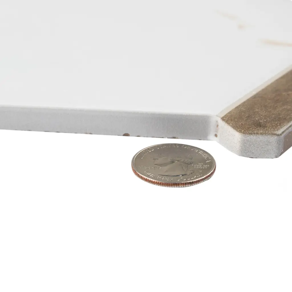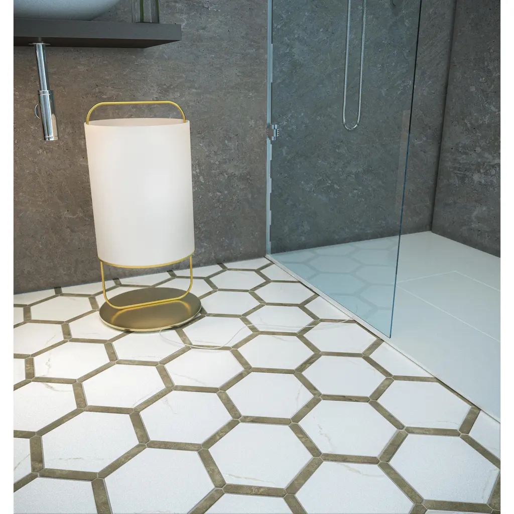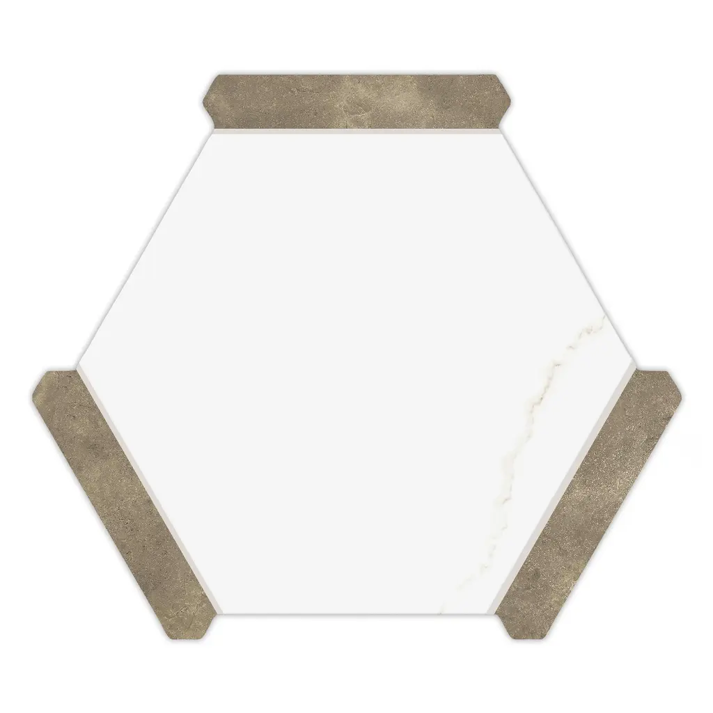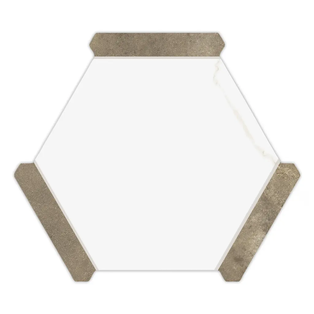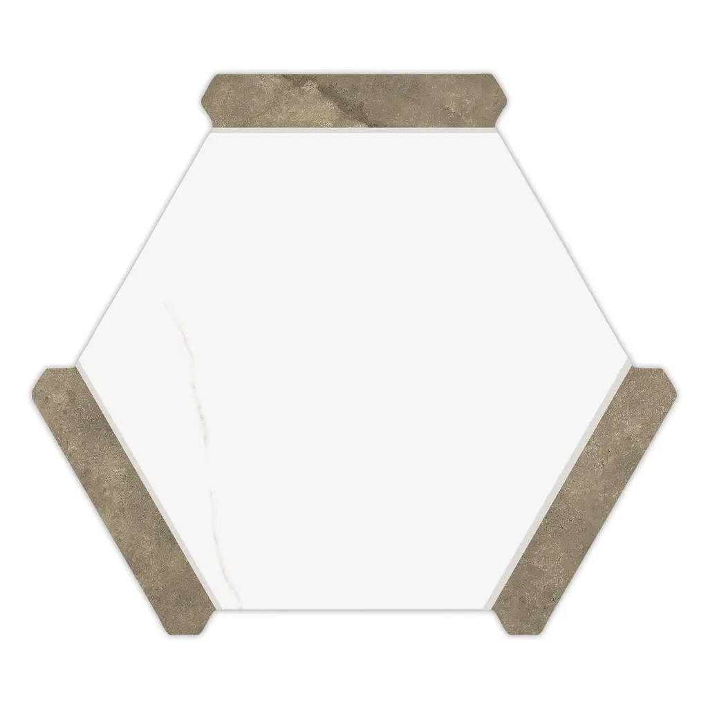 Capturing the appearance of a marble look, our Marcotto Panal Calacatta Gold with Terra Picket Porcelain Floor and Wall Tile features a smooth, matte finish, providing decorative appeal that adapts to a variety of stylistic contexts. The Marcotto Porcelain Tile collection is inspired by medieval Spanish architecture, with its interlocking hexagons with pickets and a blend of marble and terracotta, creating a sophisticated and dramatic space. Containing 24 different print variations that are randomly distributed throughout each case, this white specialty tile offers a one-of-a-kind look. With its impervious, frost-resistant features, this tile is an ideal selection for both indoor and outdoor commercial and residential installations, including kitchens, bathrooms, backsplashes, showers, hallways, entryways, patios and fireplace facades. This tile is a perfect choice on its own or paired with other products in the Marcotto Collection. Tile is the better choice for your space! 8.06 square feet, 18 pieces per case. Case weight is 29.43 lbs. Grade 1, first-quality porcelain tile for floor and wall use 8.63 in. width x 9.88 in. length x 0.31 in. thick Glazed, smooth finish with a low sheen and moderate variation in tone PEI Rating IV has high resistance to abrasion and is suitable for heavy-duty residential and commercial kitchens, hotels, exhibition and sales rooms with some dirt conditions Impervious tiles have a water absorption of less than 0.5% for indoor and outdoor use and are frost resistant This tile is ADA approved for slip resistance with a DCOF value of 0.42 or higher. Completely frost resistant for indoor or outdoor applications; use a latex-modified thinset for acceptable bond strength Please note: A sample of this product may be a partial piece cut from the full size tile in order to provide an affordable and convenient way for customers to judge the quality and finish of this item. Samples are not returnable.