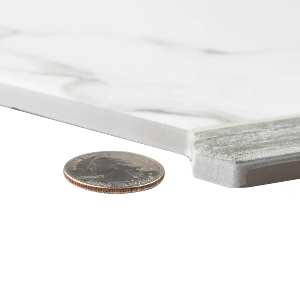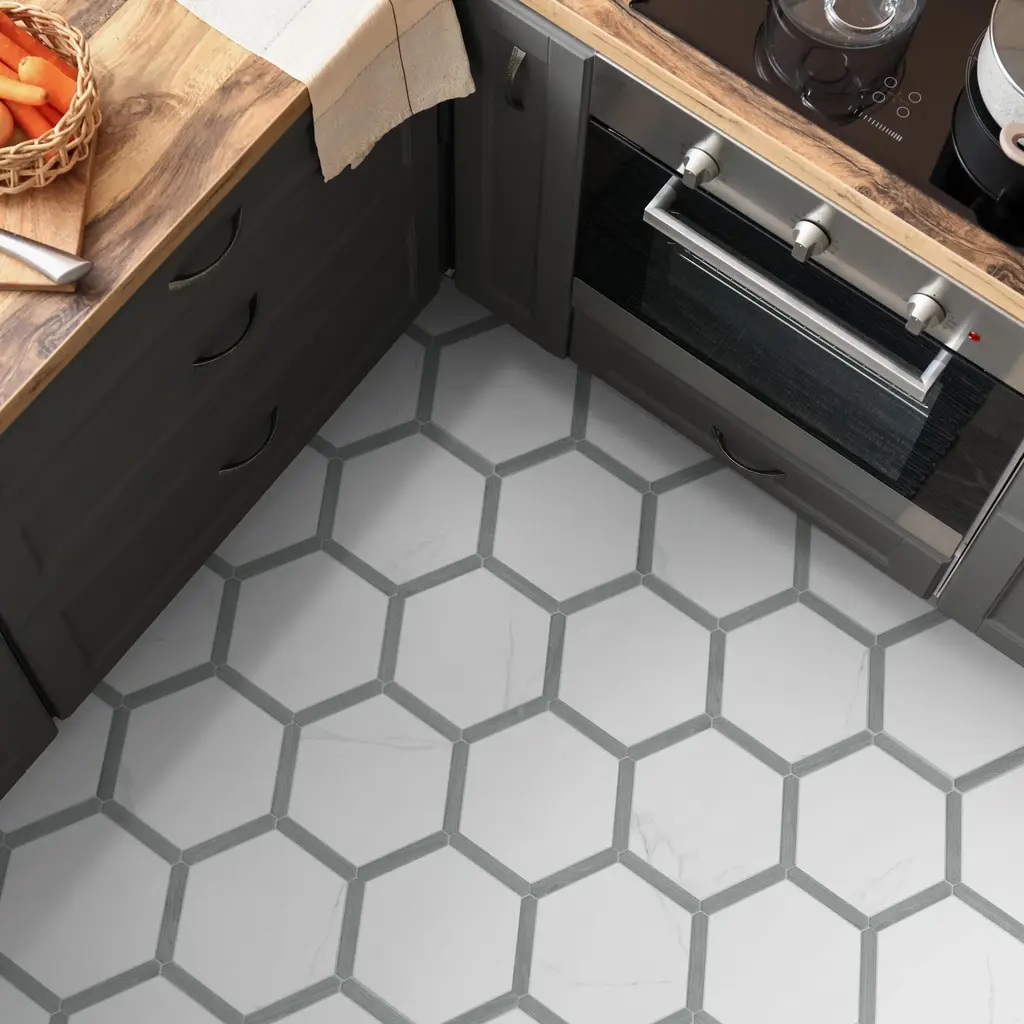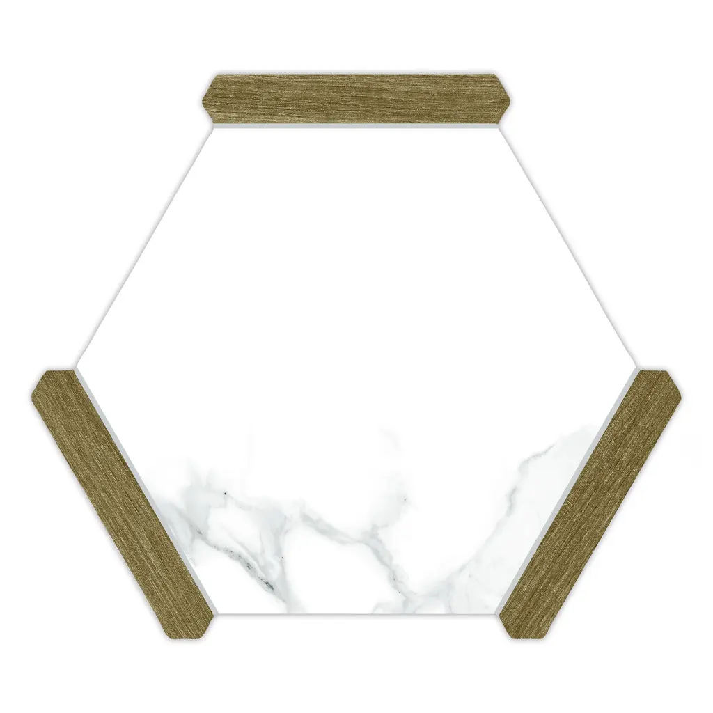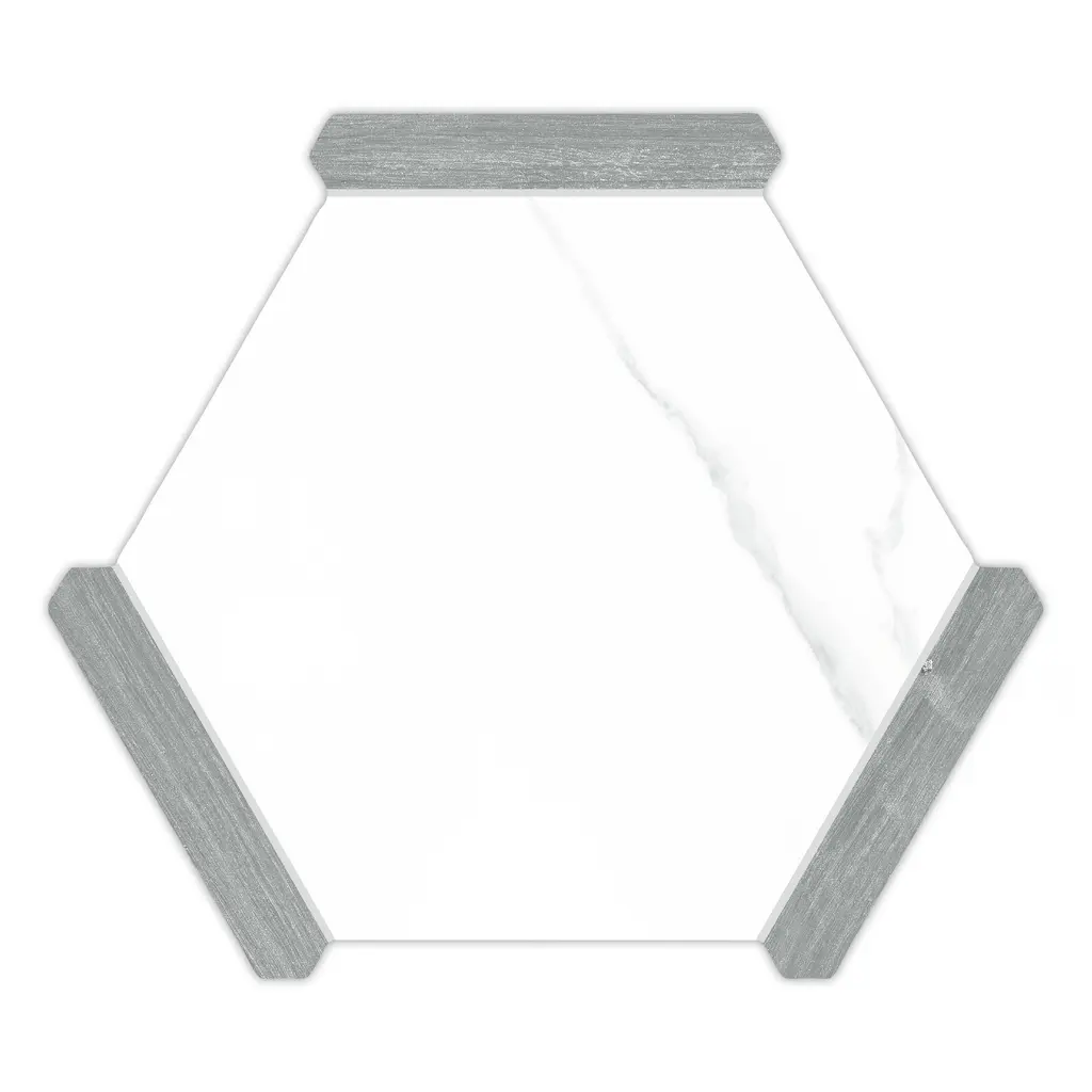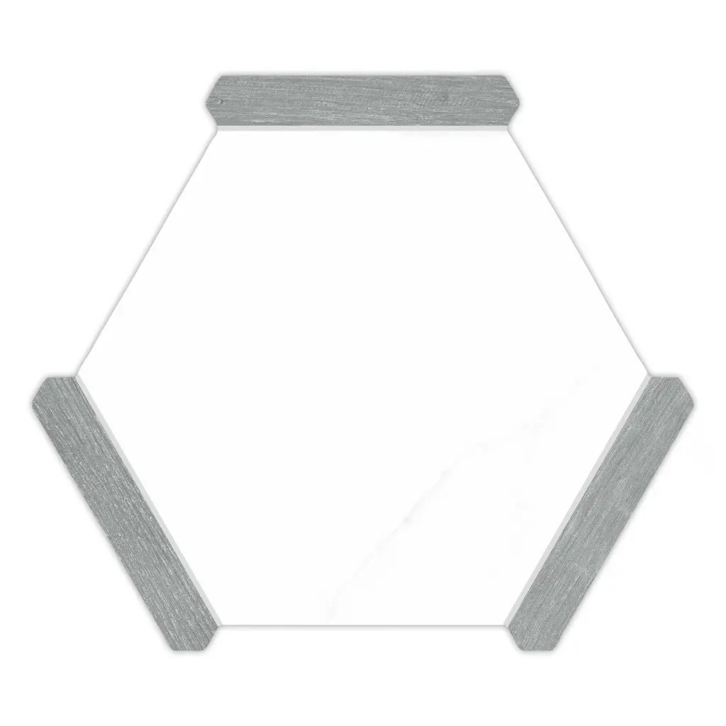 Capturing the appearance of a marble look, our Marwood Panal Calacatta with Grey Picket Porcelain Floor and Wall Tile features a smooth, matte finish, providing decorative appeal that adapts to a variety of stylistic contexts. The Marwood Porcelain Tile collection is inspired by medieval Spanish architecture, with its interlocking hexagons with pickets and a blend of white marble and wood, creating a sophisticated and dramatic space. Containing 24 different print variations that are randomly distributed throughout each case, this white specialty tile offers a one-of-a-kind look. With its impervious, frost-resistant features, this tile is an ideal selection for both indoor and outdoor commercial and residential installations, including kitchens, bathrooms, backsplashes, showers, hallways, entryways, patios and fireplace facades. This tile is a perfect choice on its own or paired with other products in the Marwood Collection. Tile is the better choice for your space! 8.06 square feet, 18 pieces per case. Case weight is 29.43 lbs. Grade 1, first-quality porcelain tile for floor and wall use 8.63 in. width x 9.88 in. length x 0.31 in. thick Glazed, smooth finish with a low sheen and moderate variation in tone PEI Rating IV has high resistance to abrasion and is suitable for heavy-duty residential and commercial kitchens, hotels, exhibition and sales rooms with some dirt conditions Impervious tiles have a water absorption of less than 0.5% for indoor and outdoor use and are frost resistant This tile is ADA approved for slip resistance with a DCOF value of 0.42 or higher. Completely frost resistant for indoor or outdoor applications; use a latex-modified thinset for acceptable bond strength Please note: A sample of this product may be a partial piece cut from the full size tile in order to provide an affordable and convenient way for customers to judge the quality and finish of this item. Samples are not returnable.