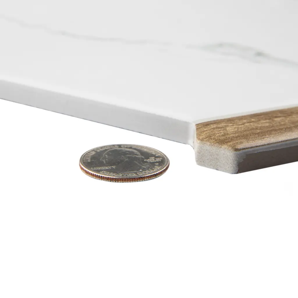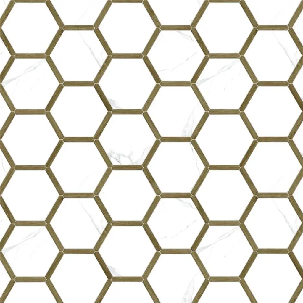 Capturing the appearance of a marble look, our Marwood Panal Calacatta with Oak Picket Porcelain Floor and Wall Tile features a smooth, matte finish, providing decorative appeal that adapts to a variety of stylistic contexts. The Marwood Porcelain Tile collection is inspired by medieval Spanish architecture, with its interlocking hexagons with pickets and a blend of white marble and wood, creating a sophisticated and dramatic space. Containing 24 different print variations that are randomly distributed throughout each case, this white specialty tile offers a one-of-a-kind look. With its impervious, frost-resistant features, this tile is an ideal selection for both indoor and outdoor commercial and residential installations, including kitchens, bathrooms, backsplashes, showers, hallways, entryways, patios and fireplace facades. This tile is a perfect choice on its own or paired with other products in the Marwood Collection. Tile is the better choice for your space! 8.06 square feet, 18 pieces per case. Case weight is 29.43 lbs. Grade 1, first-quality porcelain tile for floor and wall use 8.63 in. width x 9.88 in. length x 0.31 in. thick Glazed, smooth finish with a low sheen and moderate variation in tone PEI Rating IV has high resistance to abrasion and is suitable for heavy-duty residential and commercial kitchens, hotels, exhibition and sales rooms with some dirt conditions Impervious tiles have a water absorption of less than 0.5% for indoor and outdoor use and are frost resistant This tile is ADA approved for slip resistance with a DCOF value of 0.42 or higher. Completely frost resistant for indoor or outdoor applications; use a latex-modified thinset for acceptable bond strength Please note: A sample of this product may be a partial piece cut from the full size tile in order to provide an affordable and convenient way for customers to judge the quality and finish of this item. Samples are not returnable.