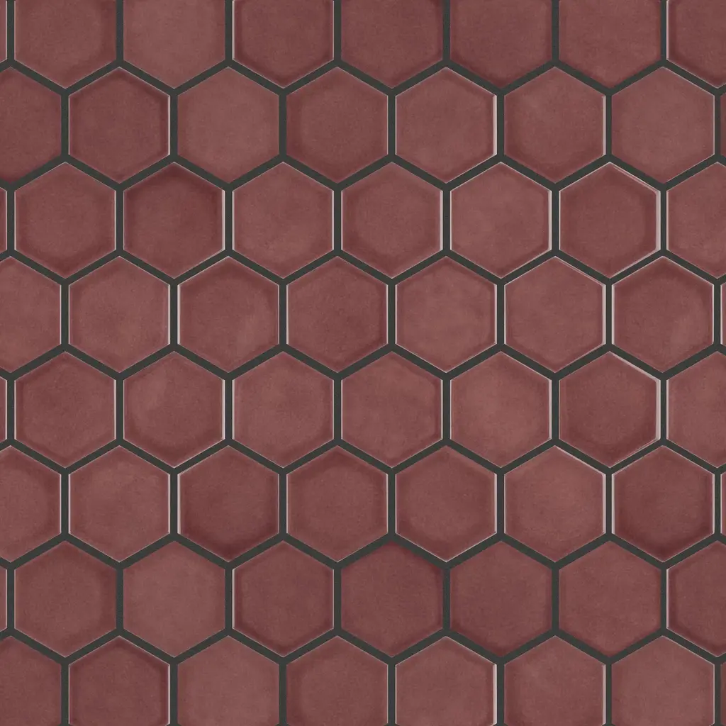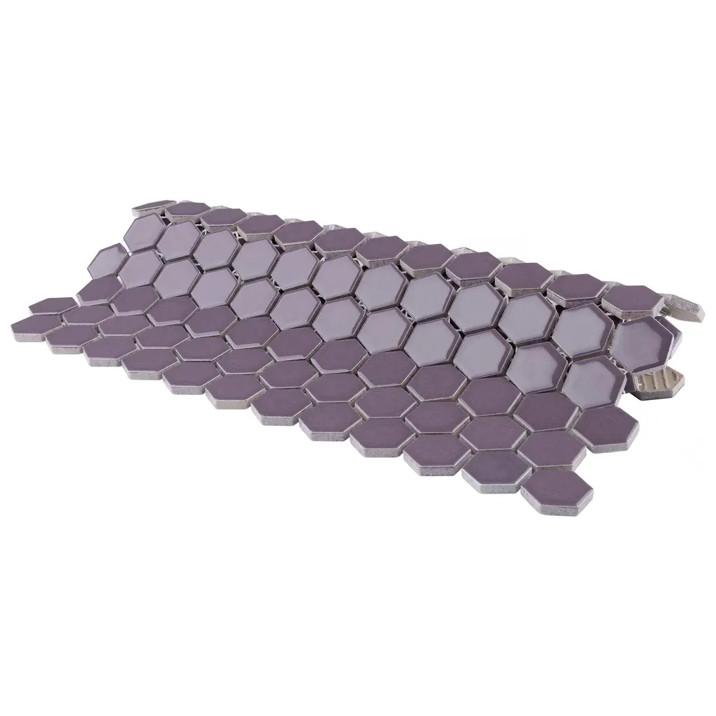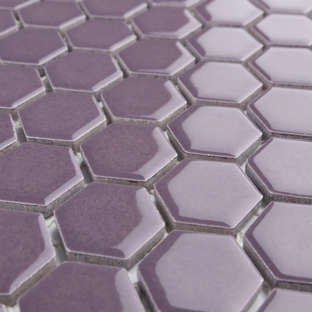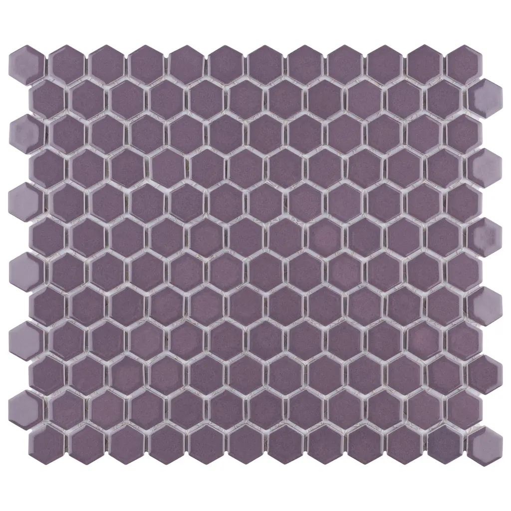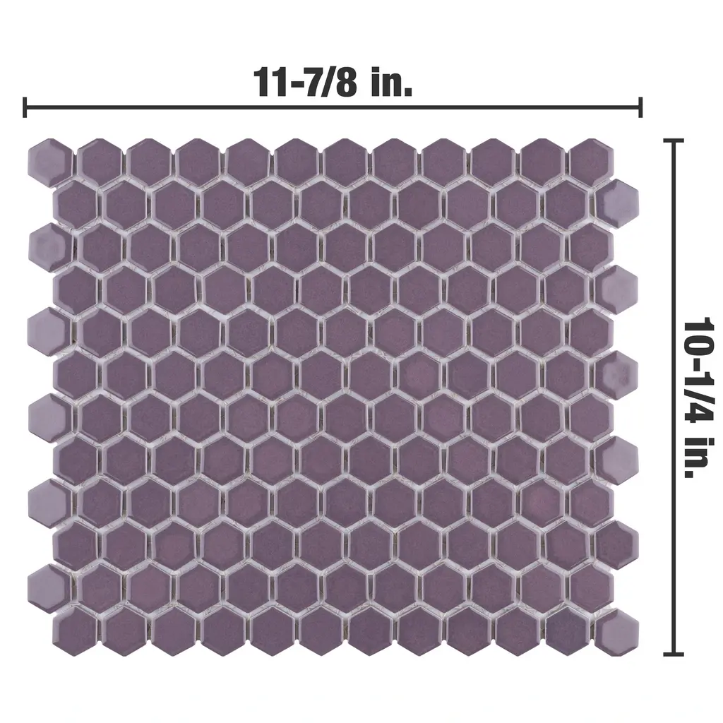 Transform your space into a tribute to retro design with our Metro 1 in. Hex Glossy Purple Porcelain Floor and Wall Mosaic Tile. As a modern deviation from the classic mosaic, this fresh option is a throwback to traditional retro design with a contemporary feel. Glossy purple hexagons are arranged on an interlocking mesh to create a seamless installation. This minimalistic geometric porcelain mosaic is unique yet simplistic enough to integrate into any design, ranging from traditional style renovations to modern home projects. Its impervious and frost resistant features make this an ideal tile for indoor and outdoor use, including backsplashes, bathrooms, showers, kitchens and fireplace facades. Tile is the better choice for your space. This tile is made from natural ingredients, making it a healthy choice as it is free from allergens, VOCs, formaldehyde and PVC. 8.6 square feet, 10 pieces per case. Case weight is 17.81 lbs. Grade 1, first-quality porcelain tile for floor and wall use 10.25 in. width x 11.88 in. length x 0.23 in. thick mesh-mounted mosaic Glazed, smooth finish with a high sheen and slight variation in tone PEI Rating III is suitable for medium-duty residential floors including kitchens, halls, corridors, balconies, terraces and areas used more often with normal footwear and small amounts of dirt Impervious tiles have a water absorption of less than 0.5% for indoor and outdoor use and are frost resistant This tile has no available COF wet rating. This tile is not ADA approved for slip resistance. Completely frost resistant for indoor or outdoor applications; use a latex-modified thinset for acceptable bond strength Please note: A sample of this product may be a partial piece cut from the full size tile in order to provide an affordable and convenient way for customers to judge the quality and finish of this item. Samples are not returnable.