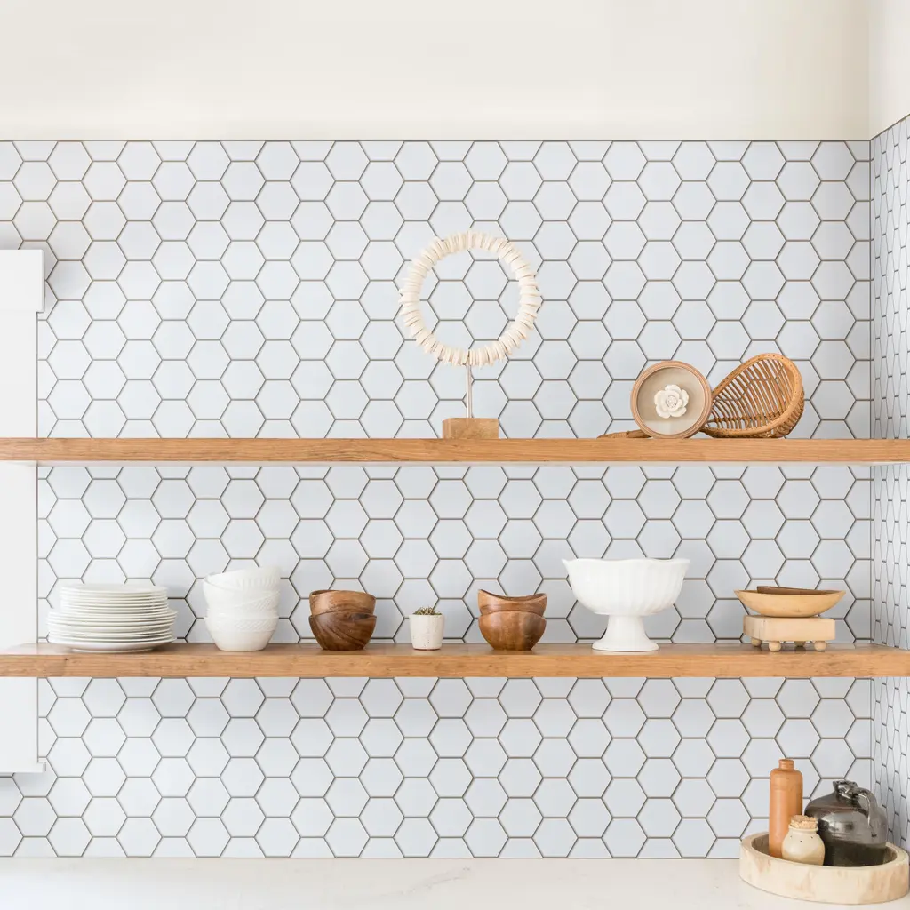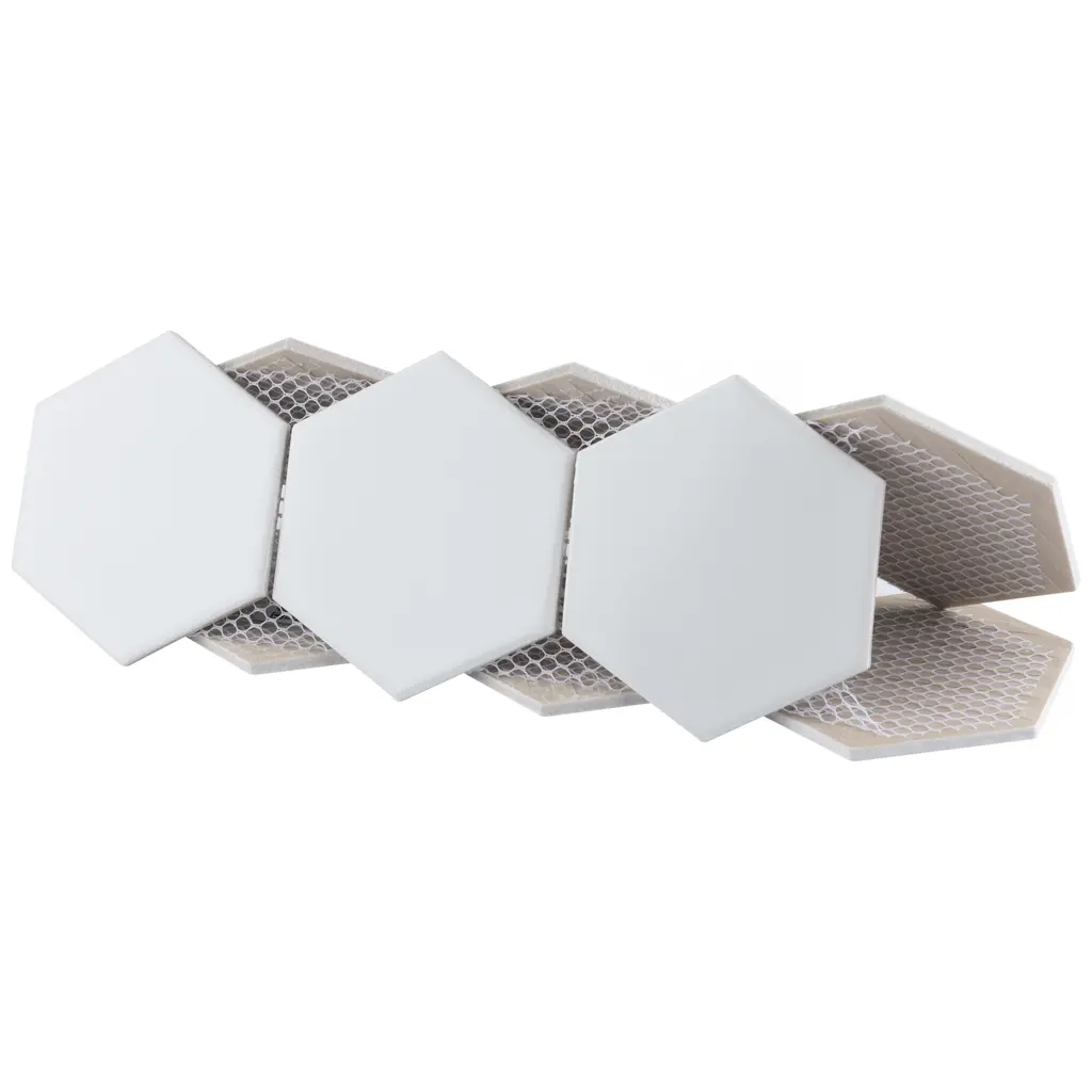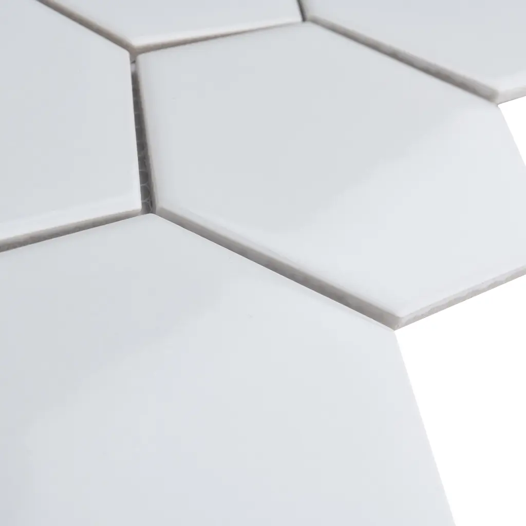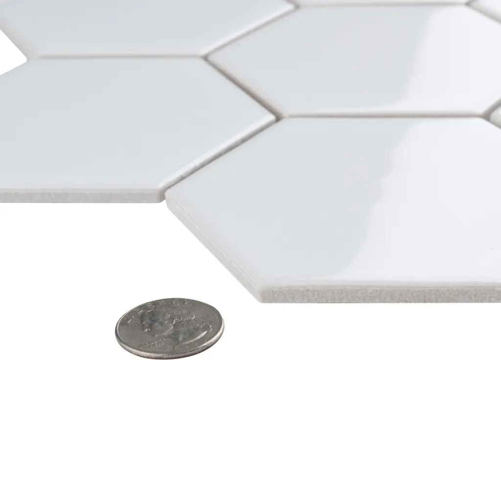 Transform your space into a tribute to retro design with our Metro Super 4" Hex Glossy White Porcelain Floor and Wall Mosaic Tile. As a modern, enlarged deviation from the classic hexagon mosaic, this fresh option is a throwback to traditional retro design with a contemporary feel. Glossy white porcelain hexagons are arranged on an interlocking mesh to create a seamless installation. This minimalistic geometric floor and wall mosaic is unique yet simplistic enough to integrate into any design, ranging from traditional style renovations to modern home projects. Its impervious and frost resistant features make this an ideal tile for indoor and outdoor installations including kitchens, bathrooms, backsplashes, showers, and fireplace facades. Tile is the better choice for your space. This tile is made from natural ingredients, making it a healthy choice as it is free from allergens, VOCs, formaldehyde, and PVC.8.2 square feet, 10 pieces per case. Case weight is 22 lbs.Grade 1, first-quality porcelain tile for floor and wall use10 in. width x 11.5 in. length x 0.25 in. thick mesh-mounted mosaicGlazed, smooth finish with a high sheen and uniform appearance in tonePEI Rating II is suitable for all interior walls and light foot traffic such as powder roomsImpervious tiles have a water absorption of less than 0.5% for indoor and outdoor use and is frost resistantCOF rating less than or equal to 0.5 is considered to have a marginally low skid resistanceCompletely frost resistant for indoor or outdoor applications; use a latex-modified thinset for acceptable bond strengthResidential use onlyPlease note: A sample of this product may be a partial piece cut from the full size tile in order to provide an affordable and convenient way for customers to judge the quality and finish of this item. Samples are not returnable.