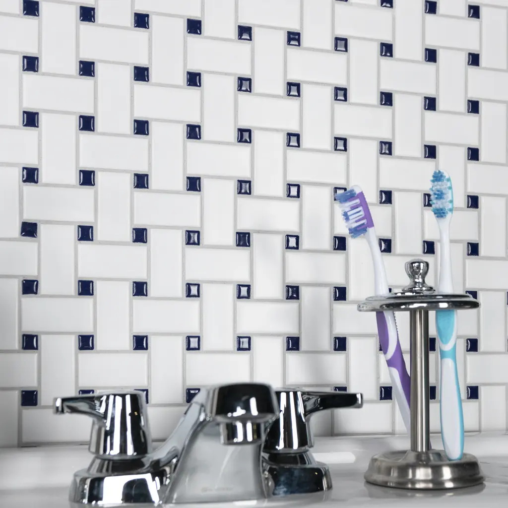 Transform your space into a tribute to retro design with our Metro Basketweave Matte White with Glossy Cobalt Blue Dot Porcelain Mosaic Floor and Wall Tile. As a modern deviation from the classic mosaic, this tile option is a throwback to traditional retro design with a contemporary feel. Matte white chips are accentuated by small glossy cobalt blue dots that provide a woven illusion. These mosaic chips are precisely arranged on an interlocking mesh to create a seamless installation. This minimalistic geometric porcelain mosaic is unique yet simplistic enough to integrate into any design, ranging from traditional style renovations to modern home projects. Its impervious and glazed features make this an ideal tile for indoor residential use, including backsplashes, bathrooms, showers and kitchens. Tile is the better choice for your space. This tile is made from natural ingredients, making it a healthy choice as it is free from allergens, VOCs, formaldehyde and PVC. 9.8 square feet, 10 pieces per case. Case weight is 22.6 lbs. Grade 1, first-quality porcelain tile for floor and wall use 11.75 in. width x 11.75 in. length x 0.22 in. thick mesh-mounted mosaic Glazed, smooth finish with a mixed finish and uniform appearance in tone PEI Rating II is suitable for all interior walls and light foot traffic such as powder rooms Impervious tiles have a water absorption of less than 0.5% for indoor and outdoor use and are frost resistant This tile has no available COF wet rating. This tile is not ADA approved for slip resistance. Completely frost resistant for indoor or outdoor applications; use a latex-modified thinset for acceptable bond strength Please note: A sample of this product may be a partial piece cut from the full size tile in order to provide an affordable and convenient way for customers to judge the quality and finish of this item. Samples are not returnable.