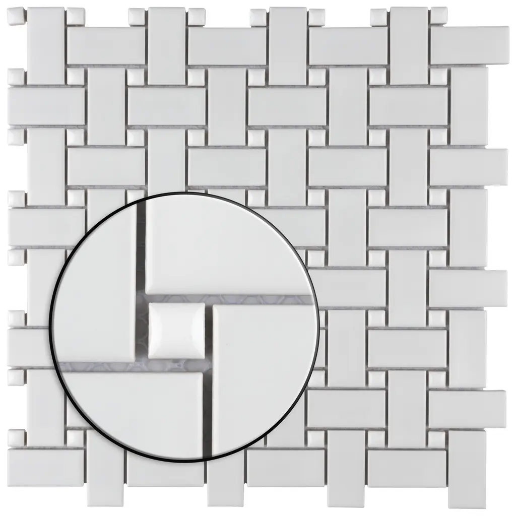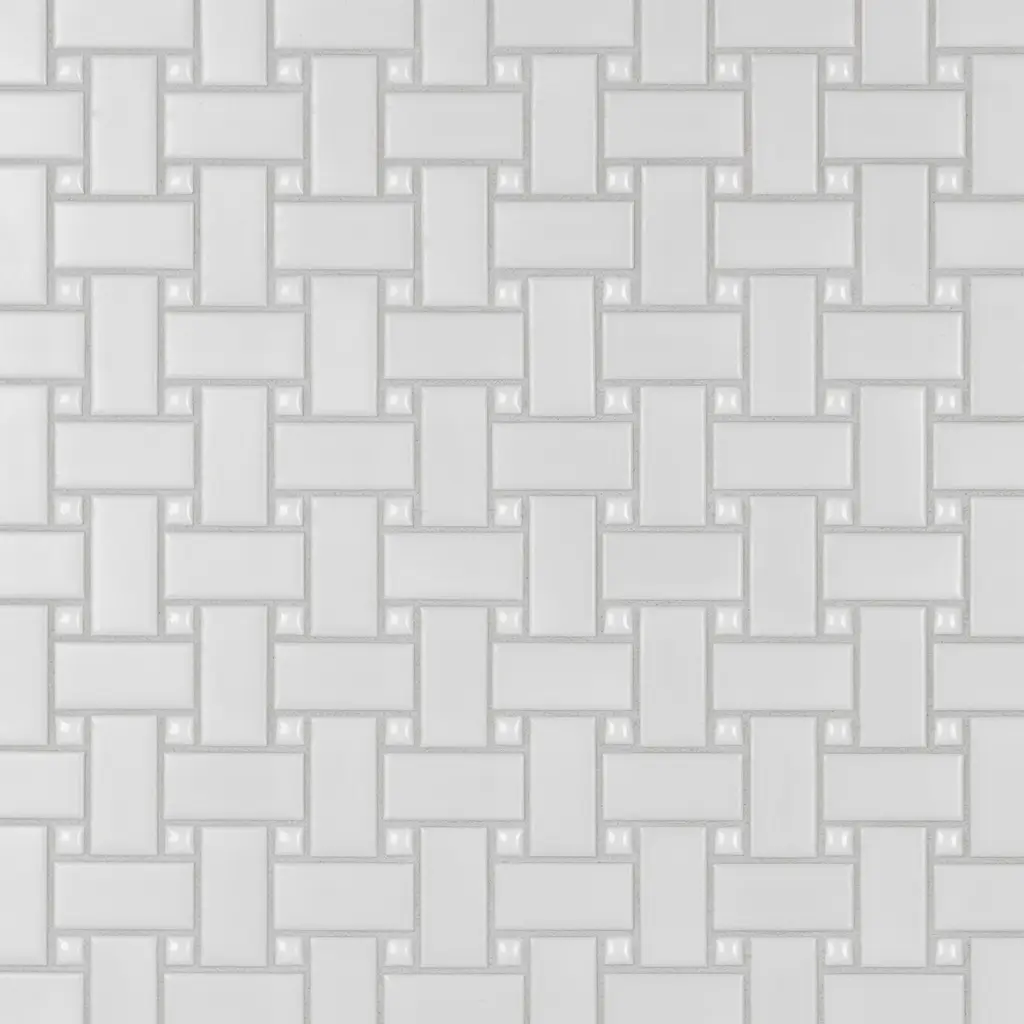 Transform your space into a tribute to retro design with our Metro Basketweave Matte White with Glossy White Dot Porcelain Mosaic Floor and Wall Tile. As a modern deviation from the classic mosaic, this tile option is a throwback to traditional retro design with a contemporary feel. Matte white chips are accentuated by small glossy white dots that provide a woven illusion. These mosaic chips are precisely arranged on an interlocking mesh to create a seamless installation. This minimalistic geometric porcelain mosaic is unique yet simplistic enough to integrate into any design, ranging from traditional style renovations to modern home projects. Its impervious and glazed features make this an ideal tile for indoor residential use, including backsplashes, bathrooms, showers and kitchens. Tile is the better choice for your space. This tile is made from natural ingredients, making it a healthy choice as it is free from allergens, VOCs, formaldehyde and PVC. 9.8 square feet, 10 pieces per case. Case weight is 22 lbs. Grade 1, first-quality porcelain tile for floor and wall use 11.75 in. width x 11.75 in. length x 0.22 in. thick mesh-mounted mosaic Glazed, smooth finish with a mixed finish and uniform appearance in tone PEI Rating II is suitable for all interior walls and light foot traffic such as powder rooms Impervious tiles have a water absorption of less than 0.5% for indoor and outdoor use and are frost resistant This tile has no available COF wet rating. This tile is not ADA approved for slip resistance. Completely frost resistant for indoor or outdoor applications; use a latex-modified thinset for acceptable bond strength Please note: A sample of this product may be a partial piece cut from the full size tile in order to provide an affordable and convenient way for customers to judge the quality and finish of this item. Samples are not returnable.