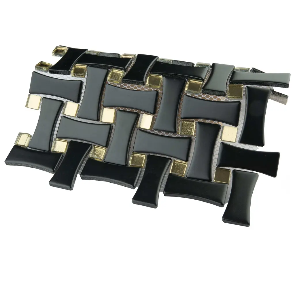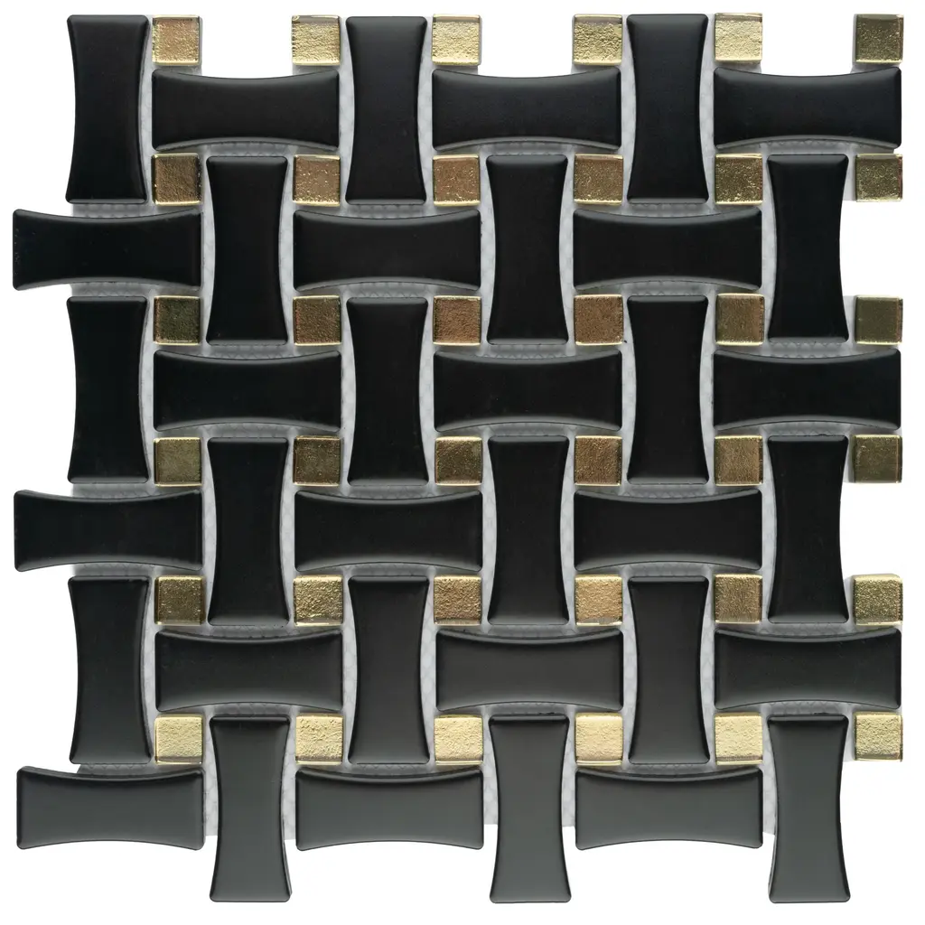 Merola Tile Metro Dog Bone Basketweave Matte Black With Glass Gold Dot 10" X 10" Porcelain Mosaic Wall Tile - Sample Swatch