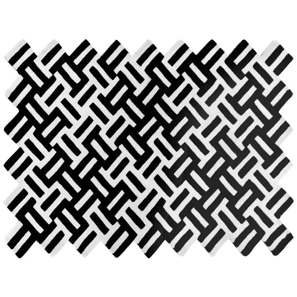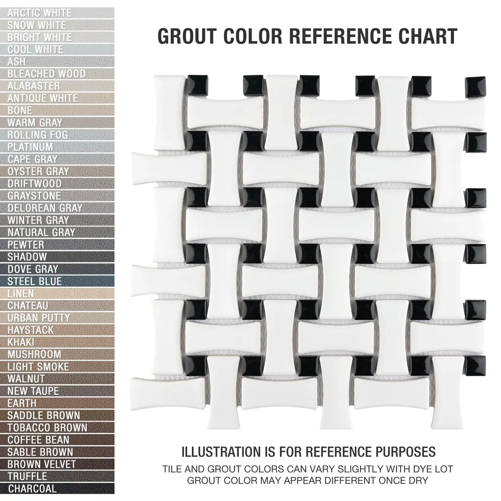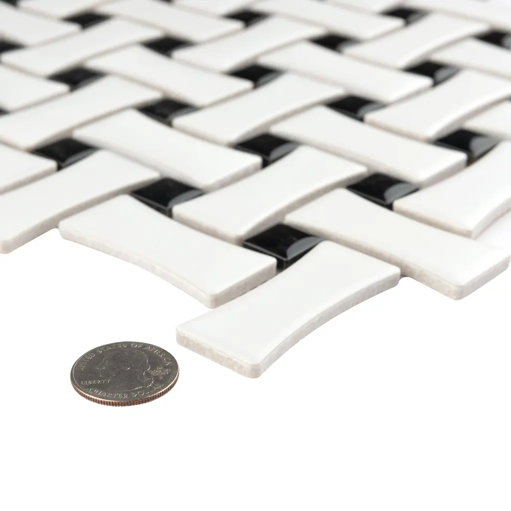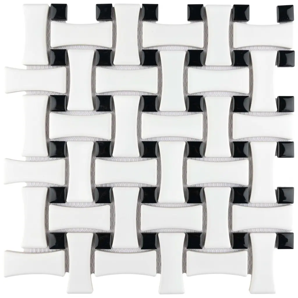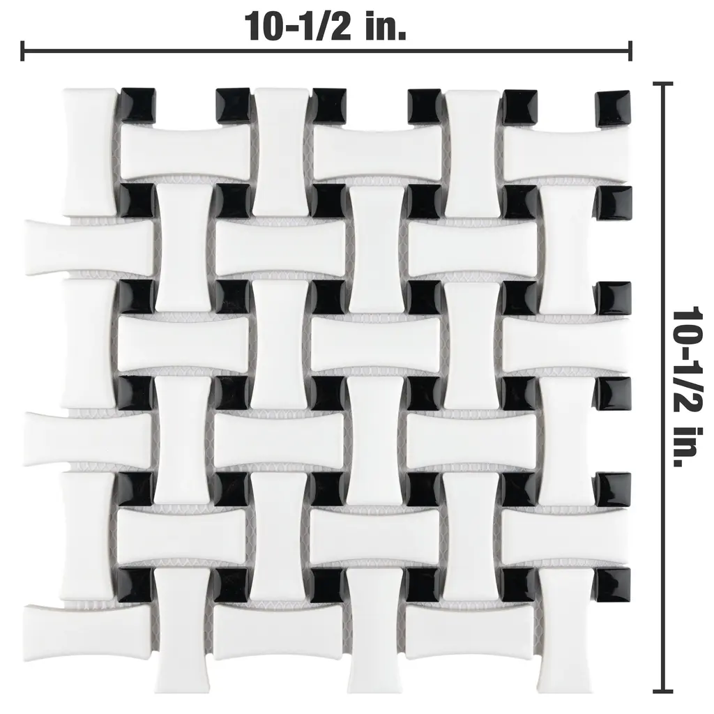Transform your space into a tribute to retro design with our Metro Dog Bone Basket Weave Matte White with Glossy Black Dot Porcelain Mosaic Floor and Wall Tile. As a modern deviation from the classic mosaic, this tile option is a throwback to traditional retro design with a contemporary feel. Matte white chips are accentuated by small glossy black dots that provide a woven illusion. These mosaic chips are precisely arranged on an interlocking mesh to create a seamless installation. This minimalistic geometric porcelain mosaic is unique yet simplistic enough to integrate into any design, ranging from traditional style renovations to modern home projects. Its impervious and glazed features make this an ideal tile for indoor and outdoor residential use, including backsplashes, bathrooms, showers, and kitchens. Tile is the better choice for your space. This tile is made from natural ingredients, making it a healthy choice as it is free from allergens, VOCs, formaldehyde, and PVC.7.1 square feet, 10 pieces per case. Case weight is 15.3 lbs.Grade 1, first-quality porcelain tile for floor and wall use10 in. width x 10 in. length x 0.19 in. thick mesh-mounted mosaicGlazed, smooth finish with a mixed finish and uniform appearance in tonePEI Rating II is suitable for all interior walls and light foot traffic such as powder roomsImpervious tiles have a water absorption of less than 0.5% for indoor and outdoor use and is frost resistantCOF rating less than or equal to 0.5 is considered to have a marginally low skid resistanceCompletely frost resistant for indoor or outdoor applications; use a latex-modified thinset for acceptable bond strengthResidential use onlyPlease note: A sample of this product may be a partial piece cut from the full size tile in order to provide an affordable and convenient way for customers to judge the quality and finish of this item. Samples are not returnable.