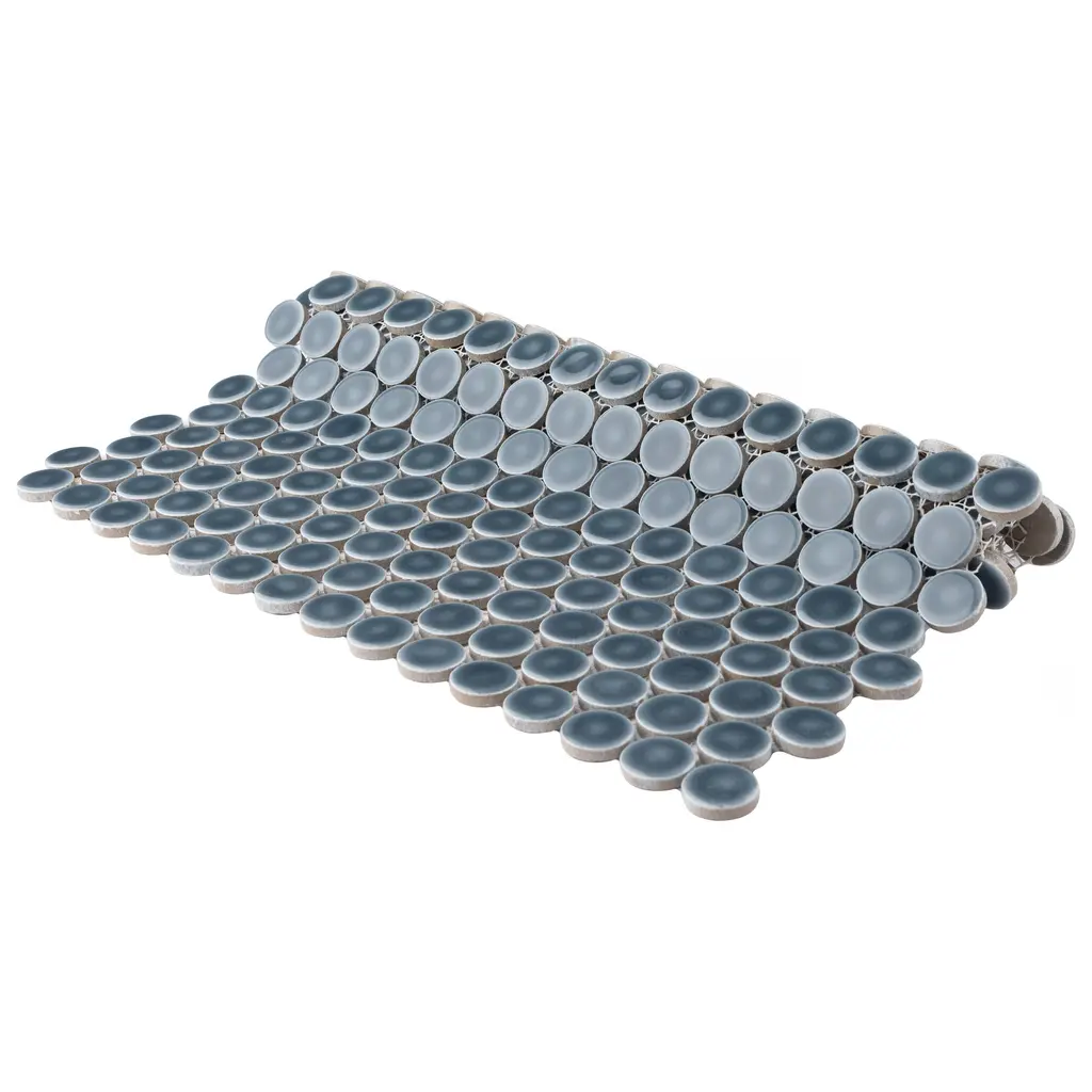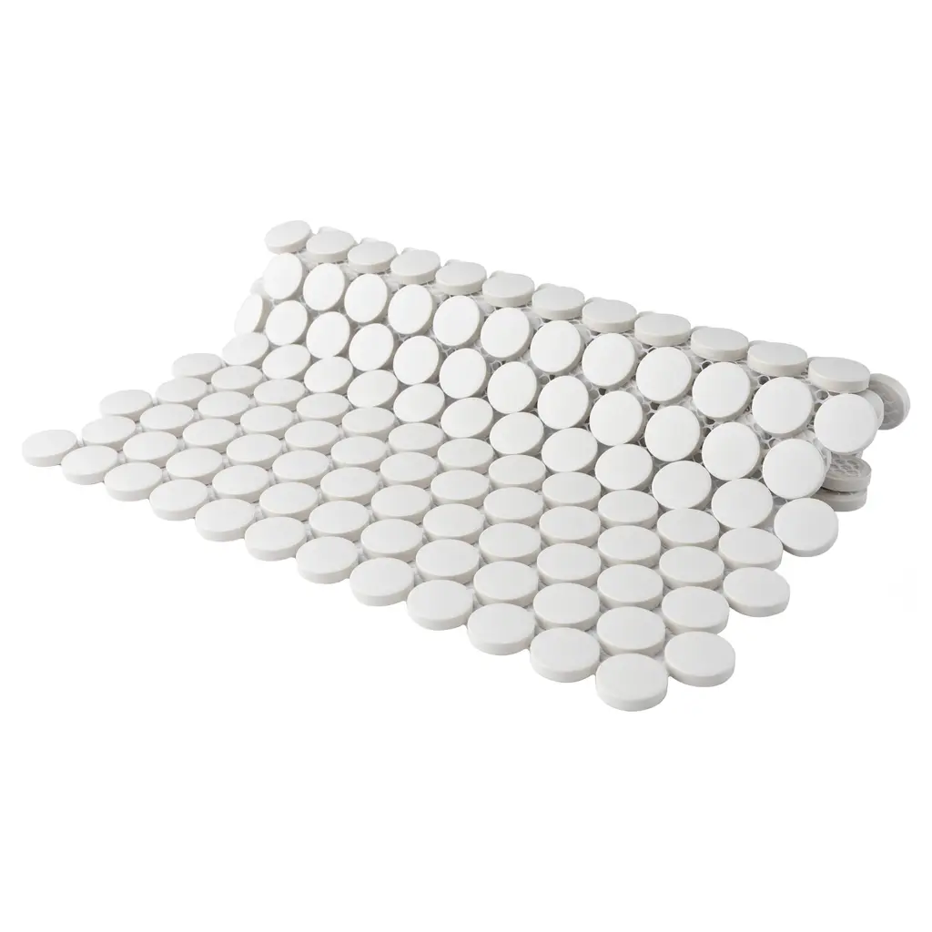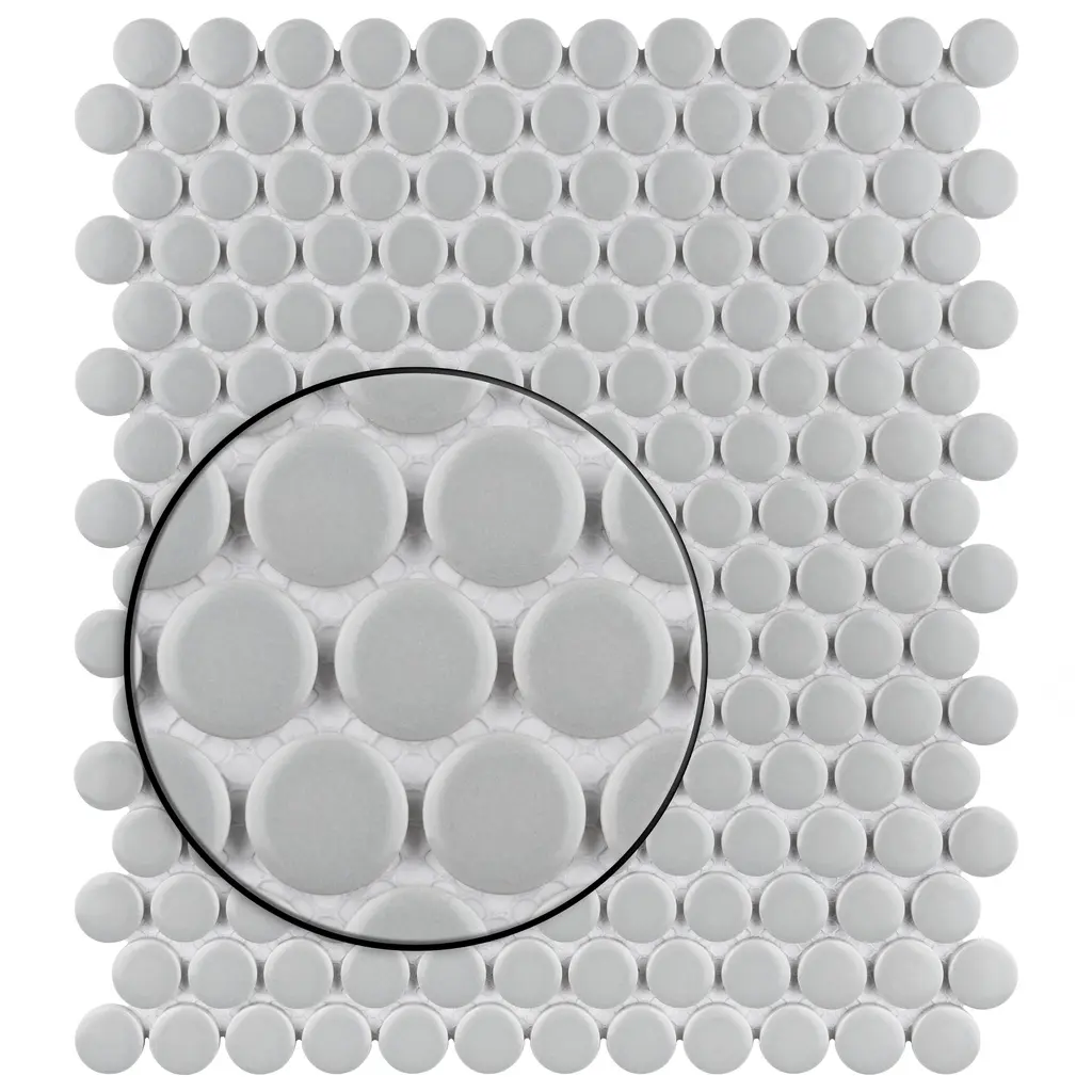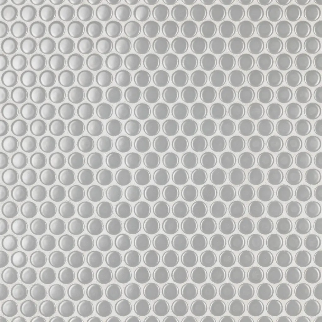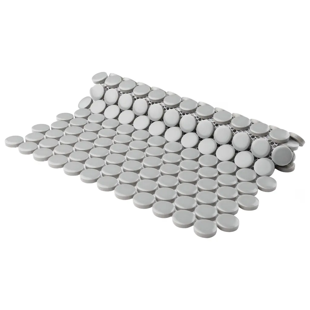 Transform your space into a tribute to retro design with our Metro Penny Matte Light Grey Porcelain Floor and Wall Mosaic Tile. As a modern deviation from the classic mosaic, this fresh option is a throwback to traditional retro design with a contemporary feel. Matte light grey penny rounds are arranged on an interlocking mesh to create a seamless installation. This minimalistic geometric porcelain mosaic is unique yet simplistic enough to integrate into any design, ranging from traditional style renovations to modern home projects. Its impervious and frost resistant features make this an ideal tile for residential indoor and outdoor use, including backsplashes, bathrooms, kitchens and floors that get light-duty foot traffic. Tile is the better choice for your space. This tile is made from natural ingredients, making it a healthy choice as it is free from allergens, VOCs, formaldehyde and PVC. 8.0 square feet, 10 pieces per case. Case weight is 14.9 lbs. Grade 1, first-quality porcelain tile for floor and wall use 9.75 in. width x 11.5 in. length x 0.24 in. thick mesh-mounted mosaic Glazed, smooth finish with a low sheen and uniform appearance in tone PEI Rating II is suitable for all interior walls and light foot traffic such as powder rooms Impervious tiles have a water absorption of less than 0.5% for indoor and outdoor use and are frost resistant This tile has no available COF wet rating. This tile is not ADA approved for slip resistance. Completely frost resistant for indoor or outdoor applications; use a latex-modified thinset for acceptable bond strength Please note: A sample of this product may be a partial piece cut from the full size tile in order to provide an affordable and convenient way for customers to judge the quality and finish of this item. Samples are not returnable.