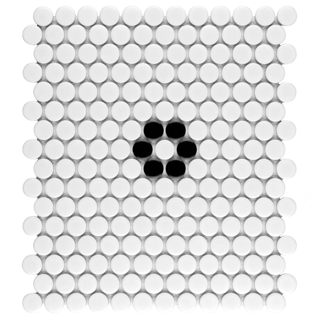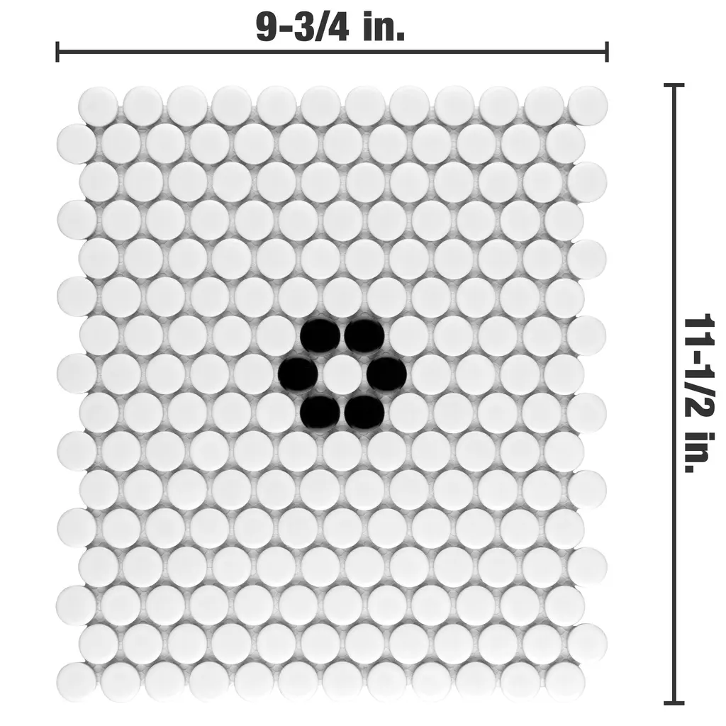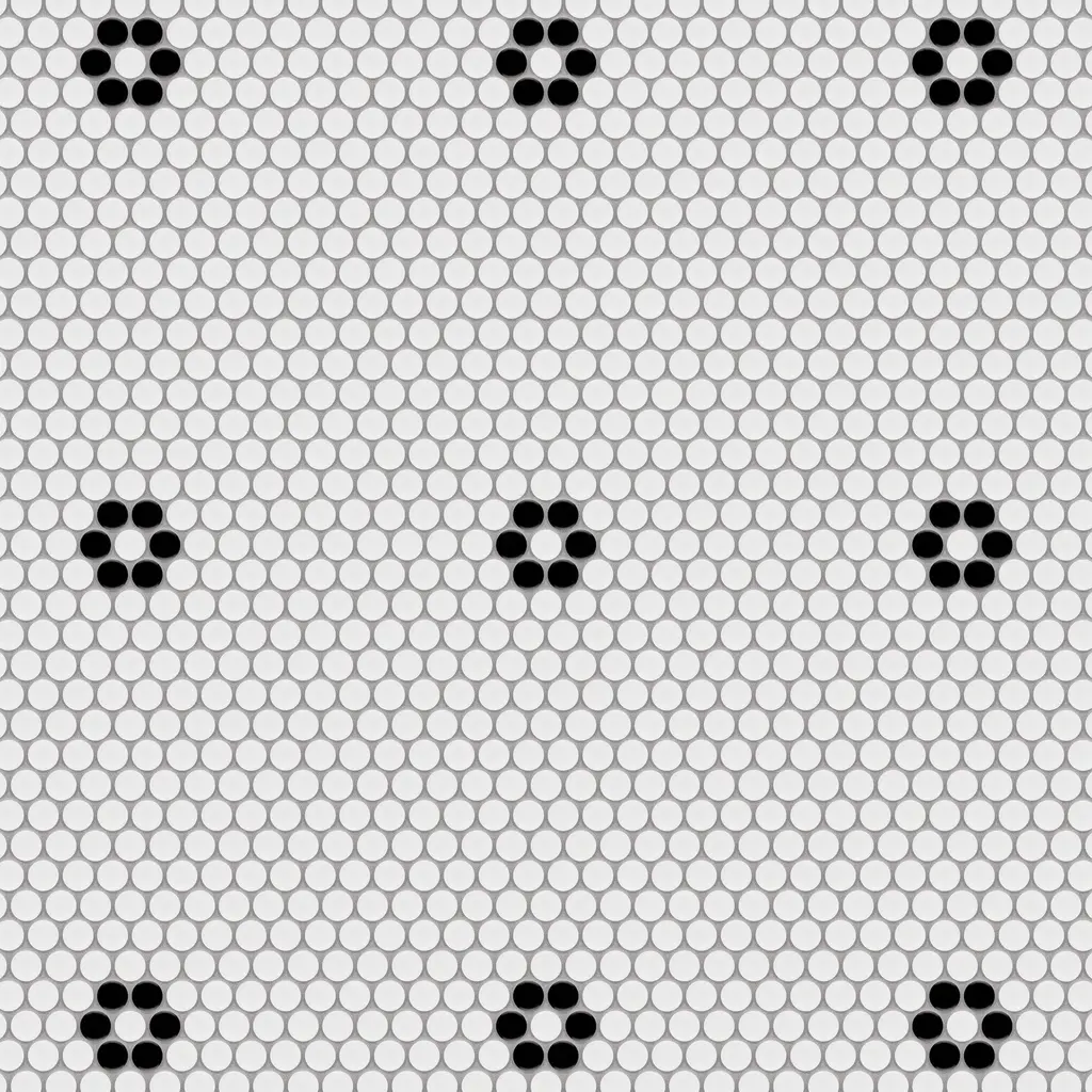 Transform your space into a tribute to retro design with our Metro Penny Matte White with Black Flower Porcelain Floor and Wall Mosaic Tile. As a modern deviation from the classic mosaic, this fresh option is a throwback to traditional retro design with a contemporary feel. Matte white penny rounds are accented by contrasting matte black penny rounds arranged into the shape of a flower on an interlocking mesh to create a seamless installation. This minimalistic geometric porcelain mosaic is unique yet simplistic enough to integrate into any design, ranging from traditional style renovations to modern home projects. Its impervious and frost resistant features make this an ideal tile for both residential indoor and outdoor use, including backsplashes, bathrooms, and kitchens. Tile is the better choice for your space. This tile is made from natural ingredients, making it a healthy choice as it is free from allergens, VOCs, formaldehyde and PVC. 8.0 square feet, 10 pieces per case. Case weight is 14.8 lbs. Grade 1, first-quality porcelain tile for floor and wall use 9.75 in. width x 11.5 in. length x 0.21 in. thick mesh-mounted mosaic Glazed, slightly textured finish with a low sheen and uniform appearance in tone PEI Rating II is suitable for all interior walls and light foot traffic such as powder rooms Impervious tiles have a water absorption of less than 0.5% for indoor and outdoor use and are frost resistant This tile has a COF wet rating less than or equal to 0.50 and is considered to have a marginally low skid resistance. This tile is not ADA approved for slip resistance. Completely frost resistant for indoor or outdoor applications; use a latex-modified thinset for acceptable bond strength Please note: A sample of this product may be a partial piece cut from the full size tile in order to provide an affordable and convenient way for customers to judge the quality and finish of this item. Samples are not returnable.