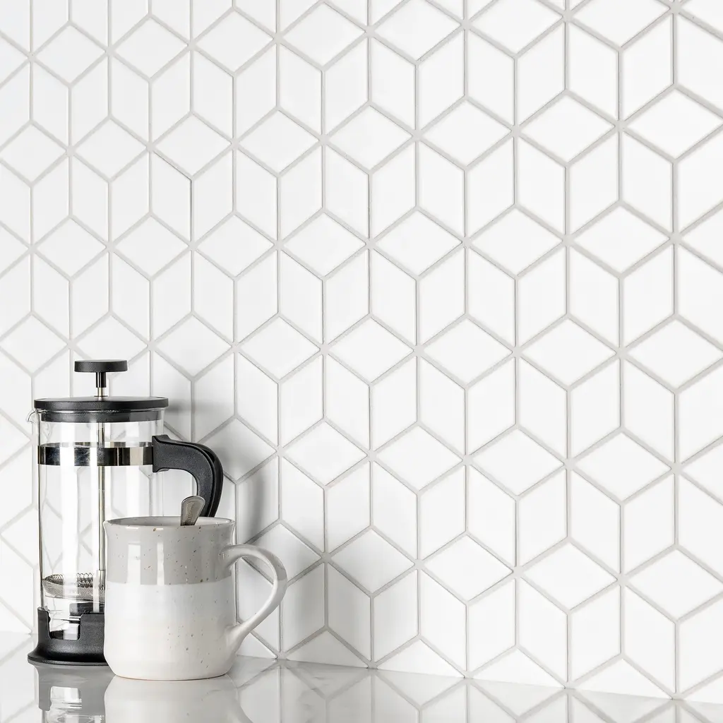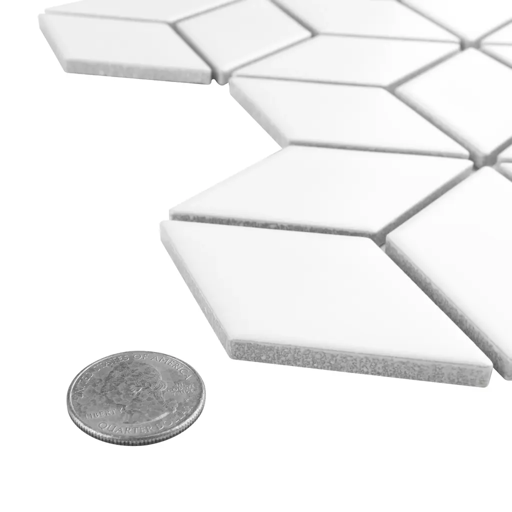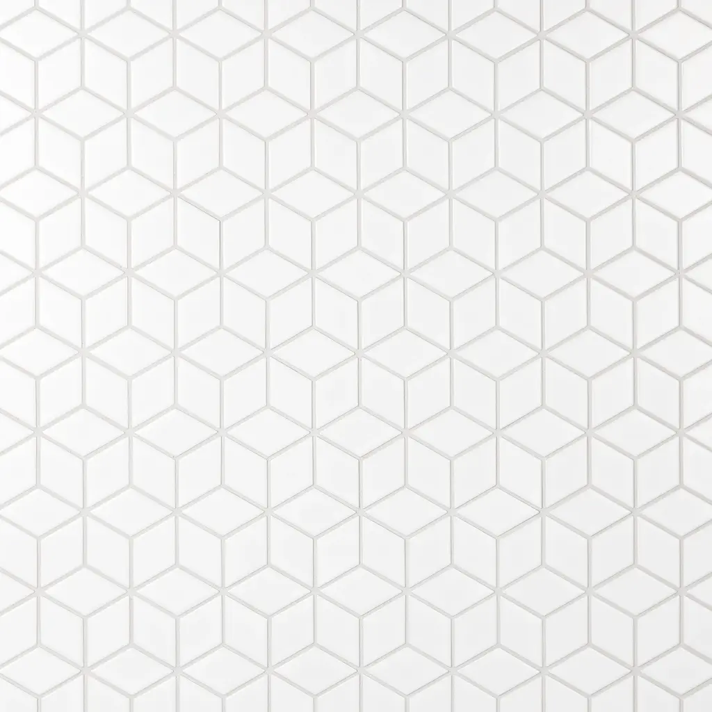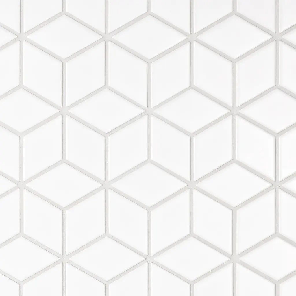 Offering a mosaic look, our Metro Rhombus Matte White Porcelain Floor and Wall Tile features a smooth, matte finish, providing decorative appeal that adapts to a variety of stylistic contexts. With its impervious, frost-resistant features, this white rhombus mosaic is an ideal selection for both indoor and outdoor residential installations, including bathrooms, backsplashes, showers, hallways and fireplace facades. This tile is a perfect choice on its own or paired with other products in the Metro Collection. Tile is the better choice for your space! 9.0 square feet, 10 pieces per case. Case weight is 21 lbs. Grade 1, first-quality porcelain tile for floor and wall use 10.5 in. width x 12.13 in. length x 0.25 in. thick mesh-mounted mosaic Glazed, smooth finish with a low sheen and uniform appearance in tone PEI Rating II is suitable for all interior walls and light foot traffic such as powder rooms Impervious tiles have a water absorption of less than 0.5% for indoor and outdoor use and are frost resistant This tile is not ADA approved for slip resistance with a DCOF value less than 0.42. Completely frost resistant for indoor or outdoor applications; use a latex-modified thinset for acceptable bond strength Please note: A sample of this product may be a partial piece cut from the full size tile in order to provide an affordable and convenient way for customers to judge the quality and finish of this item. Samples are not returnable.