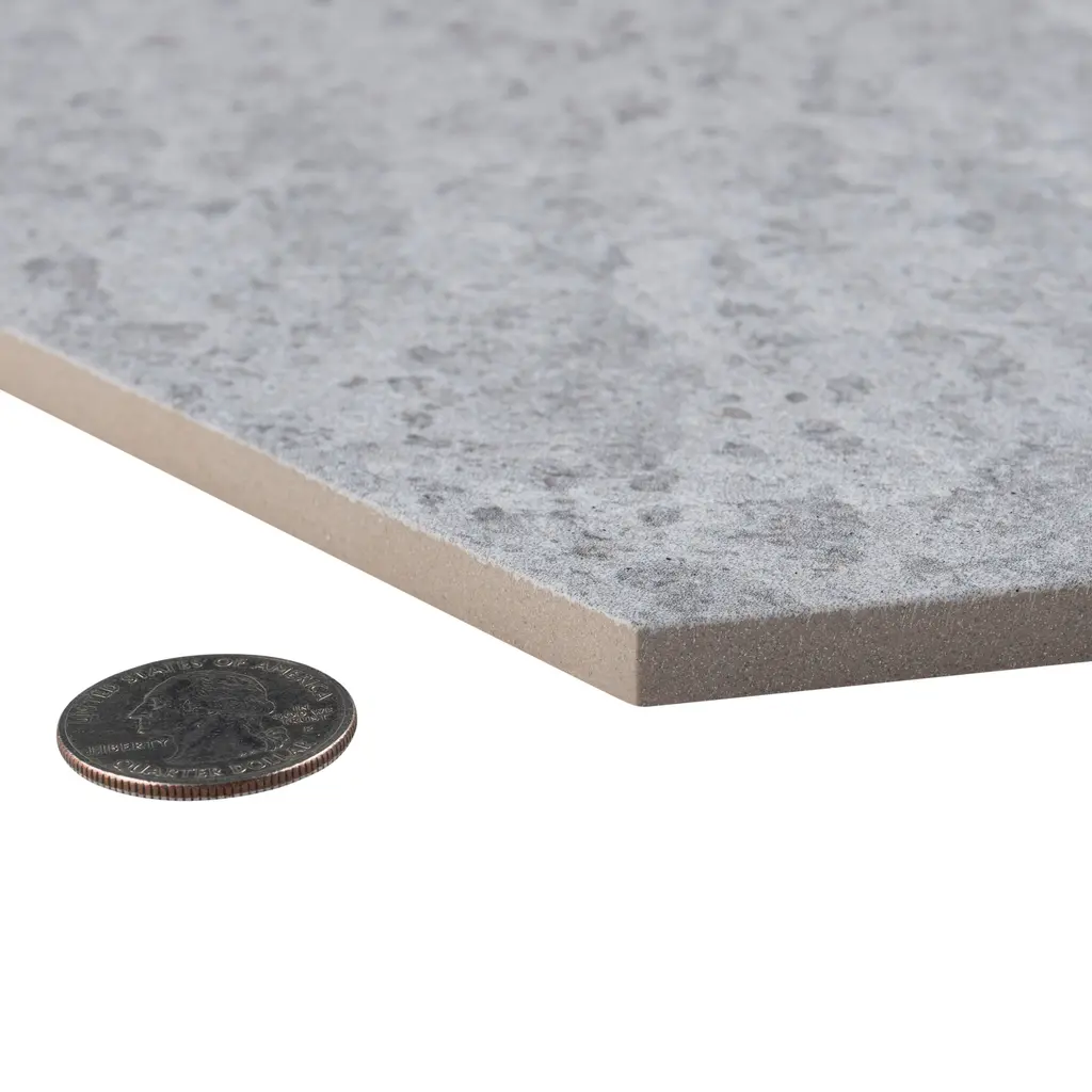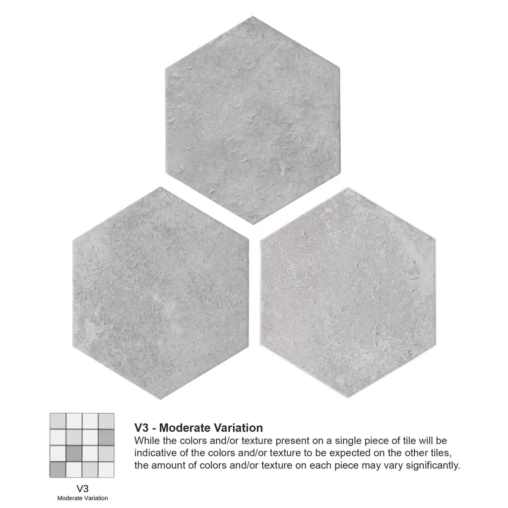 Modeling a stone look, our Nagpur Grand Hex Perla Porcelain Floor and Wall Tile features a slightly textured, matte finish, providing decorative appeal that adapts to a variety of stylistic contexts. Containing 16 different print variations that are randomly distributed throughout each case, this gray hexagon tile offers a one-of-a-kind look. With its impervious, frost-resistant features, this tile is an ideal selection for a variety of spaces including indoor and outdoor commercial and residential installations, kitchens, bathrooms, backsplashes, showers, hallways, entryways, patios, pools and fireplace facades. This tile is a perfect choice on its own or with other products in the Merola Tile, Nagpur Collection. To ensure optimal results, please consult with your installer and review the product specifications to confirm that this tile meets the specific needs of your project.