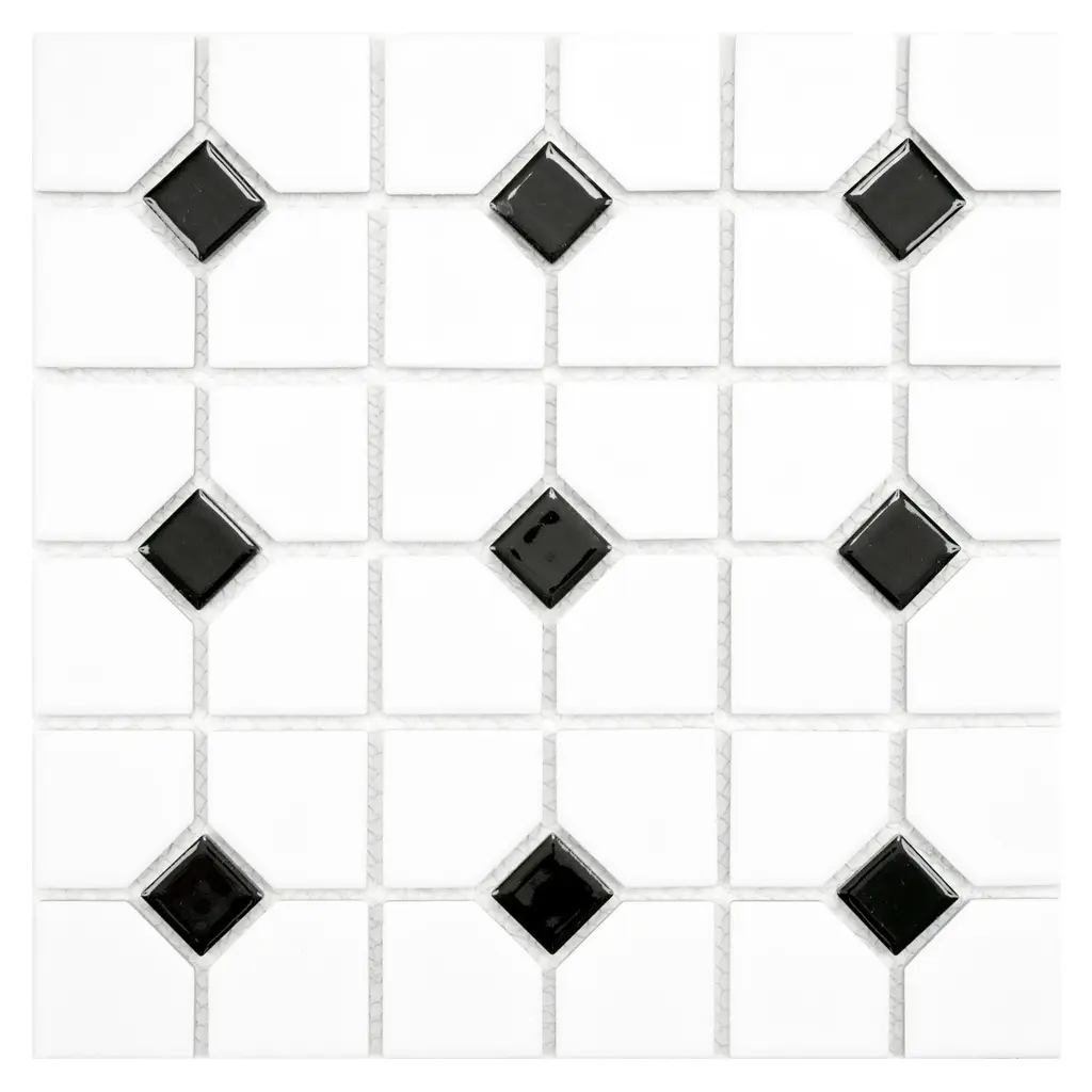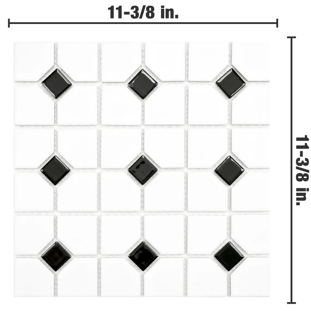 Offering a mosaic look, our Oxford Matte White with Black Dot Porcelain Floor and Wall Tile features a mixed textured finish, providing decorative appeal that adapts to a variety of stylistic contexts. With its impervious, frost-resistant features, this mosaic is an ideal selection for both indoor and outdoor residential installations, including kitchens, bathrooms, backsplashes, showers, hallways and fireplace facades. This tile is a perfect choice on its own or paired with other products in the Oxford Collection. Tile is the better choice for your space! 9.2 square feet, 10 pieces per case. Case weight is 19.16 lbs. Grade 1, first-quality porcelain tile for floor and wall use 11.38 in. width x 11.38 in. length x 0.23 in. thick mesh-mounted mosaic Glazed, mixed texture with a mixed finish and uniform appearance in tone PEI Rating III is suitable for medium-duty residential floors including kitchens, halls, corridors, balconies, terraces and areas used more often with normal footwear and small amounts of dirt Impervious tiles have a water absorption of less than 0.5% for indoor and outdoor use and are frost resistant This tile has a COF wet rating greater than 0.60 to 0.79 which is considered skid resistant for indoor and outdoor use. This tile is ADA approved for slip resistance. Completely frost resistant for indoor or outdoor applications; use a latex-modified thinset for acceptable bond strength Please note: A sample of this product may be a partial piece cut from the full size tile in order to provide an affordable and convenient way for customers to judge the quality and finish of this item. Samples are not returnable.