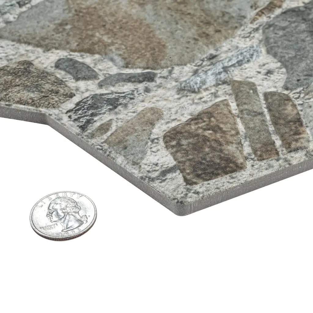 Modeling a stone look, our Rambla Natural Porcelain Floor and Wall Tile features a slightly textured, matte finish, providing decorative appeal that adapts to a variety of stylistic contexts. Containing 4 different print variations that are randomly distributed throughout each case, this gray rectangle tile offers a one-of-a-kind look. With its impervious, frost-resistant features, this tile is an ideal selection for a variety of spaces including indoor and outdoor residential installations, kitchens, bathrooms, backsplashes, showers, hallways and fireplace facades. Discover more products from the Merola Tile Rambla Collection to complete your design. To ensure optimal results, please consult with your installer and review the product specifications to confirm that this tile meets the specific needs of your project. 14.04 square feet, 6 pieces per case. Case weight is 54.95 lbs. Grade 1, first-quality porcelain tile for floor and wall use 14.63 in. width x 22.75 in. length x 0.39 in. thick Glazed, slightly textured finish with a low sheen and moderate variation in tone PEI Rating III is suitable for medium-duty residential floors including kitchens, halls, corridors, balconies, terraces and areas used more often with normal footwear and small amounts of dirt Impervious tiles have a water absorption of less than 0.5% for indoor and outdoor use and are frost resistant This tile is ADA approved for slip resistance with a DCOF value of 0.42 or higher. Completely frost resistant for indoor or outdoor applications; use a latex-modified thinset for acceptable bond strength Please note: A sample of this product may be a partial piece cut from the full size tile in order to provide an affordable and convenient way for customers to judge the quality and finish of this item. Samples are not returnable.