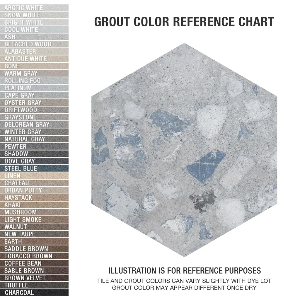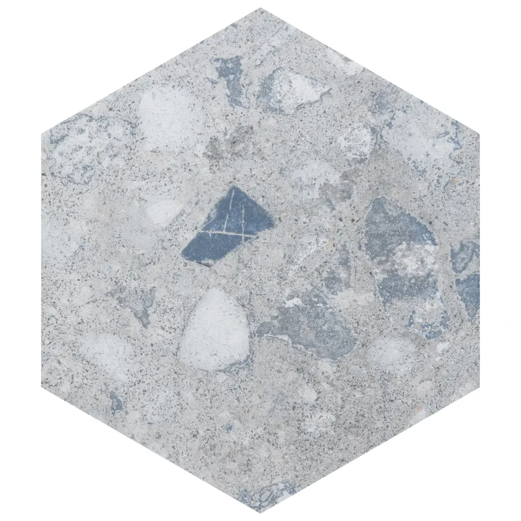 Replicating a terrazzo look, our Recycle Hex River Blue Porcelain Floor and Wall Tile features a medium textured, mixed finish, providing decorative appeal that adapts to a variety of stylistic contexts. Containing 36 different print variations that are randomly distributed throughout each case, this gray hexagon tile offers a one-of-a-kind look. With its impervious, frost-resistant features, this tile is an ideal selection for both indoor and outdoor commercial and residential installations, including kitchens, bathrooms, backsplashes, showers, hallways, entryways, patios and fireplace facades. This tile is a perfect choice on its own or paired with other products in the Recycle Collection. Tile is the better choice for your space! 4.05 square feet, 9 pieces per case. Case weight is 18.63 lbs. Grade 1, first-quality porcelain tile for floor and wall use 8.5 in. width x 9.88 in. length x 0.39 in. thick Glazed, medium textured finish with a mixed finish and moderate variation in tone PEI Rating IV has high resistance to abrasion and is suitable for heavy-duty residential and commercial kitchens, hotels, exhibition and sales rooms with some dirt conditions Impervious tiles have a water absorption of less than 0.5% for indoor and outdoor use and are frost resistant This tile is ADA approved for slip resistance with a DCOF value of 0.42 or higher. Completely frost resistant for indoor or outdoor applications; use a latex-modified thinset for acceptable bond strength Please note: A sample of this product may be a partial piece cut from the full size tile in order to provide an affordable and convenient way for customers to judge the quality and finish of this item. Samples are not returnable.