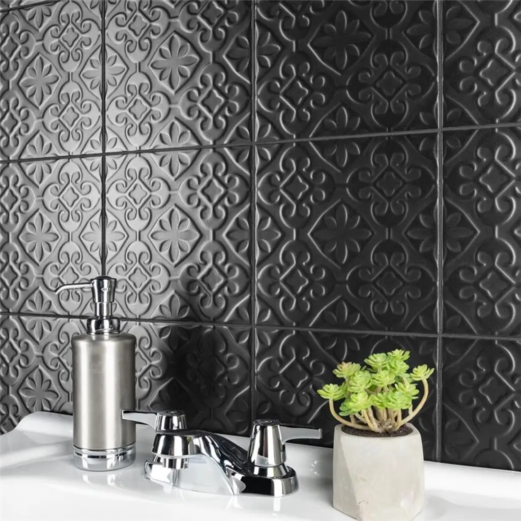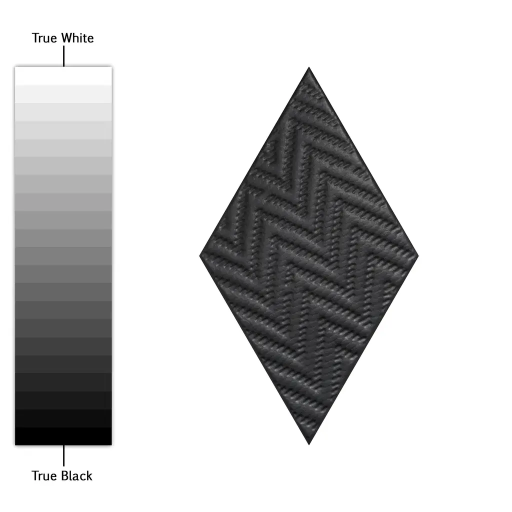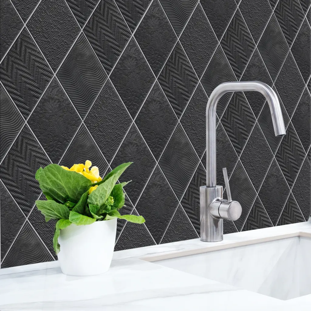 Capturing the appearance of a patterned look, our Rhombus Black Porcelain Floor and Wall Tile features a smooth, satin finish, providing decorative appeal that adapts to a variety of stylistic contexts. With its impervious, frost-resistant features, this black rhombus tile is an ideal selection for both indoor and outdoor residential installations, including kitchens, bathrooms, backsplashes, showers, hallways and fireplace facades. This tile is a perfect choice on its own or paired with other products in the Rhombus Collection. Tile is the better choice for your space! 11.4 square feet, 60 pieces per case. Case weight is 42.04 lbs. Grade 1, first-quality porcelain tile for floor and wall use 5.5 in. width x 9.5 in. length x 0.33 in. thick Glazed, smooth finish with a medium sheen and slight variation in tone PEI Rating III is suitable for medium-duty residential floors including kitchens, halls, corridors, balconies, terraces and areas used more often with normal footwear and small amounts of dirt Impervious tiles have a water absorption of less than 0.5% for indoor and outdoor use and are frost resistant This tile is ADA approved for slip resistance with a DCOF value of 0.42 or higher. Completely frost resistant for indoor or outdoor applications; use a latex-modified thinset for acceptable bond strength Please note: A sample of this product may be a partial piece cut from the full size tile in order to provide an affordable and convenient way for customers to judge the quality and finish of this item. Samples are not returnable.