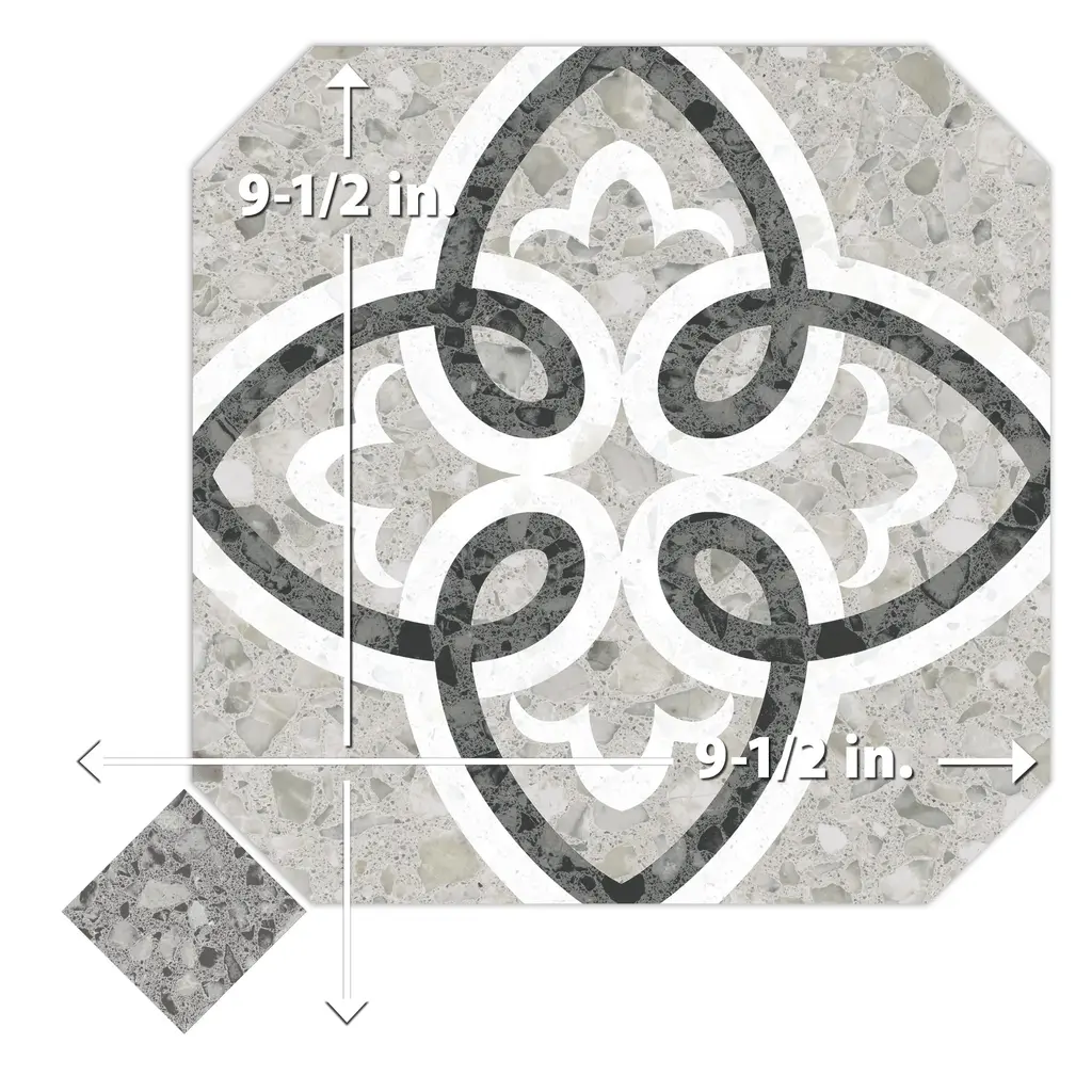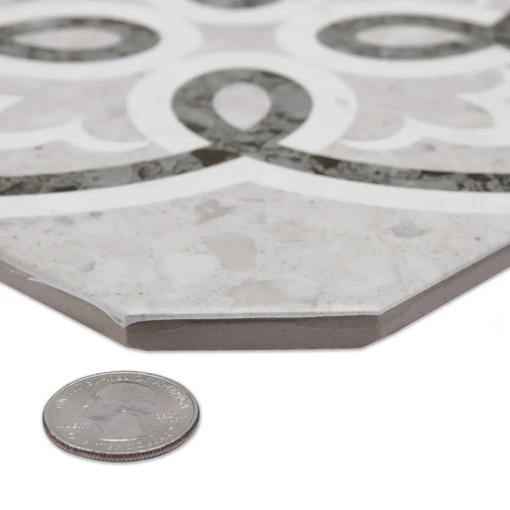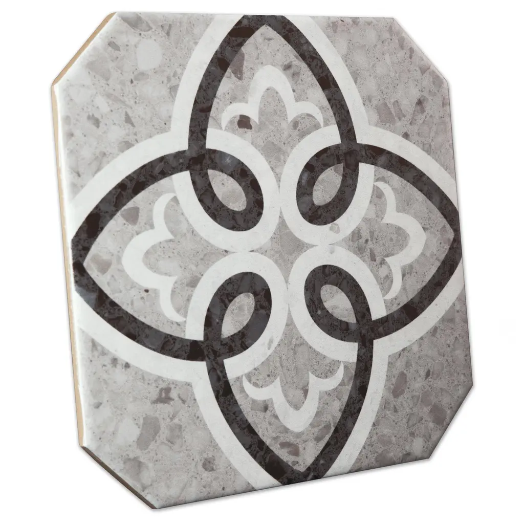 Replicating a terrazzo look, our Riviera Octagon Garde Gris with Taco Nero Porcelain Floor and Wall Tile features a slightly textured, matte finish, providing decorative appeal that adapts to a variety of stylistic contexts. Containing 30 different print variations that are randomly distributed throughout each case, this gray specialty tile offers a one-of-a-kind look. With its impervious, frost-resistant features, this tile is an ideal selection for a variety of spaces including indoor and outdoor residential installations, kitchens, bathrooms, backsplashes, showers, hallways, pools and fireplace facades. This tile is a perfect choice on its own or with other products in the Merola Tile, Riviera Collection. To ensure optimal results, please consult with your installer and review the product specifications to confirm that this tile meets the specific needs of your project.