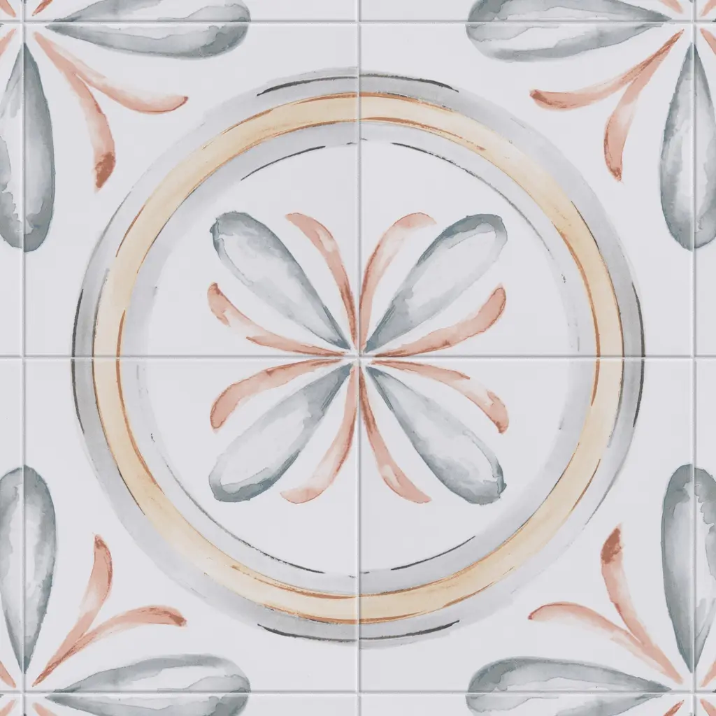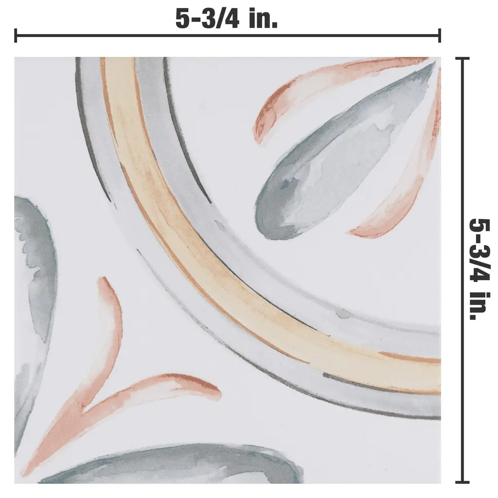 Inspired by traditional hand-painted Mediterranean tiles, our Saint Germain Chaud Deco Rivette Porcelain Floor and Wall Tile offers vibrant artisanal beauty. This tile features old-world floral patterns in sage green, ochre orange and grey watercolor inspired tones that are set amongst an off-white base glaze. Richly detailed with a smooth, matte finish, this on-trend porcelain tile offers charming decorative appeal that can blend into virtually any design theme, ranging from contemporary projects to traditional installations. Its impervious, frost-resistant, and durable features make this an ideal choice for both commercial and residentials indoor and outdoor installations including kitchens, bathrooms, backsplashes, showers, entryways, and patios. This tile is a perfect choice on its own or coordinated with other products in the Saint Germain series. Tile is the better choice for your space. This tile is made from natural ingredients, making it a healthy choice as it is free from allergens, VOCs, formaldehyde, and PVC. 10.56 square feet, 44 pieces per case. Case weight is 37.25 lbs. Grade 1, first-quality porcelain tile for floor and wall use 5.75 in. width x 5.75 in. length x 0.33 in. thick Glazed, smooth finish with a low sheen and slight variation in tone PEI Rating IV has high resistance to abrasion and is suitable for heavy-duty residential and commercial kitchens, hotels, exhibition and sales rooms with some dirt conditions Impervious tiles have a water absorption of less than 0.5% for indoor and outdoor use and are frost resistant This tile is not ADA approved for slip resistance. Completely frost resistant for indoor or outdoor applications; use a latex-modified thinset for acceptable bond strength Please note: A sample of this product may be a partial piece cut from the full size tile in order to provide an affordable and convenient way for customers to judge the quality and finish of this item. Samples are not returnable.