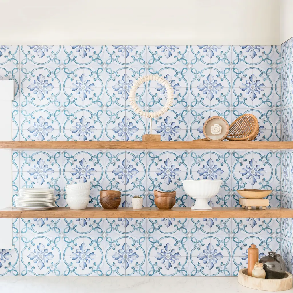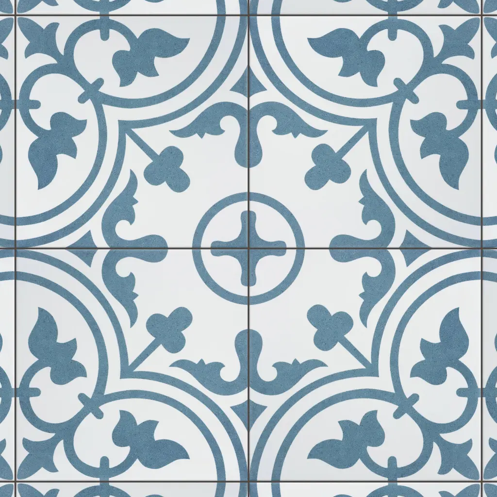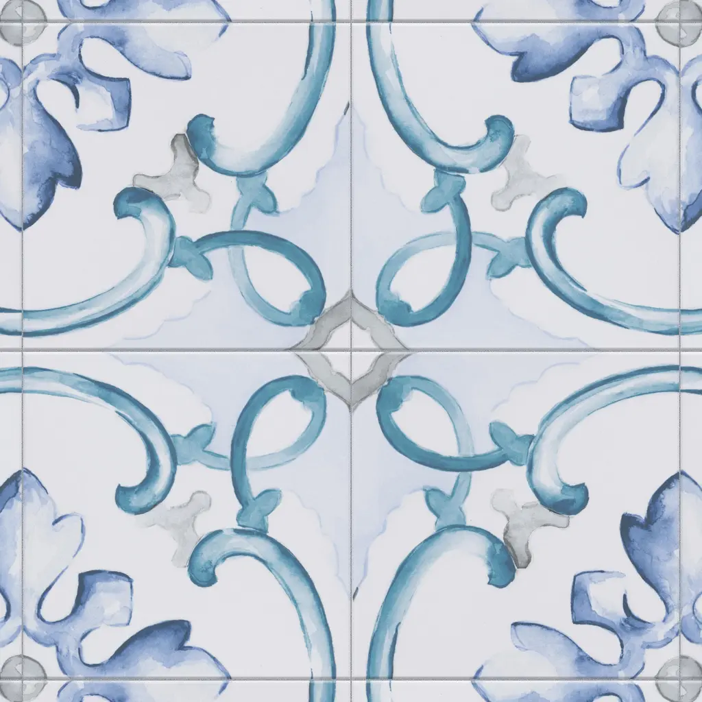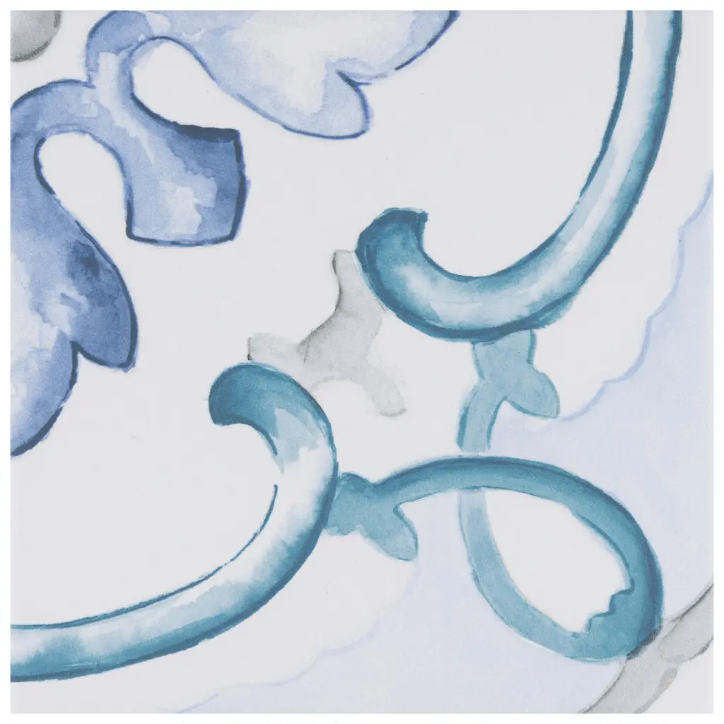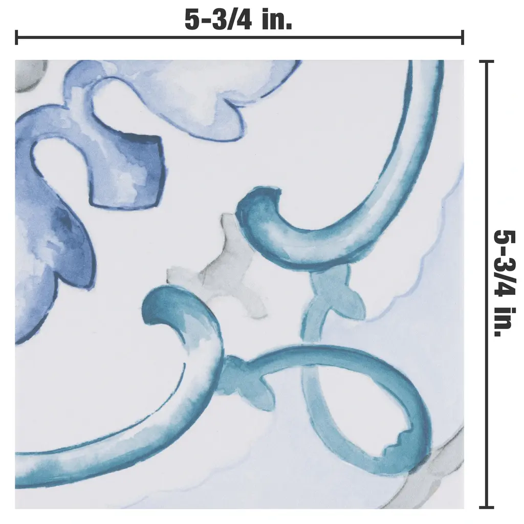 Inspired by traditional hand-painted Mediterranean tiles, our Saint Germain Gele Deco Jules Porcelain Floor and Wall Tile offers vibrant artisanal beauty. This tile features old-world floral patterns in teal, denim blue and grey watercolor inspired tones that are set amongst an off-white base glaze. Richly detailed with a smooth, matte finish, this on-trend porcelain tile offers charming decorative appeal that can blend into virtually any design theme, ranging from contemporary projects to traditional installations. Its impervious, frost-resistant, and durable features make this an ideal choice for both commercial and residentials indoor and outdoor installations including kitchens, bathrooms, backsplashes, showers, entryways, and patios. This tile is a perfect choice on its own or coordinated with other products in the Saint Germain series. Tile is the better choice for your space. This tile is made from natural ingredients, making it a healthy choice as it is free from allergens, VOCs, formaldehyde, and PVC. 10.56 square feet, 44 pieces per case. Case weight is 37.25 lbs. Grade 1, first-quality porcelain tile for floor and wall use 5.75 in. width x 5.75 in. length x 0.33 in. thick Glazed, smooth finish with a low sheen and slight variation in tone PEI Rating IV has high resistance to abrasion and is suitable for heavy-duty residential and commercial kitchens, hotels, exhibition and sales rooms with some dirt conditions Impervious tiles have a water absorption of less than 0.5% for indoor and outdoor use and are frost resistant This tile is not ADA approved for slip resistance. Completely frost resistant for indoor or outdoor applications; use a latex-modified thinset for acceptable bond strength Please note: A sample of this product may be a partial piece cut from the full size tile in order to provide an affordable and convenient way for customers to judge the quality and finish of this item. Samples are not returnable.
