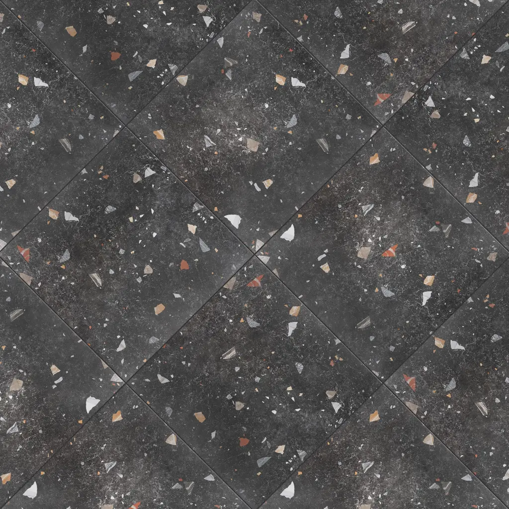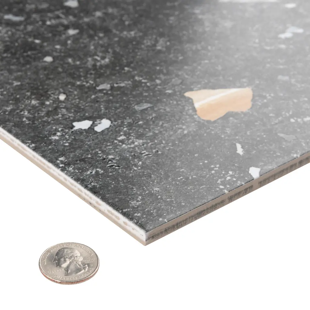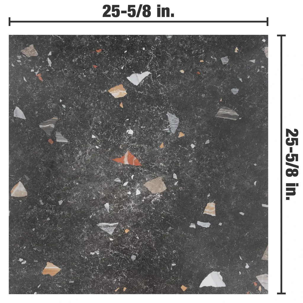 Replicating a terrazzo look, our Sonar Black Porcelain Floor and Wall Tile features a mixed textured finish, providing decorative appeal that adapts to a variety of stylistic contexts. Containing 28 different print variations that are randomly distributed throughout each case, this black square tile offers a one-of-a-kind look. With its impervious, frost-resistant features, this tile is an ideal selection for both indoor and outdoor residential installations, including kitchens, bathrooms, backsplashes, showers, hallways and fireplace facades. This tile is a perfect choice on its own or paired with other products in the Sonar Collection. Tile is the better choice for your space! 13.83 square feet, 3 pieces per case. Case weight is 62.15 lbs. Grade 1, first-quality porcelain tile for floor and wall use 25.63 in. width x 25.63 in. length x 0.38 in. thick Glazed, mixed texture with a mixed finish and moderate variation in tone PEI Rating III is suitable for medium-duty residential floors including kitchens, halls, corridors, balconies, terraces and areas used more often with normal footwear and small amounts of dirt Impervious tiles have a water absorption of less than 0.5% for indoor and outdoor use and are frost resistant This tile is ADA approved for slip resistance with a DCOF value of 0.42 or higher. Completely frost resistant for indoor or outdoor applications; use a latex-modified thinset for acceptable bond strength Please note: A sample of this product may be a partial piece cut from the full size tile in order to provide an affordable and convenient way for customers to judge the quality and finish of this item. Samples are not returnable.
