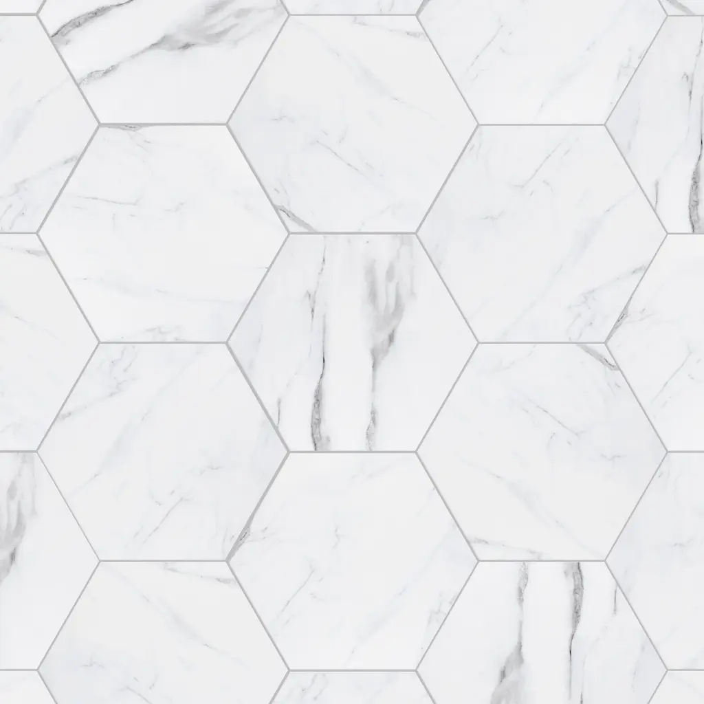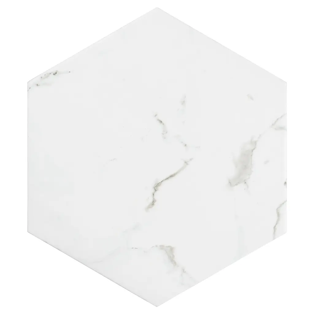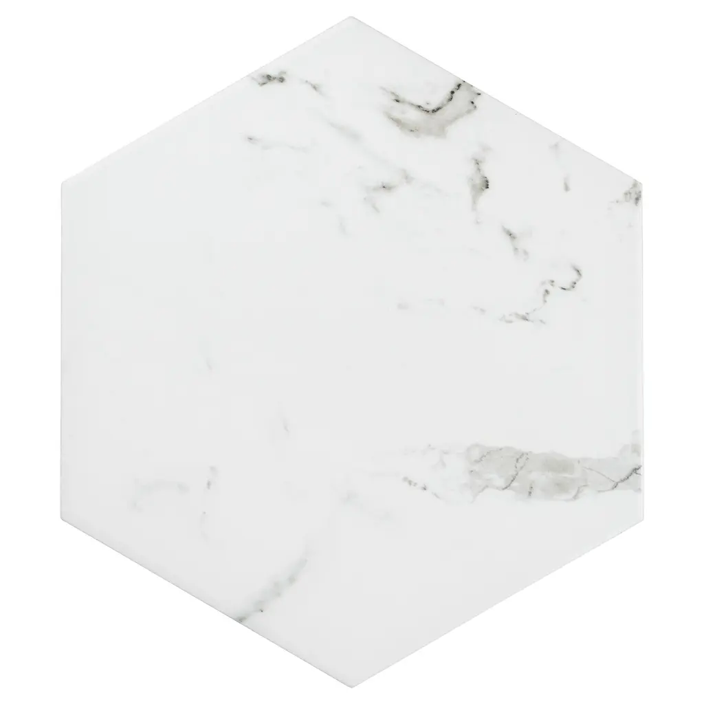 Capturing the appearance of a marble look, our Timeless Calacatta Hex Porcelain Floor and Wall Tile features a smooth, matte finish, providing decorative appeal that adapts to a variety of stylistic contexts. Containing 47 different print variations that are randomly distributed throughout each case, this white hexagon tile offers a one-of-a-kind look. With its impervious, frost-resistant features, this tile is an ideal selection for a variety of spaces including indoor and outdoor commercial and residential installations, kitchens, bathrooms, backsplashes, showers, hallways, entryways, patios, pools and fireplace facades. This tile is a perfect choice on its own or with other products in the Merola Tile, Timeless Collection. To ensure optimal results, please consult with your installer and review the product specifications to confirm that this tile meets the specific needs of your project.